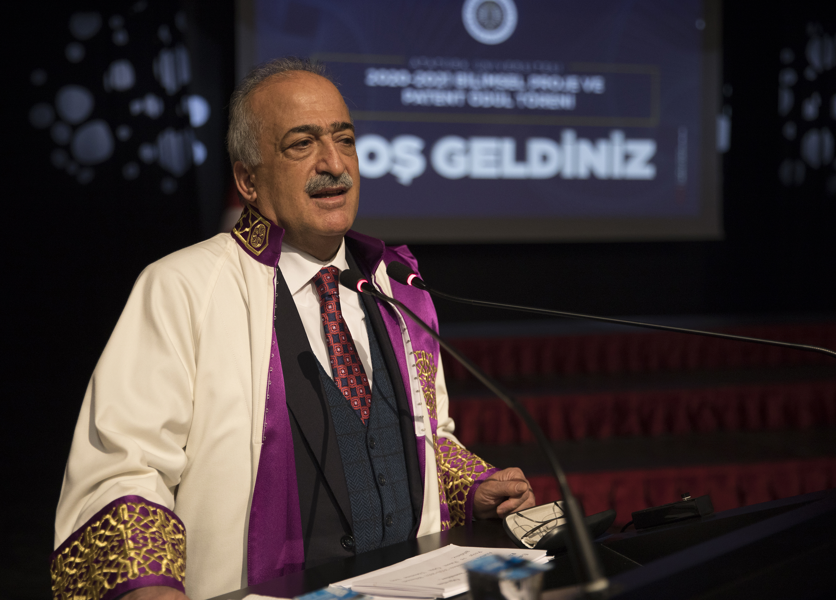 Bu duygu ve düşüncelerle; bilimsel teşvikin ödülle desteklendiği bu törende, 2020-2021 yılı içinde yürüttükleri projeler ve aldıkları patenlerle ödüle layık görülen Üniversitemizin kıymetli öğretim elemanlarını tebrik ediyor, başarılar diliyorum. Bilim insanlarımızın Üniversitemiz için bir gurur vesilesi olan bu çalışmalarının genç araştırmacılarımıza ve öğrencilerimize model teşkil etmesi, motivasyonlarını artıracak itici bir güç olmasını ümit ediyorum” ifadeleriyle konuşmasını tamamladı.