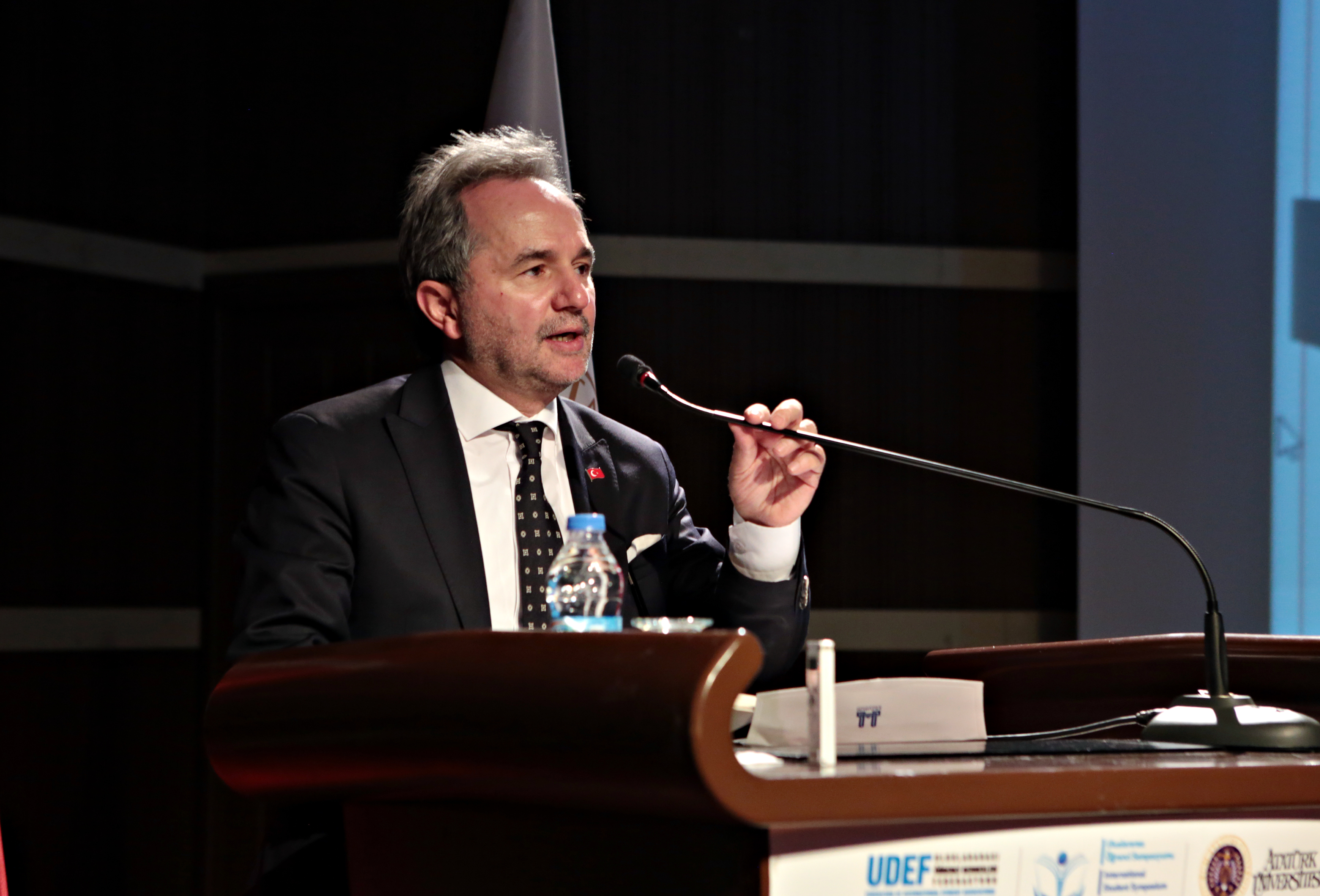 Uluslararası Öğrencilik Sempozyumunun 4.’sünü Atatürk Üniversitesinde gerçekleştirmekten mutluluk duyduğunu ifade eden UDEF Başkanı Dr. Mehmet Ali Bolat, Türkiye’deki uluslararası öğrenciler hakkında bilgi verdi. Bolat, ülkemizde dünyanın çeşitli coğrafyalarından gelen 143 bin uluslararası öğrencinin eğitim gördüğünü ifade ederek, geçtiğimiz 35 yılda ise ülkemize gelerek mezun olan uluslararası öğrenci Türkiye mezunu sayısının 150 bin olduğunu ve bu mezunların 160 ülkede Türkiye ile olan ilişkileri devam ettirdiklerini söyledi.
