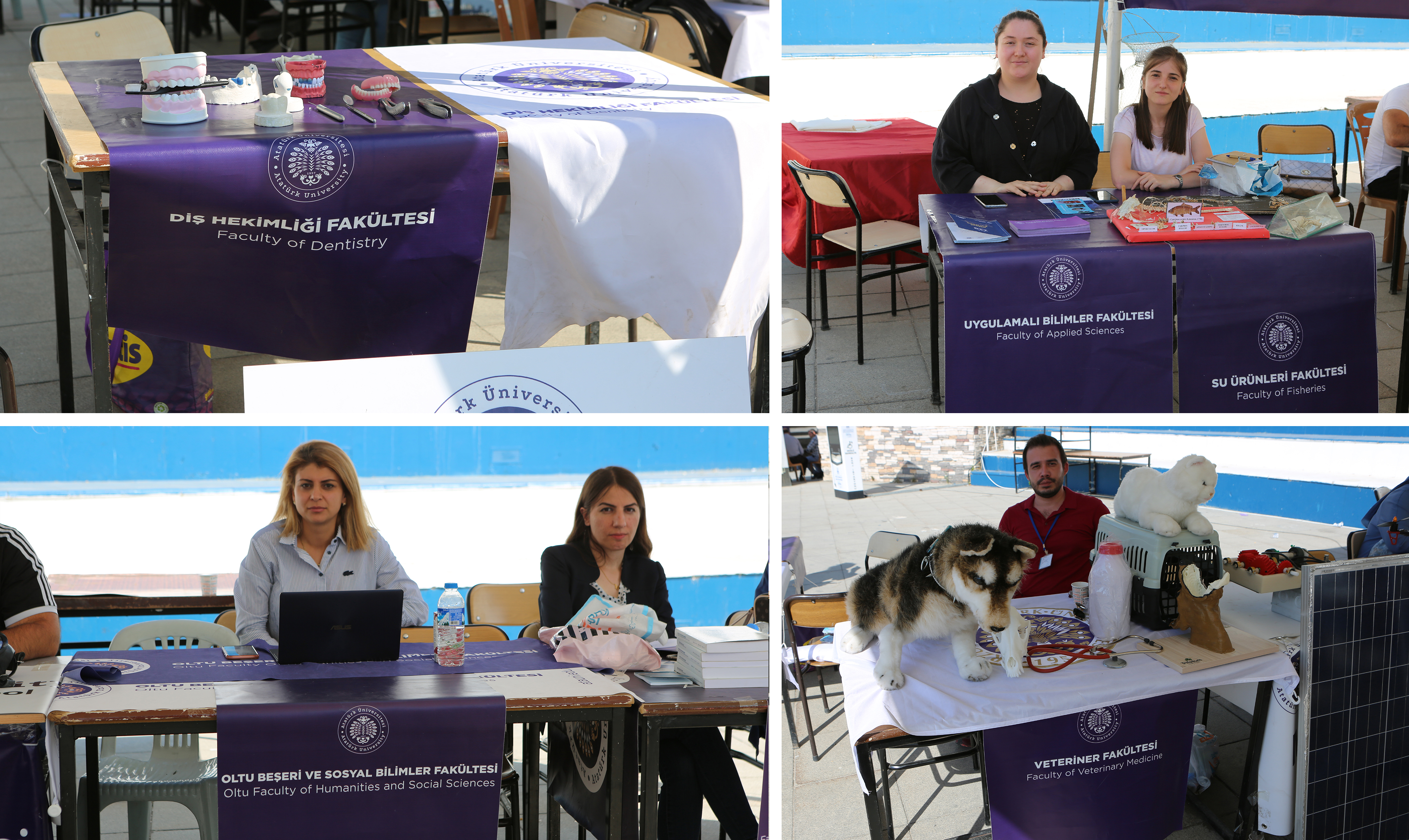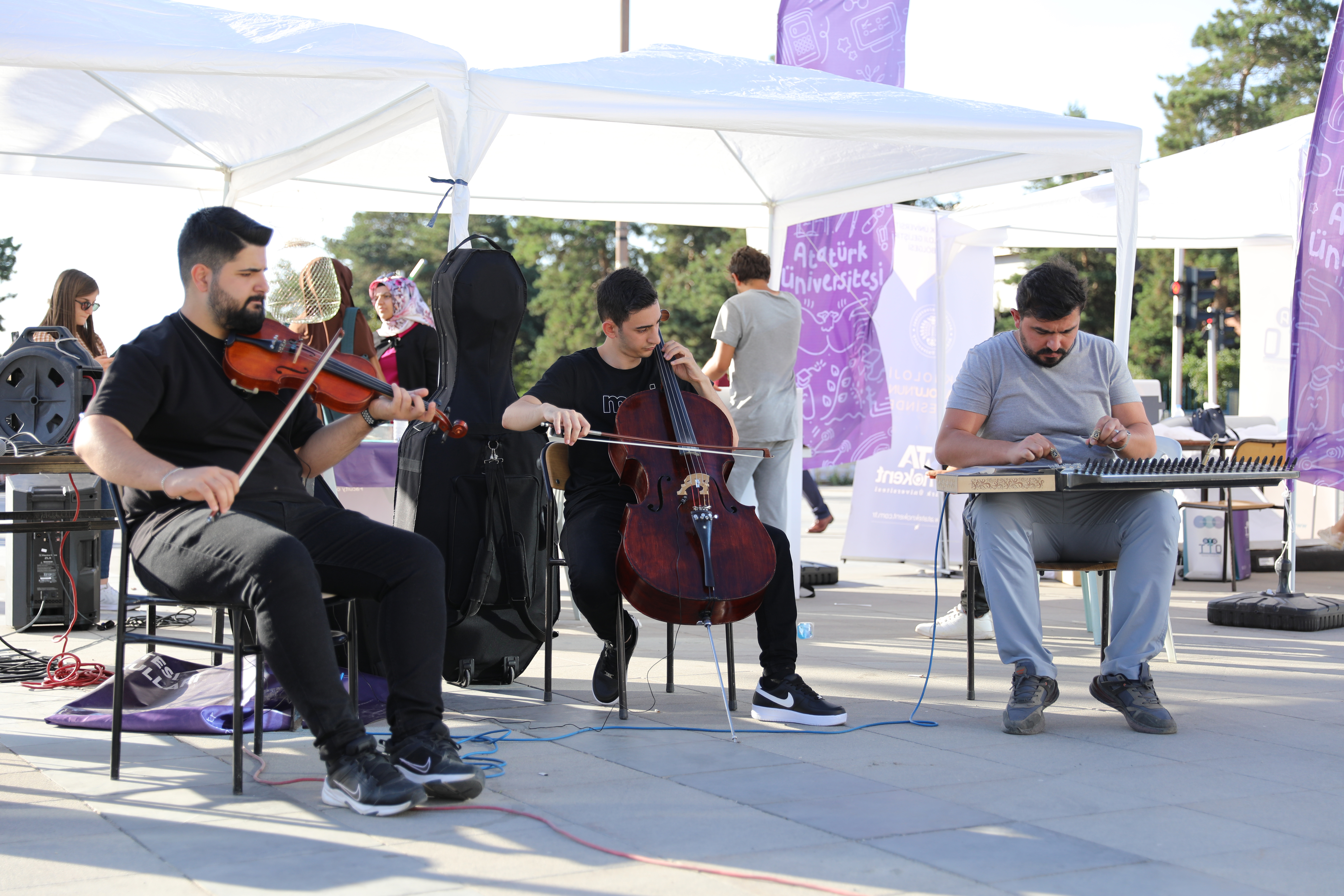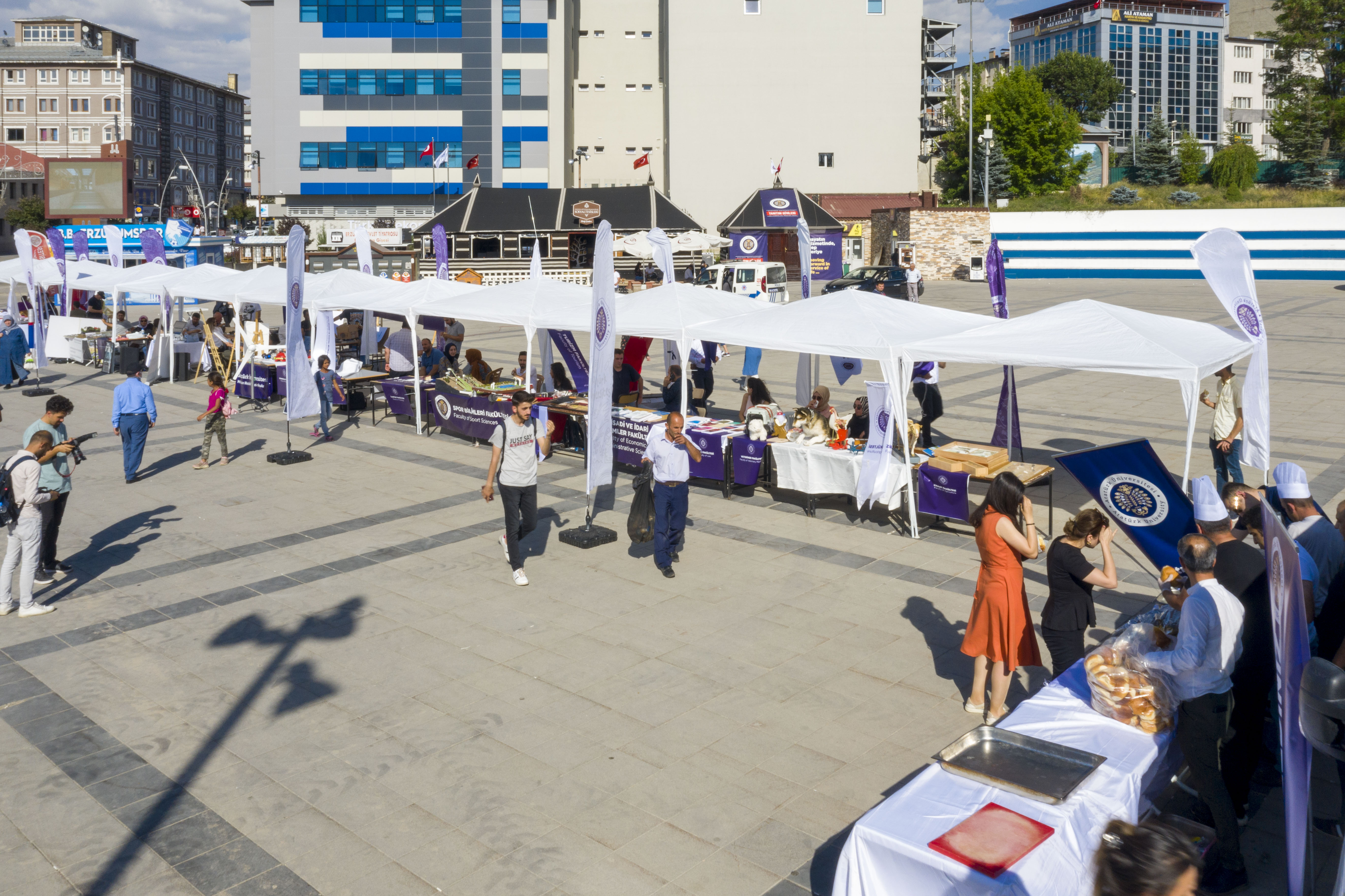 Öğrenci Dekanlığı tarafından Erzurum Havuzbaşı mevkiinde organize edilen tanıtım ve tercih günlerinde Atatürk Üniversitesi Su Ürünleri Fakültesi ve Sosyal Tesisleri tarafından balık ekmek ikram edilirken, Kazım Karabekir Eğitim Fakültesi Müzik Öğretmenliği Bölümü öğrencileri ise konuklara müzik dinletisi sunuyor.