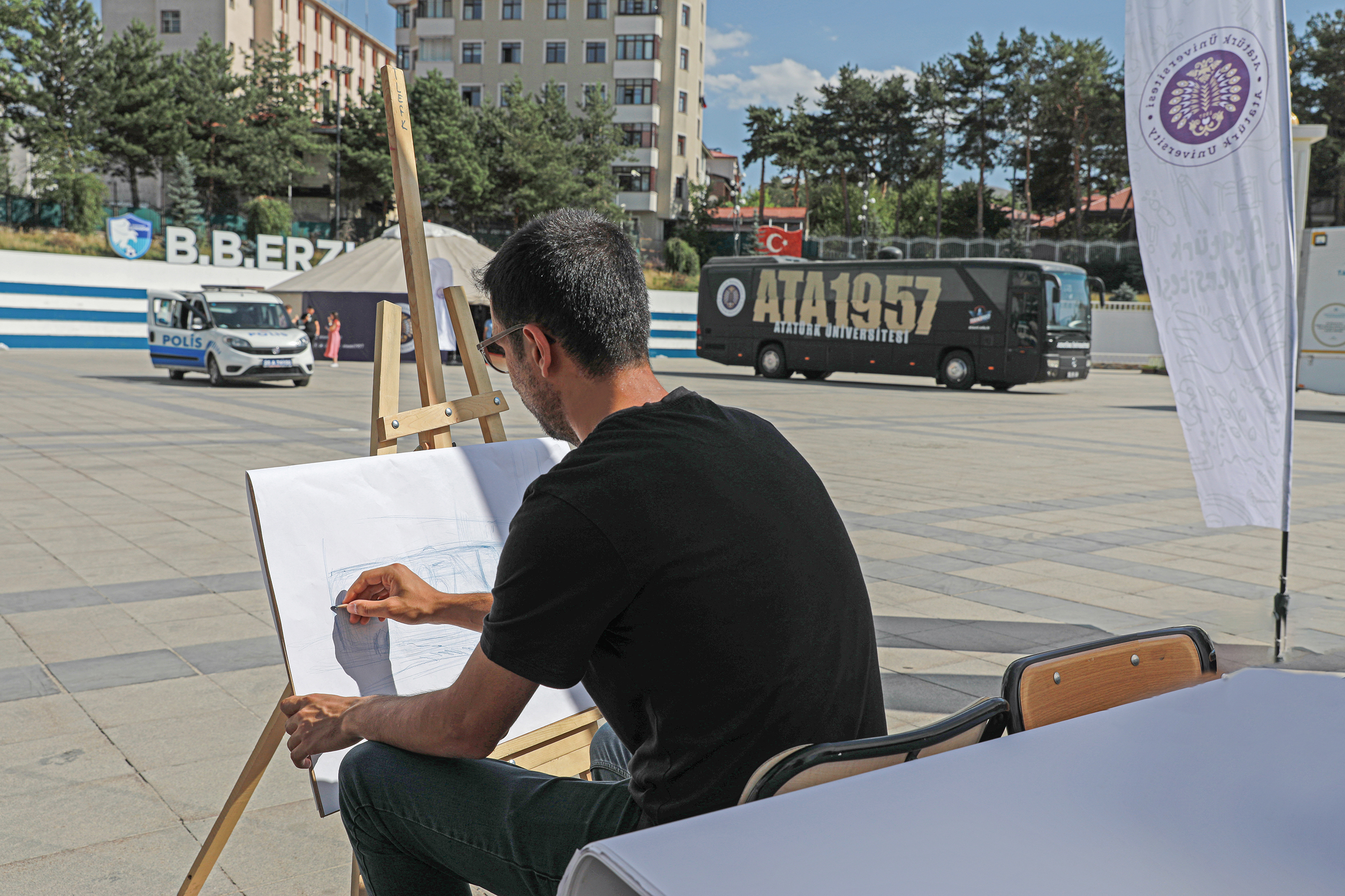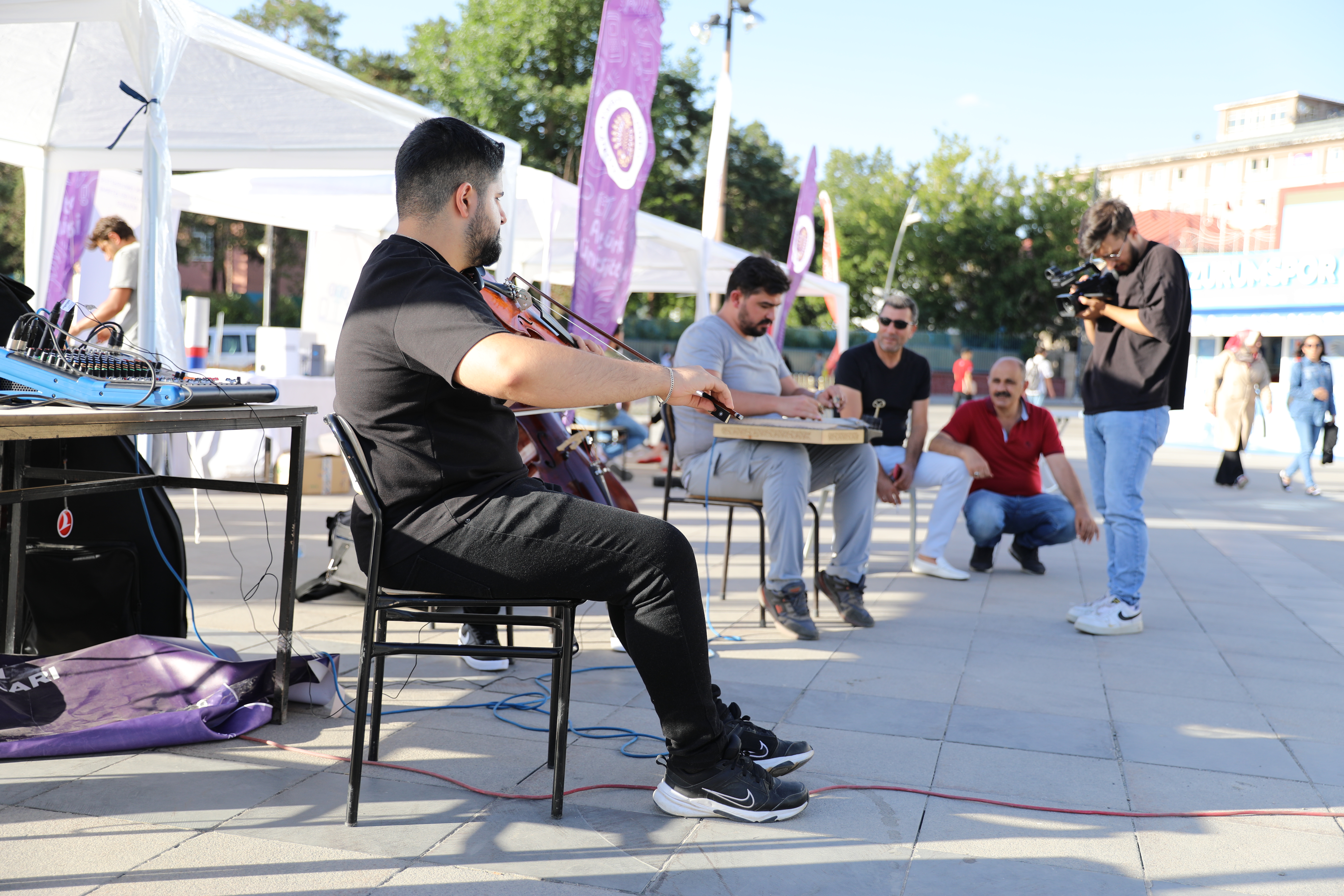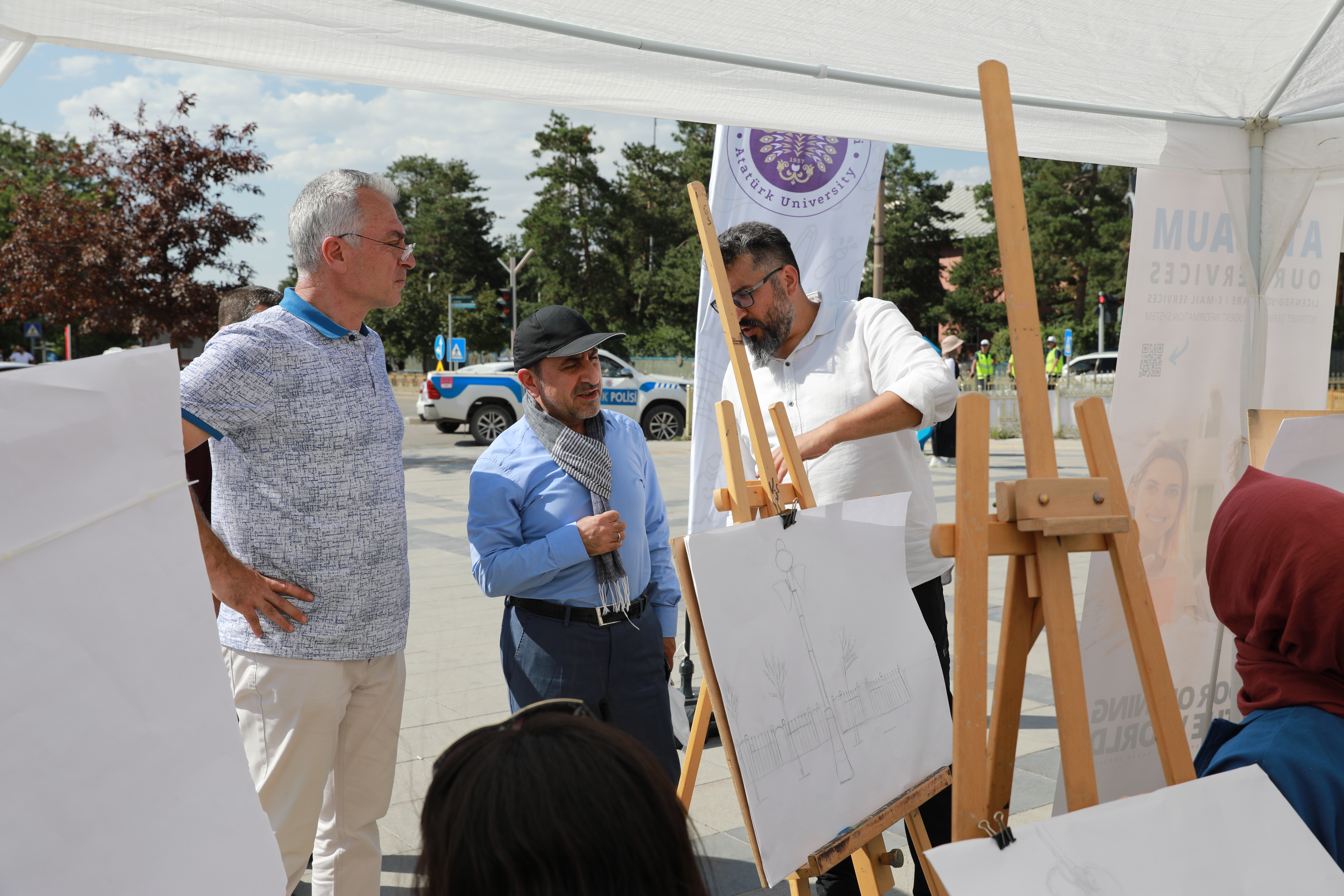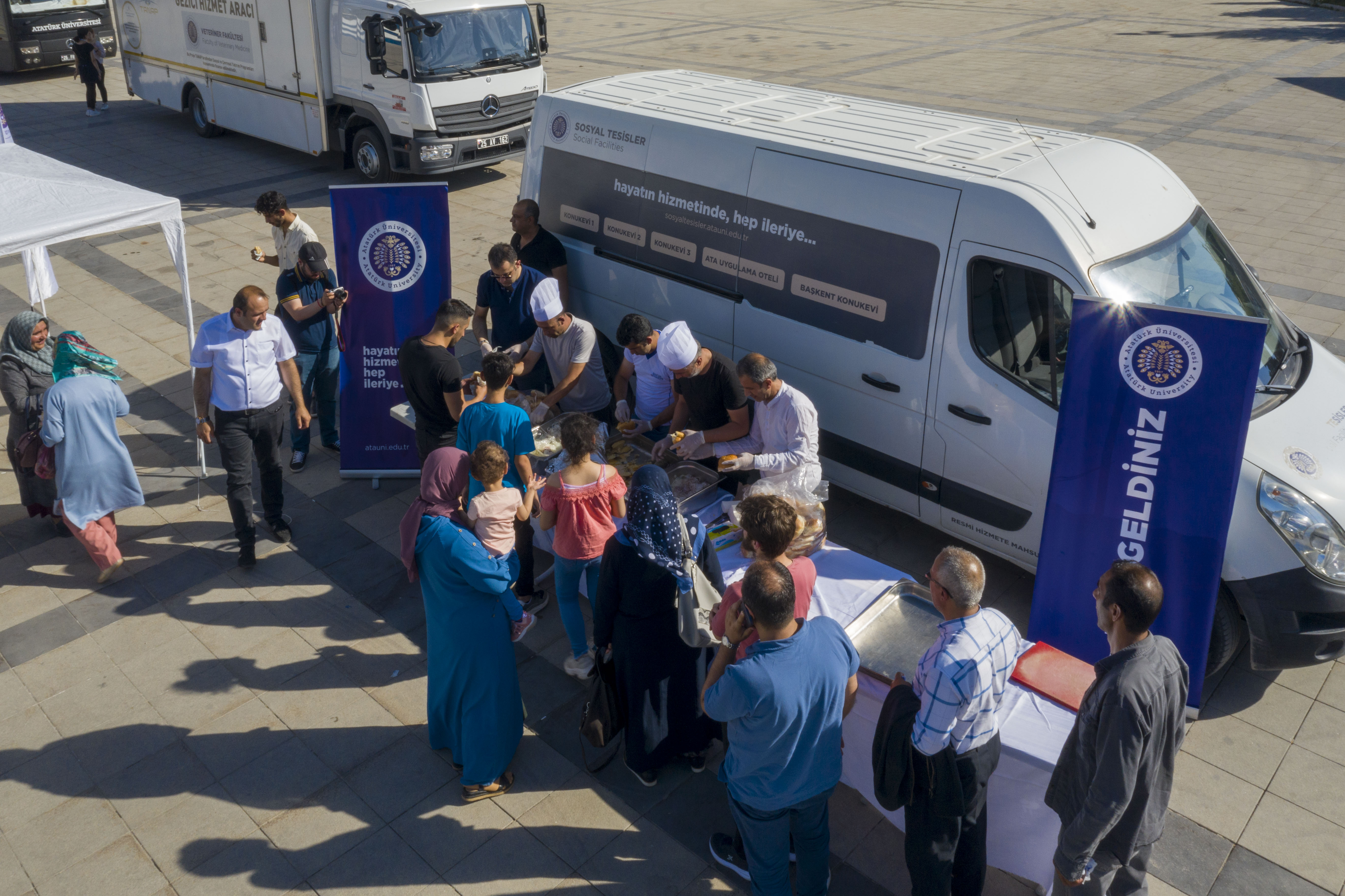 Öğrenci Dekanlığı tarafından Erzurum Havuzbaşı mevkiinde organize edilen tanıtım ve tercih günlerinde Atatürk Üniversitesi Su Ürünleri Fakültesi ve Sosyal Tesisleri tarafından balık ekmek ikram edilirken, Kazım Karabekir Eğitim Fakültesi Müzik Öğretmenliği Bölümü öğrencileri ise konuklara müzik dinletisi sunuyor.