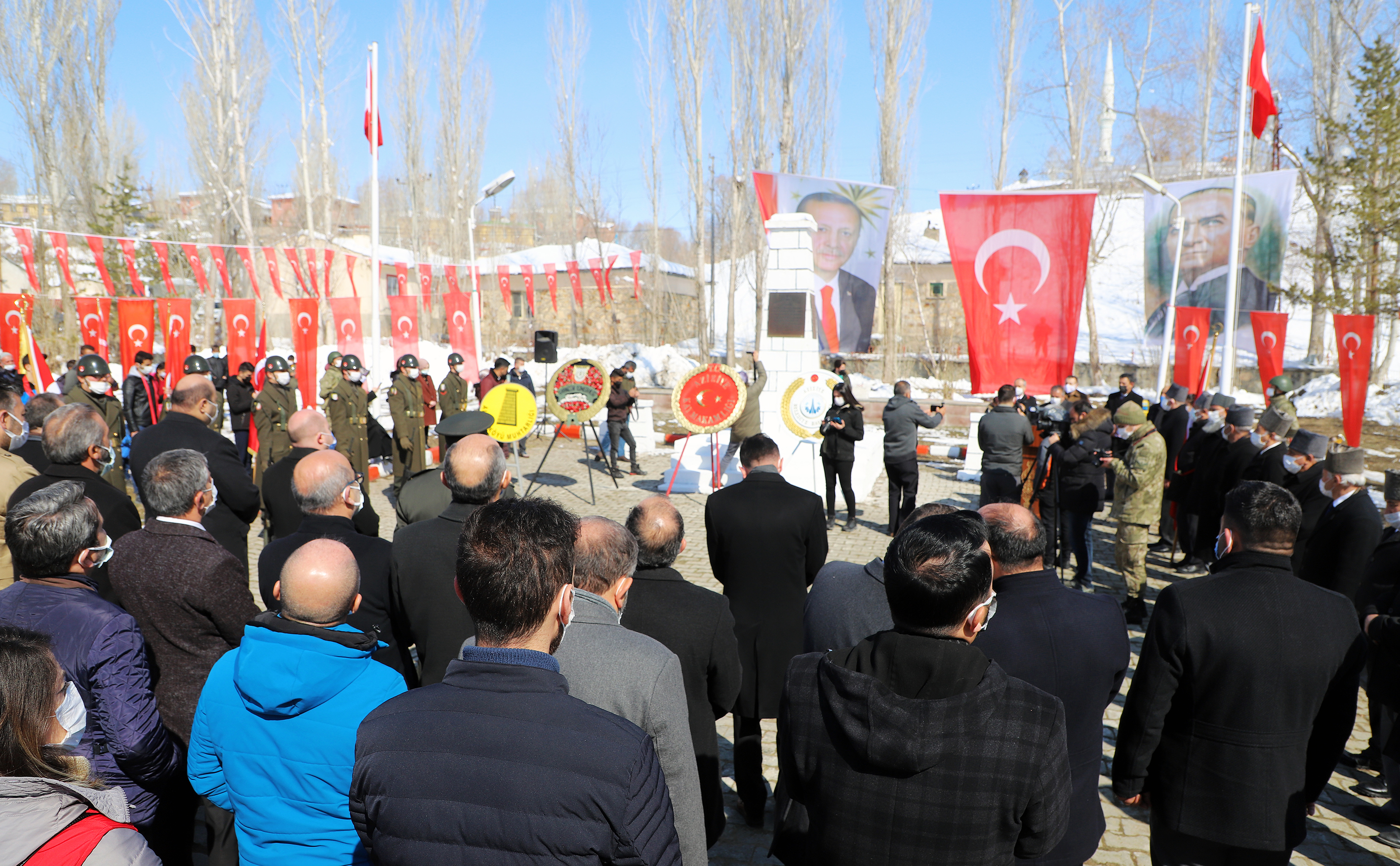 Vatandaşların yoğun bir katılım sağladığı görülen fotoğraflarda anıta çelenk bırakılarak dualar eşliğinde şehitler anılıyor.