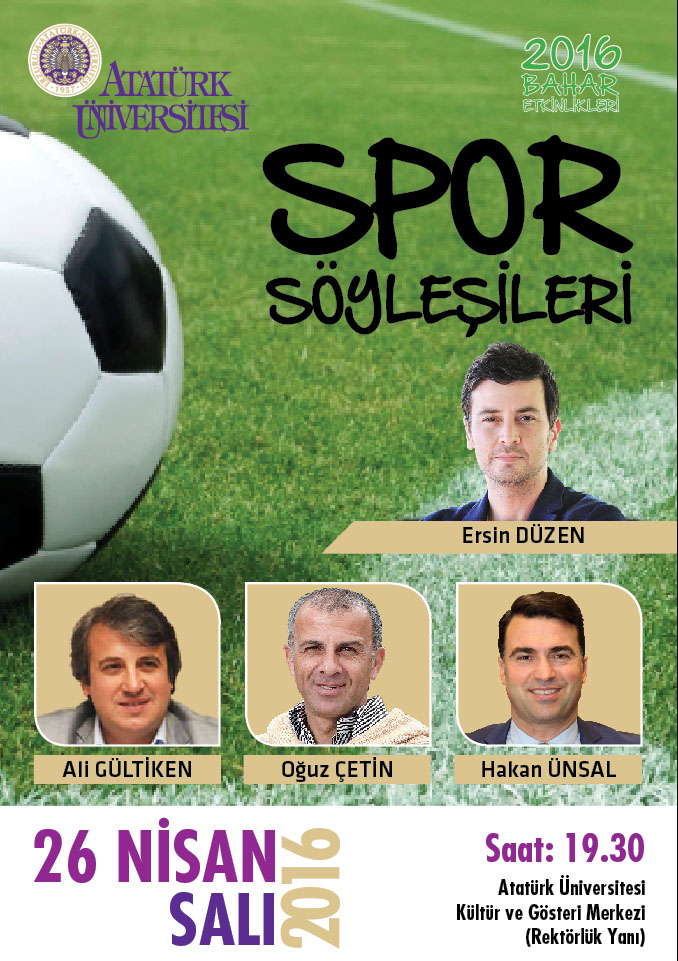 Atatürk Üniversitesi’nin 2016 Bahar Şenlikleri kapsamında düzenlediği “ Ersin Düzen;’in Moderatörlüğünü yapacağı Ali Gültiken, Oğuz Çetin ve Hakan Ünsal’ın katılacağı Spor Söyleşileri” 26 Nisan saat 19:30’da Atatürk Üniversitesi Kültür Merkezi’nde ( Rektörlük Yanı) geçekleştirilecektir.