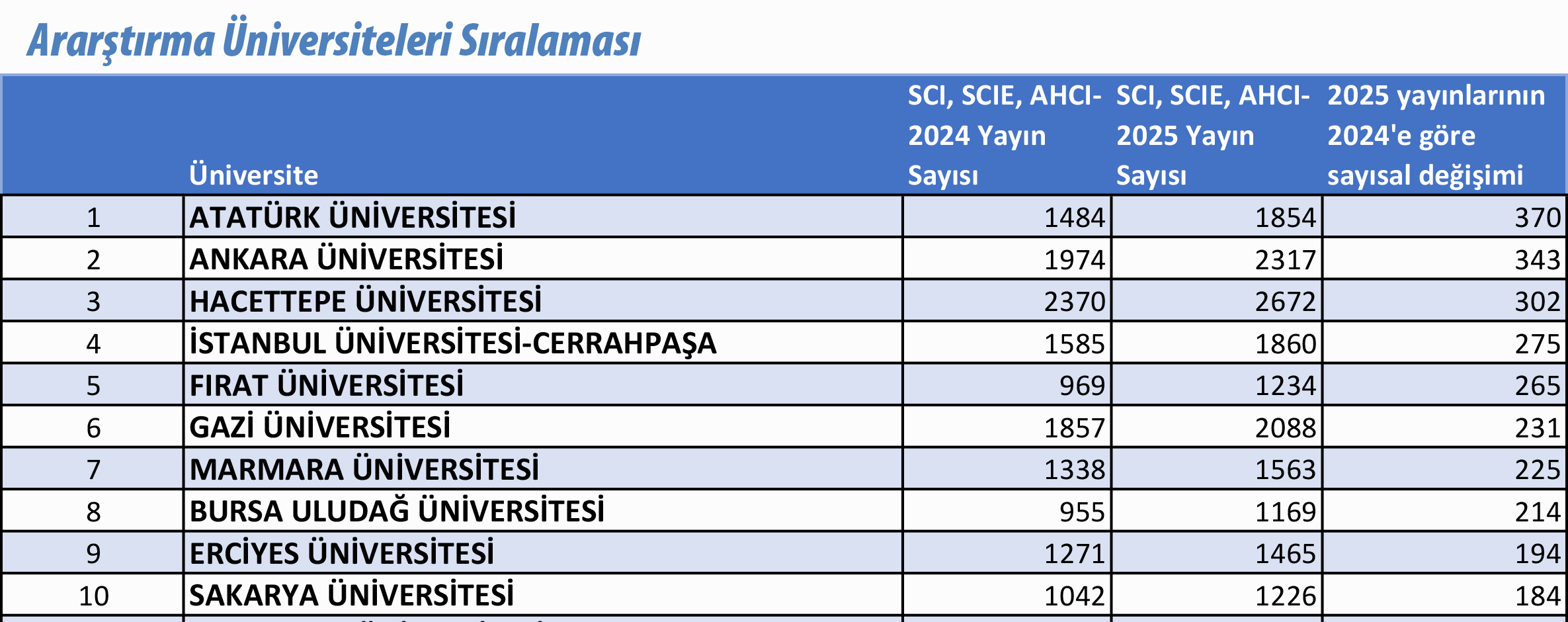 Atatürk Üniversitesi, uluslararası bilimsel yayın alanında gösterdiği istikrarlı yükselişle önemli bir başarıya imza attı. Üniversite 2025 yılında; SCI, SCIE ve AHCI indekslerinde yer alan yayın sayılarıyla tüm üniversiteler arasında bir önceki yıla göre yayın sayısını en fazla artıran üniversite olarak ilk sırada yer aldı.