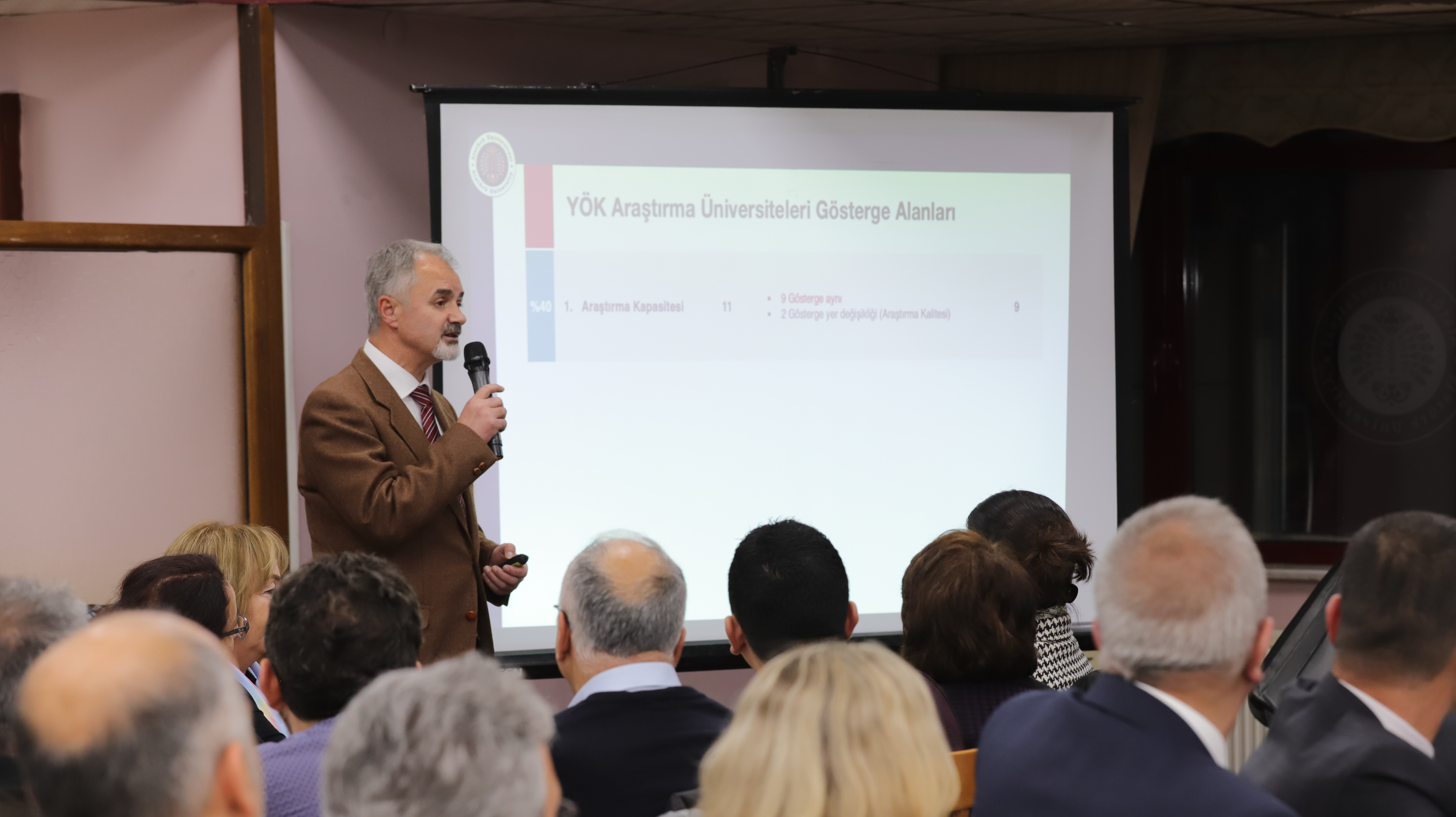 Atatürk Üniversitesi üst yönetimi, bilimsel çalışmalarında ortalamanın üzerinde atıf alan öğretim üyeleriyle "Araştırma Üniversitesi Göstergeleri Kapsamında Üniversitemiz Yayın ve Atıflarının Değerlendirilmesi" toplantısında bir araya geldi.