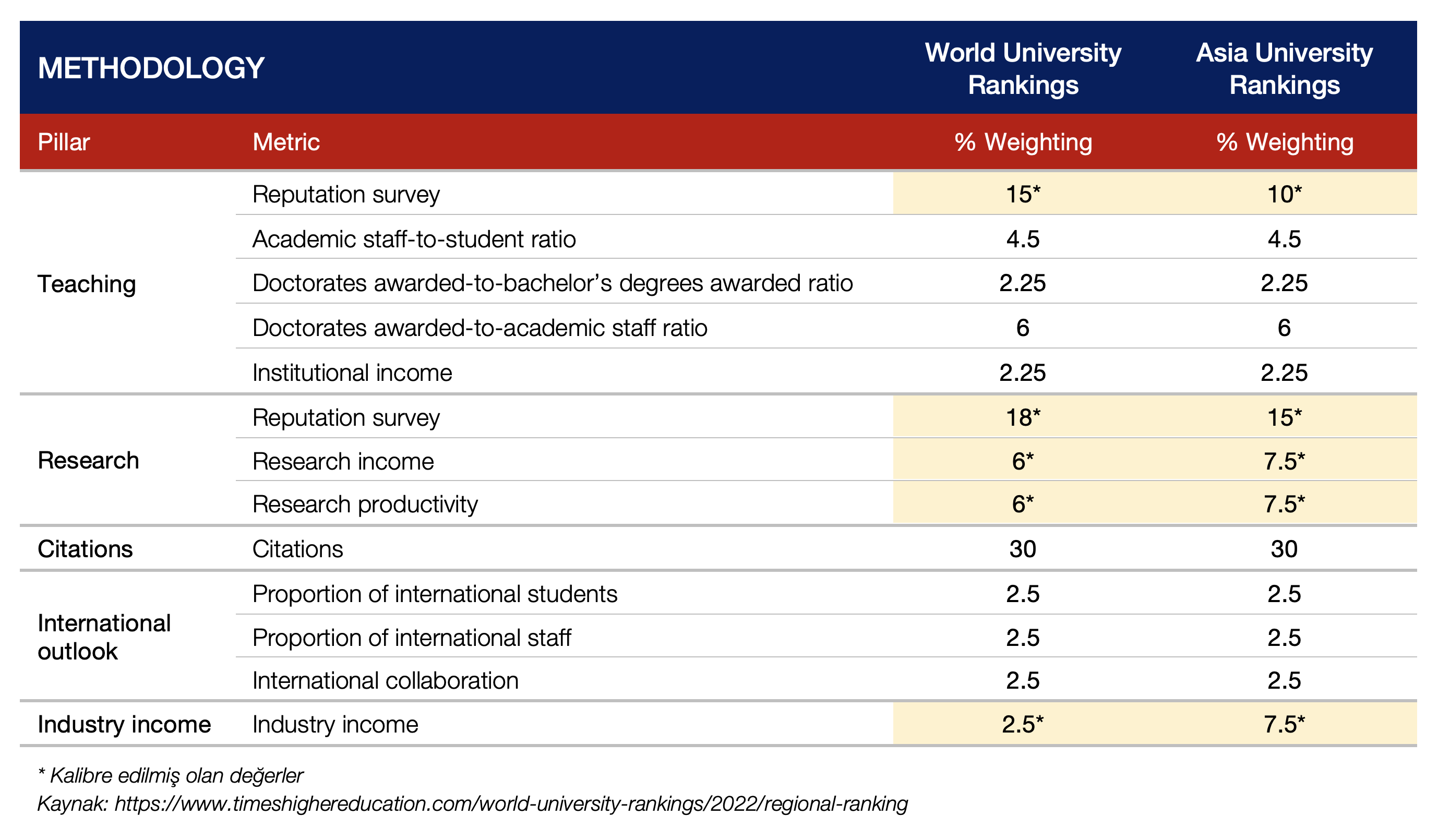 Sıralama metodolojisi hakkında daha detaylı bilgi içinhttps://www.timeshighereducation.com/world-university-rankings/asia-university-rankings-2022-methodology sayfasını ziyaret ediniz.