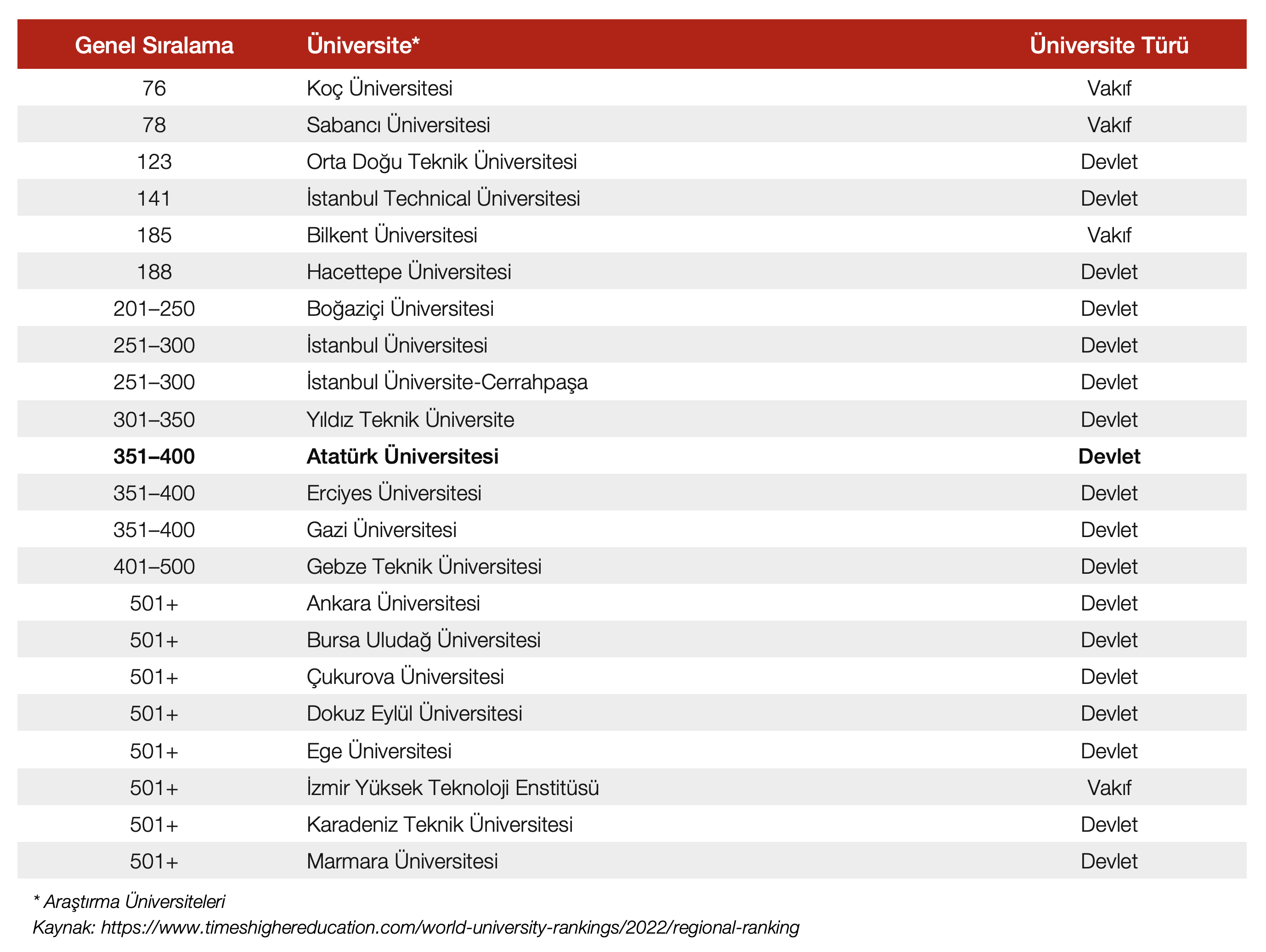 Türkiye’den listeye giren araştırma üniversiteleri ve başarı sıralamaları şu şekilde: