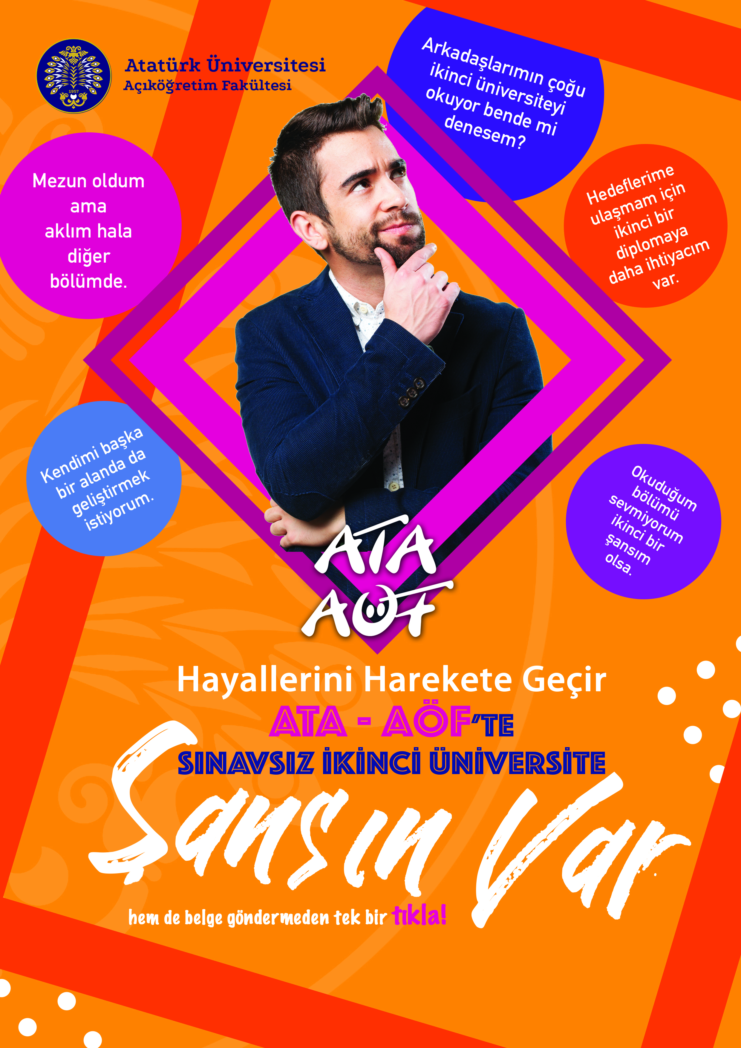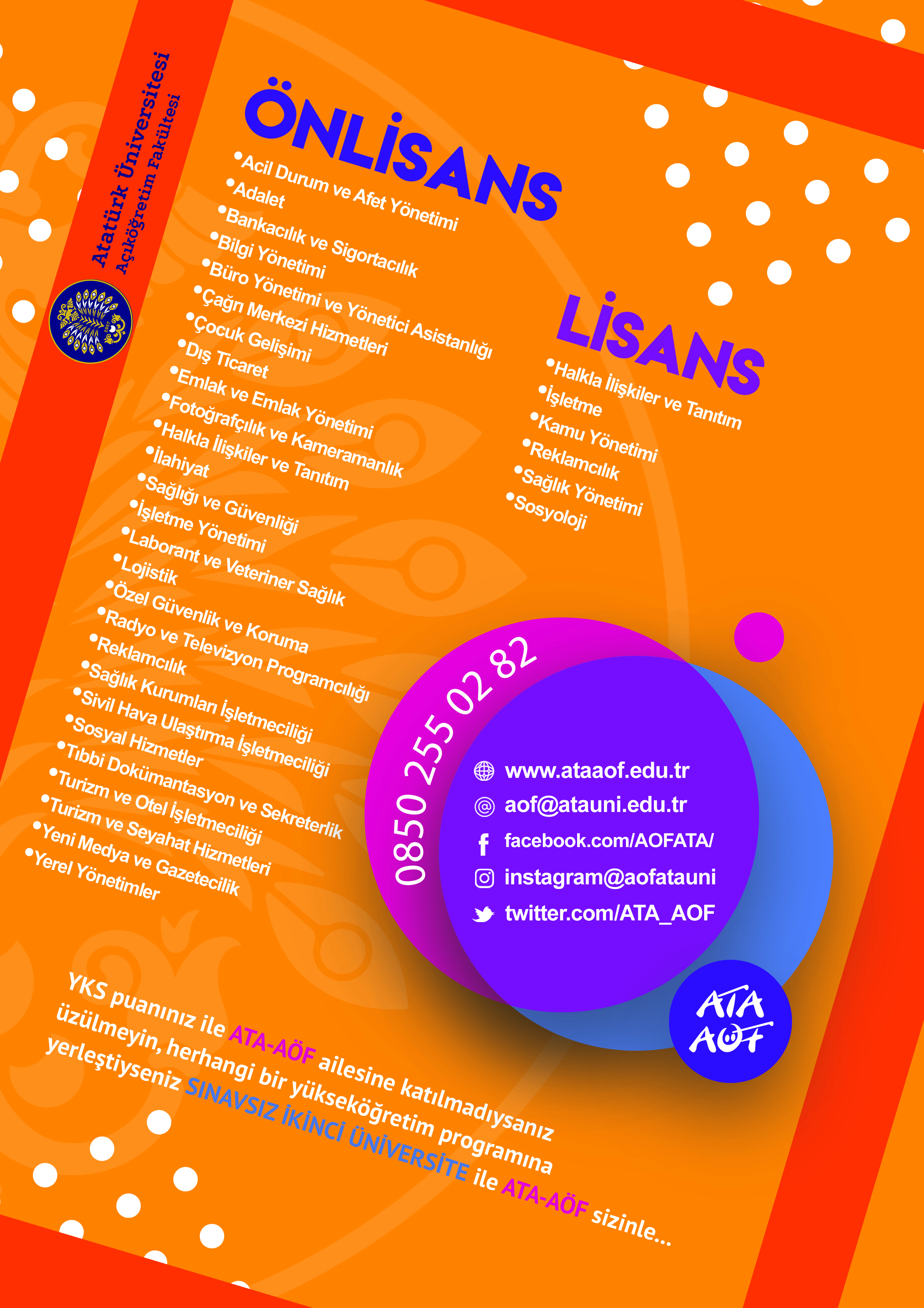 Atatürk Üniversitesi Açıköğretim Fakültesi programlarına, çeşitli nedenlerle herhangi bir yükseköğretim programında eğitim öğretim imkânı bulamayan veya açıktan aynı anda ikinci bir üniversite okumak isteyen öğrenci adaylarının sınavsız ikinci üniversite kapsamında kayıt yaptırma şansları devam ediyor.