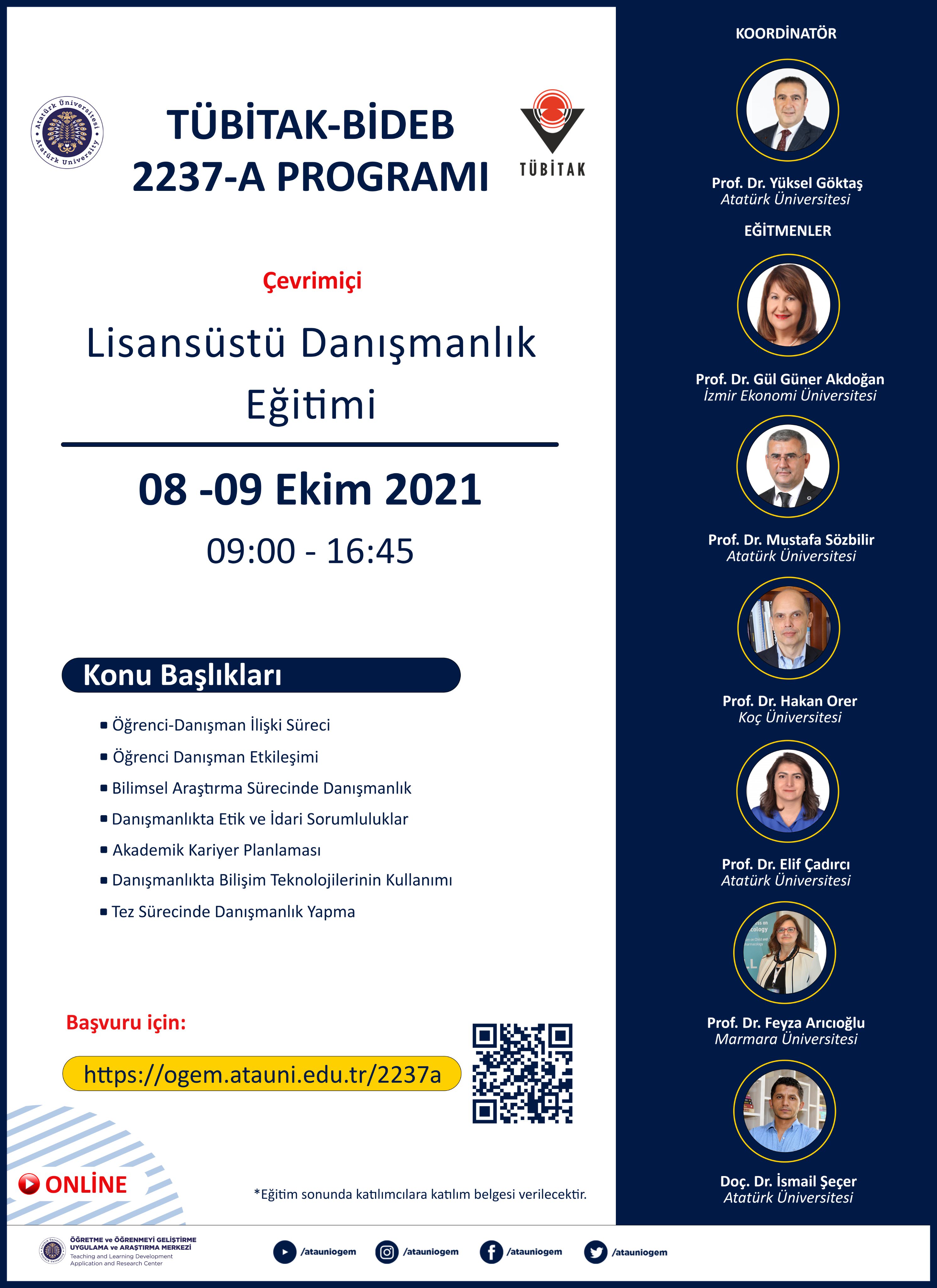 Türkiye Bilimsel ve Teknolojik Araştırma Kurumu (TÜBİTAK) Bilim İnsanı Destekleme Daire Başkanlığı (BİDEB) 2237-A programı kapsamında desteklenen, yürütücülüğünü ise ATAÖGEM Koordinatörü Prof. Dr. Yüksel Göktaş’ın yaptığı programa, Atatürk Üniversitesi Rektör Yardımcısı Prof. Dr. Mustafa Sözbilir, Öğretim Üyeleri Prof. Dr. Elif Çadırcı ve Doç. Dr. İsmail Seçer ile İzmir Ekonomi Üniversitesi Öğretim Üyesi Prof. Dr. Gül Güner Akdoğan, Marmara Üniversitesi Öğretim Üyesi Prof. Dr. Feyza Arıcıoğlu ve Koç Üniversitesi Öğretim Üyesi Prof. Dr. Hakan Sedat Orer eğitimci olarak katıldı.