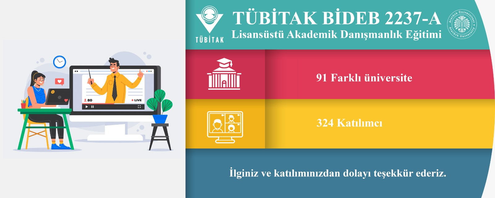Atatürk Üniversitesi Öğretme ve Öğrenmeyi Geliştirme Uygulama ve Araştırma Merkezi (ATAÖGEM) tarafından çevrim içi olarak 2.si düzenlenen ve TÜBİTAK BİDEB 2237-A programı kapsamında desteklenen Lisansüstü Danışmanlık Eğitimi, 91 üniversiteden 324 öğretim üyesinin katılımıyla tamamlandı.
