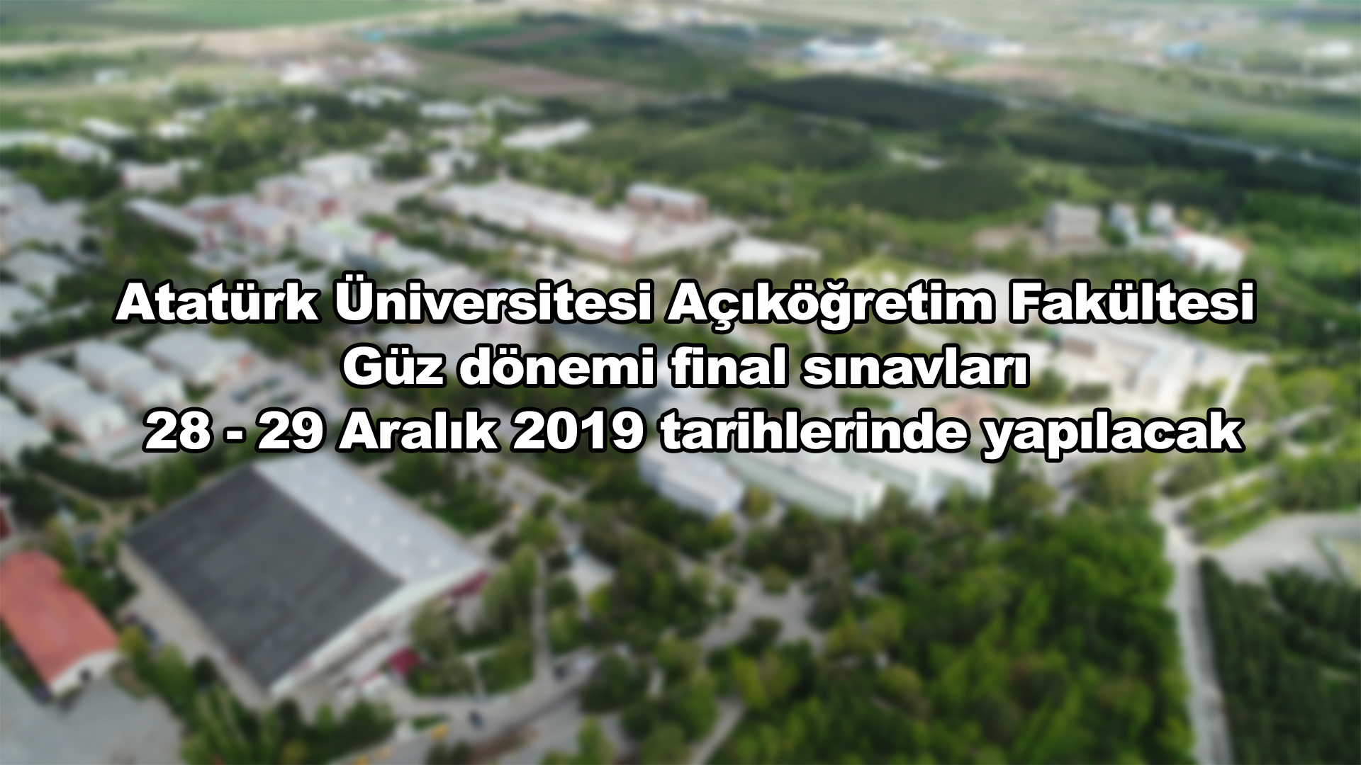 Atatürk Üniversitesi Açıköğretim Fakültesi (ATA-AÖF) güz yarıyılı final sınavı, 28-29 Aralık 2019 tarihlerinde yapılacak. Türkiye genelindeki 104 sınav merkezinde yapılacak final sınavının giriş belgeleri yayınlandı. Giriş belgeleri, "https://obs.atauni.edu.tr" adresinden öğrenci şifreleriyle girilerek alınabilecek.