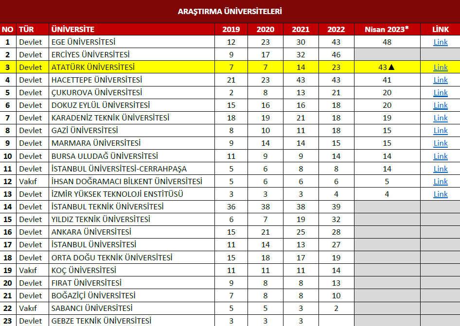 3) Araştırma Üniversitesi olan 23 üniversite arasında 2022 yılında 8. sırada olan üniversitemiz bugün itibariyle 3. sıraya,