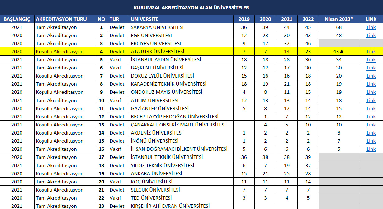 4) Kurumsal Akreditasyon alan 23 üniversite arasında 2022 yılında 9. sırada olan üniversitemiz bugün itibariyle 4. sıraya,