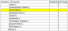 Bir sonraki dönemi beklemeden başvuru yapılabilmesine karar verilen projeler arasında tüm üniversiteler arasında Atatürk Üniversitesi 3. sırada yer aldı. Bu bağlamda Su Ürünleri Fakültesi Su Ürünleri Yetiştiriciliği Bölümü Öğretim Üyesi Prof. Dr. Murat Aslan, Veteriner Fakültesi Gıda Hijyeni ve Teknolojisi Bölümü Öğretim Üyesi Doç. Dr. Alper Baran, Teknik Bilimler Meslek Yüksekokulu Kimya ve Kimyasal İşleme Teknolojileri Bölümü Öğretim Üyesi Doç. Dr. Derya Anıl, Fen Fakültesi Fizik Bölümü Öğretim Üyesi Doç. Dr. Esra Kavaz Perişanoğlu, Turizm Fakültesi Gastronomi ve Mutfak Sanatları Bölümü Öğretim Üyesi Doç. Dr. Neslihan Serçeoğlu ve Diş Hekimliği Fakültesi Klinik Bilimler Bölümü Öğretim Üyesi Doç. Dr. Songül Cömert Kılıç’ın projeleri, bir sonraki dönem beklemeden sunulmaya hak kazandı.