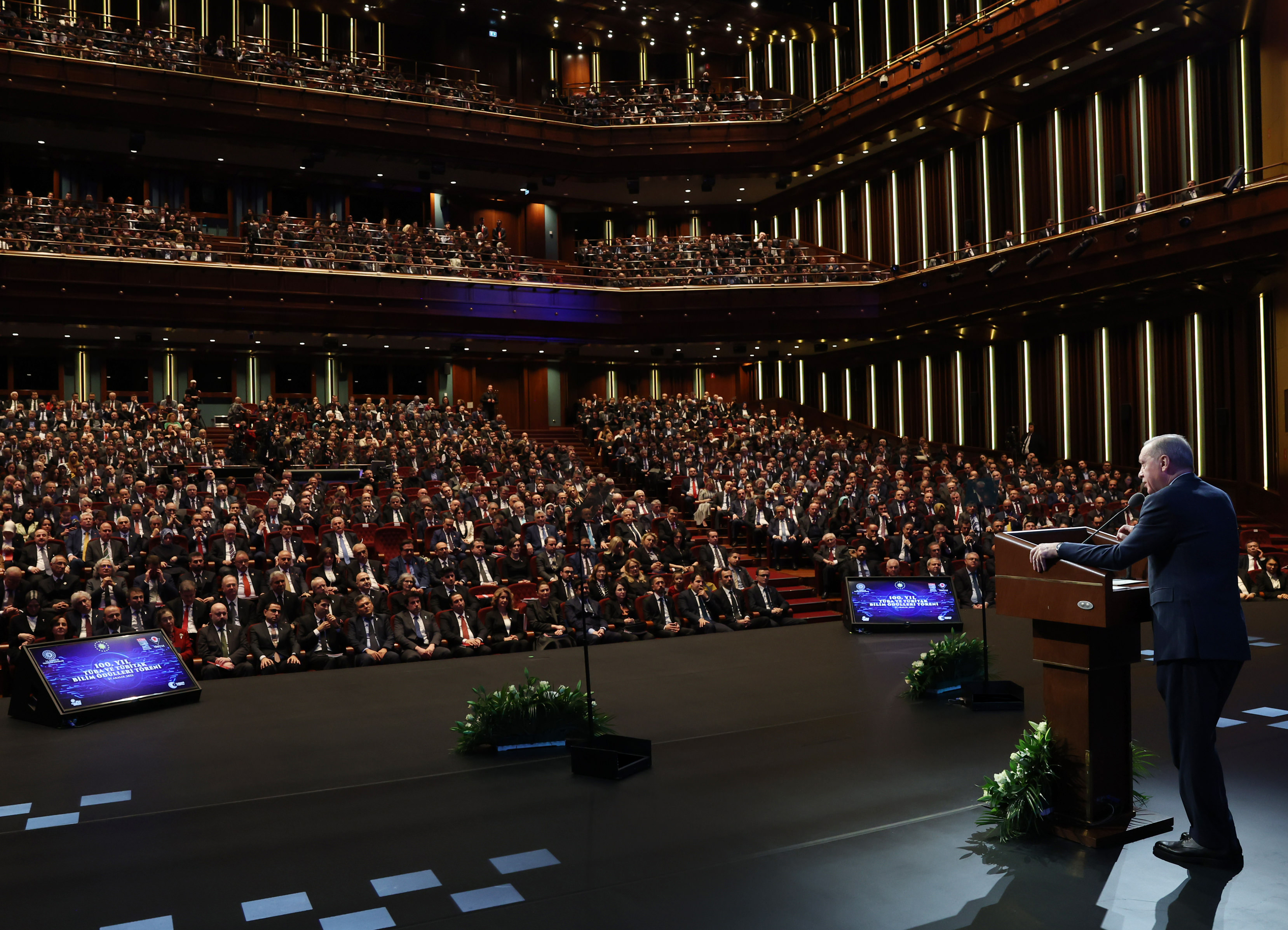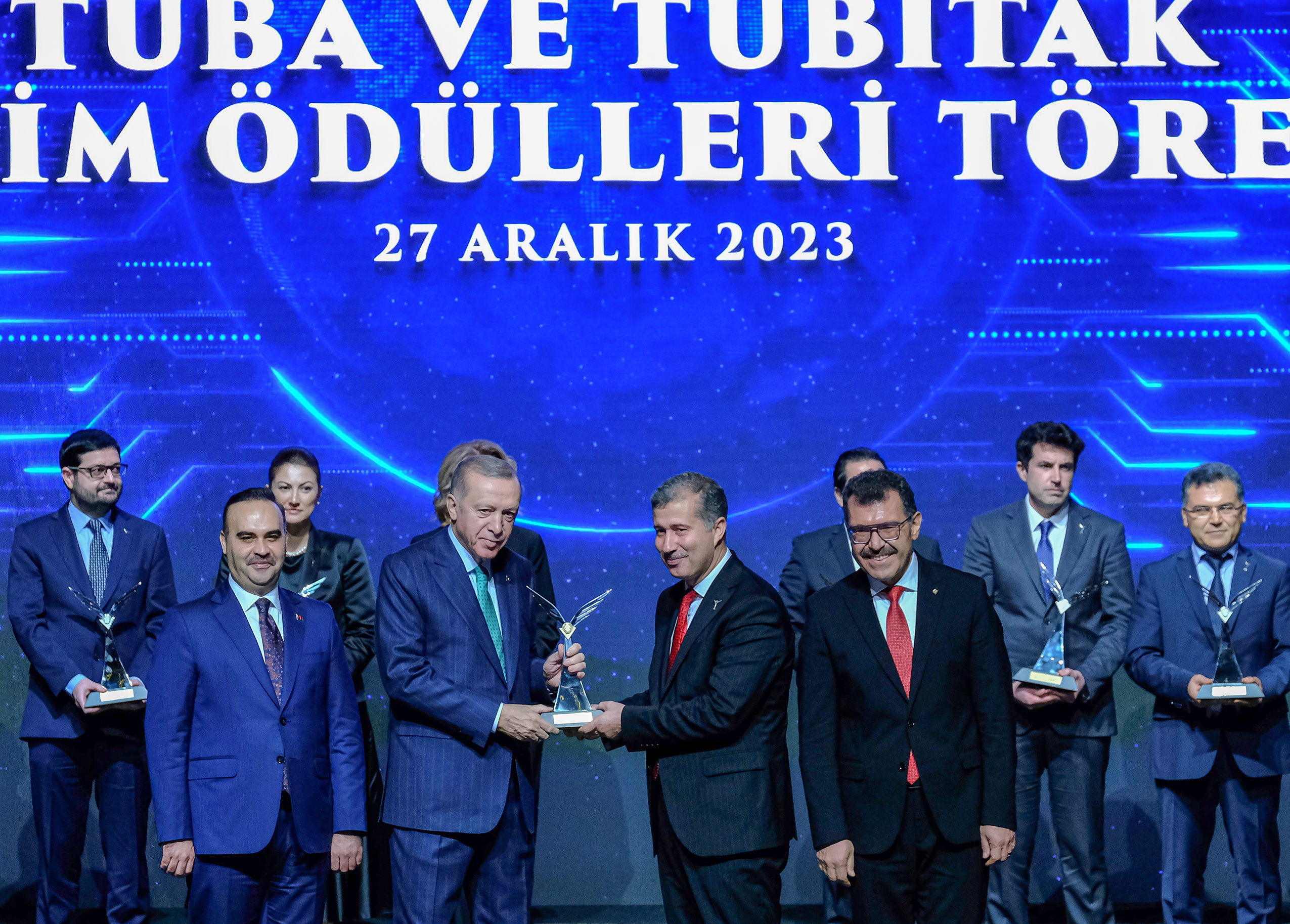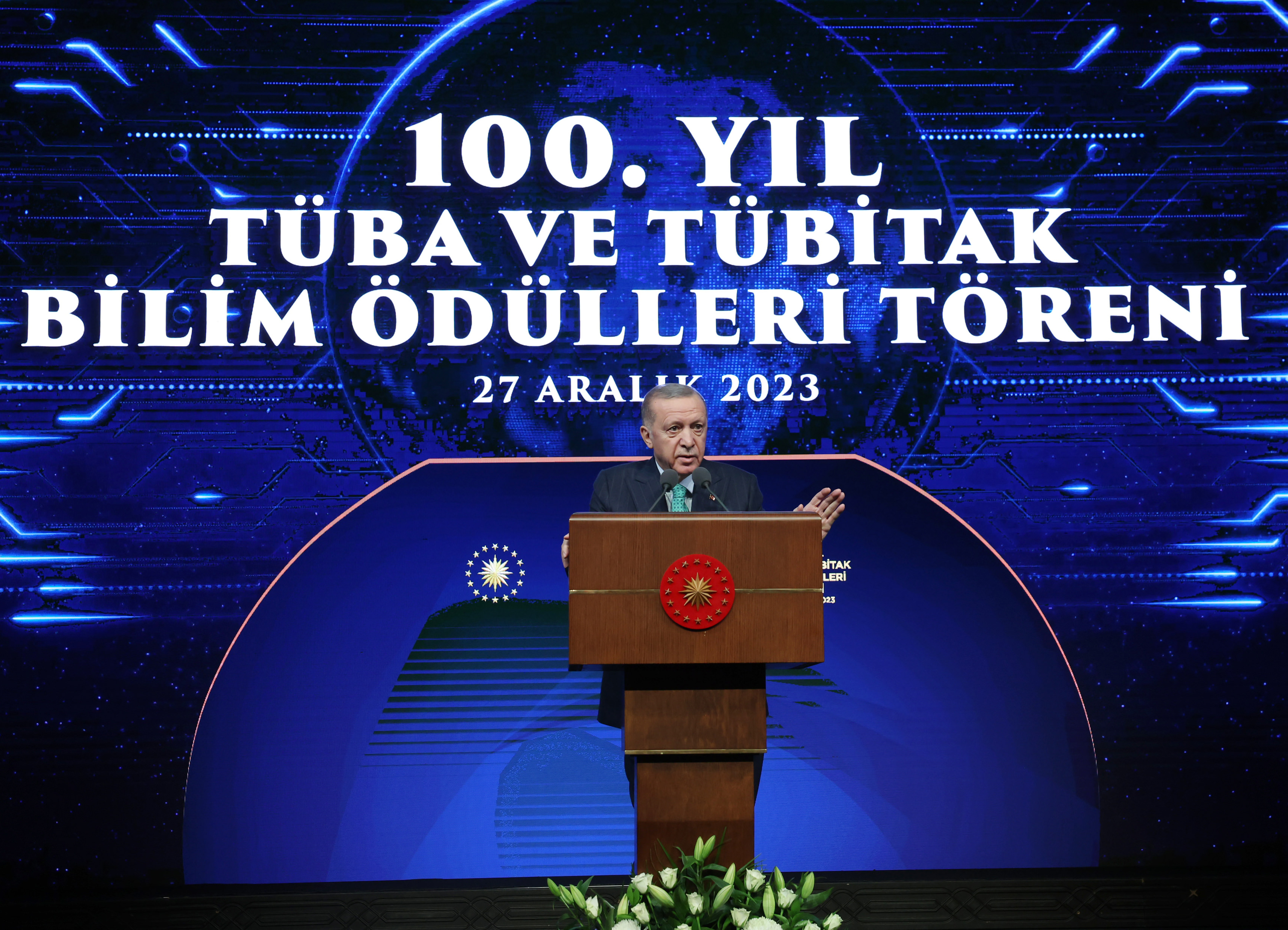 Ödül töreninde kürsüye çıkan Cumhurbaşkanı Recep Tayyip Erdoğan, Beştepe Millet Kongre ve Kültür Merkezi'nde düzenlenen 100. Yıl TÜBİTAK ve TÜBA Bilim Ödülleri Töreninde konuştu. Cumhurbaşkanı Erdoğan, konuşmasında başarılı bilim insanlarını ödüllendirmenin ve takdir etmenin kültürümüzün bir parçası olduğunu söyledi. Bilim dünyasına katkı sunan tüm bilim insanlarını tebrik eden Cumhurbaşkanı Erdoğan: “Bizim kültürümüzde marifet iltifata tabidir. İyi olanı, başarılı olanı ülkemizin önünde yeni yollar açanı ödüllendirmek, insanlığın ortak ilim hazinesine katkı yapanı takdir etmek görevimizdir. Başarılar desteklendikçe büyür, sahip çıkıldıkça gelişir, toplum tarafından kıymeti bilindikçe serpilir. Taltif ve takdir edilen her başarı yeni çalışmaların ilham veren yeni hikayelerin önünü açar. Takdim edeceğimiz TÜBA ve TÜBİTAK ödülleri ile işte bunu yapmanın gayretindeyiz. İlmi çalışmaları ve çığır açıcı eserleri ile bilim dünyasına değerli katkılar sunan ülkemizin müreffeh yarınları adına gece gündüz çalışan tüm bilim insanlarımızı şahsım ve milletim adına tebrik ediyorum” diye konuştu.