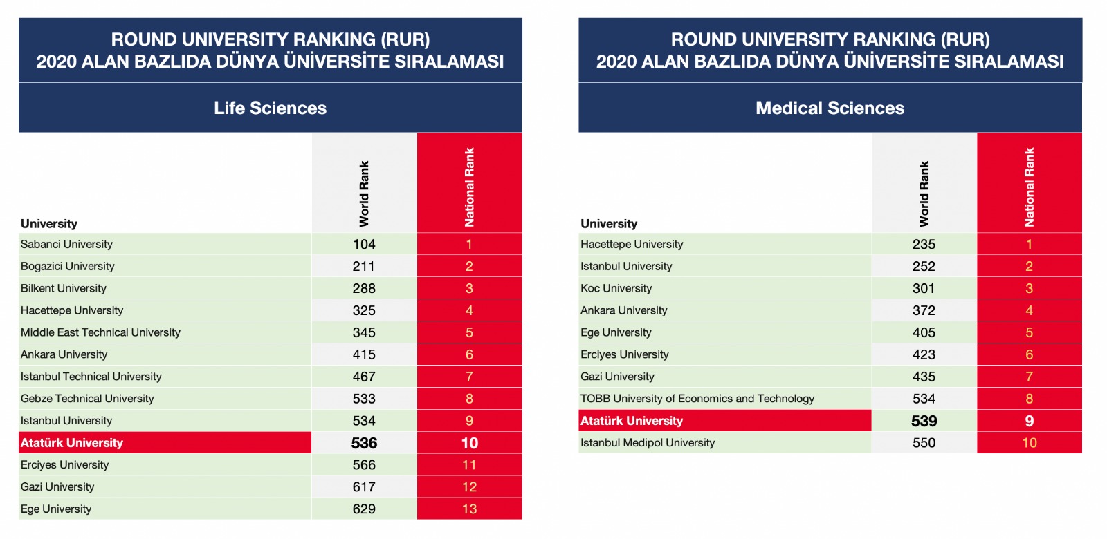 Dünyanın önde gelen üniversitelerinin değerlendirildiği RUR 2020 sıralamasına göre iki alanda ilk defa listeye girmeyi başaran Atatürk Üniversitesi; Tıp Bilimleri alanında Dünya’da 539’uncu, Türkiye'den ise sıralamaya giren devlet üniversiteleri arasında 7. olurken, Yaşam Bilimleri alanında Türkiye'den sıralamaya giren devlet üniversiteleri arasında 8. olarak dünya listesinde 536. sırada yer aldı.