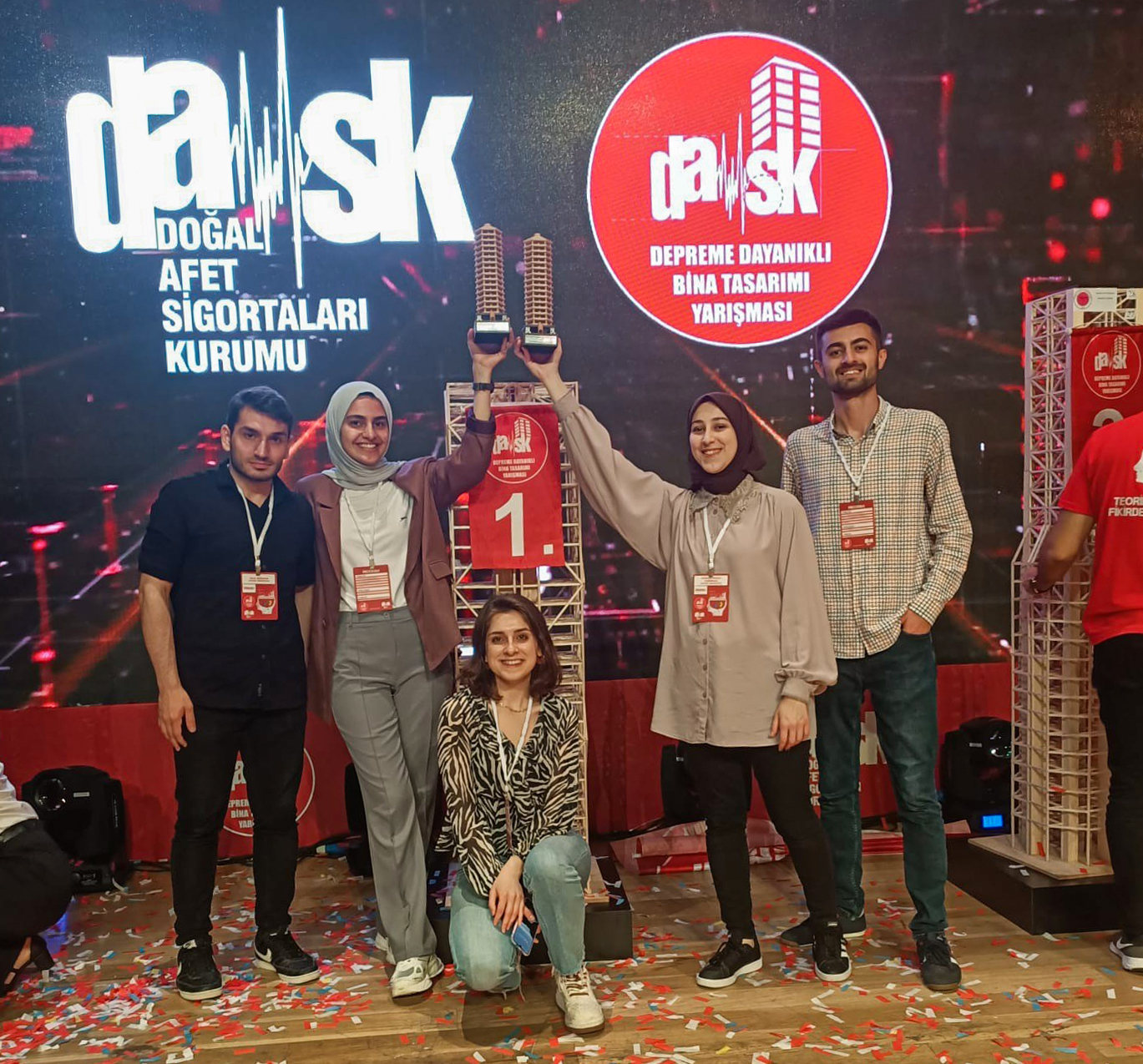 İnşaat Mühendisliği Bölümü öğretim üyeleri Prof. Dr. Abdulkadir Cüneyt Aydın, Doç. Dr. Mahmut Kılıç, Arş. Gör. Oğuzhan Çelebi ile Doktora Öğrencisi Oğuzhan Akarsu’nun danışmanlığında yürütülen ve öğrencileri, Gökçenur Zehra Koçak, Halis Sevencan, Sudenur Sıddıka Kağızmanlı, Mert Aydın, Bahar Ayça Polat’tan oluşan ekip, birincilik ödülünün yanında en iyi deprem performansı özel ödülünü de almaya hak kazandı.