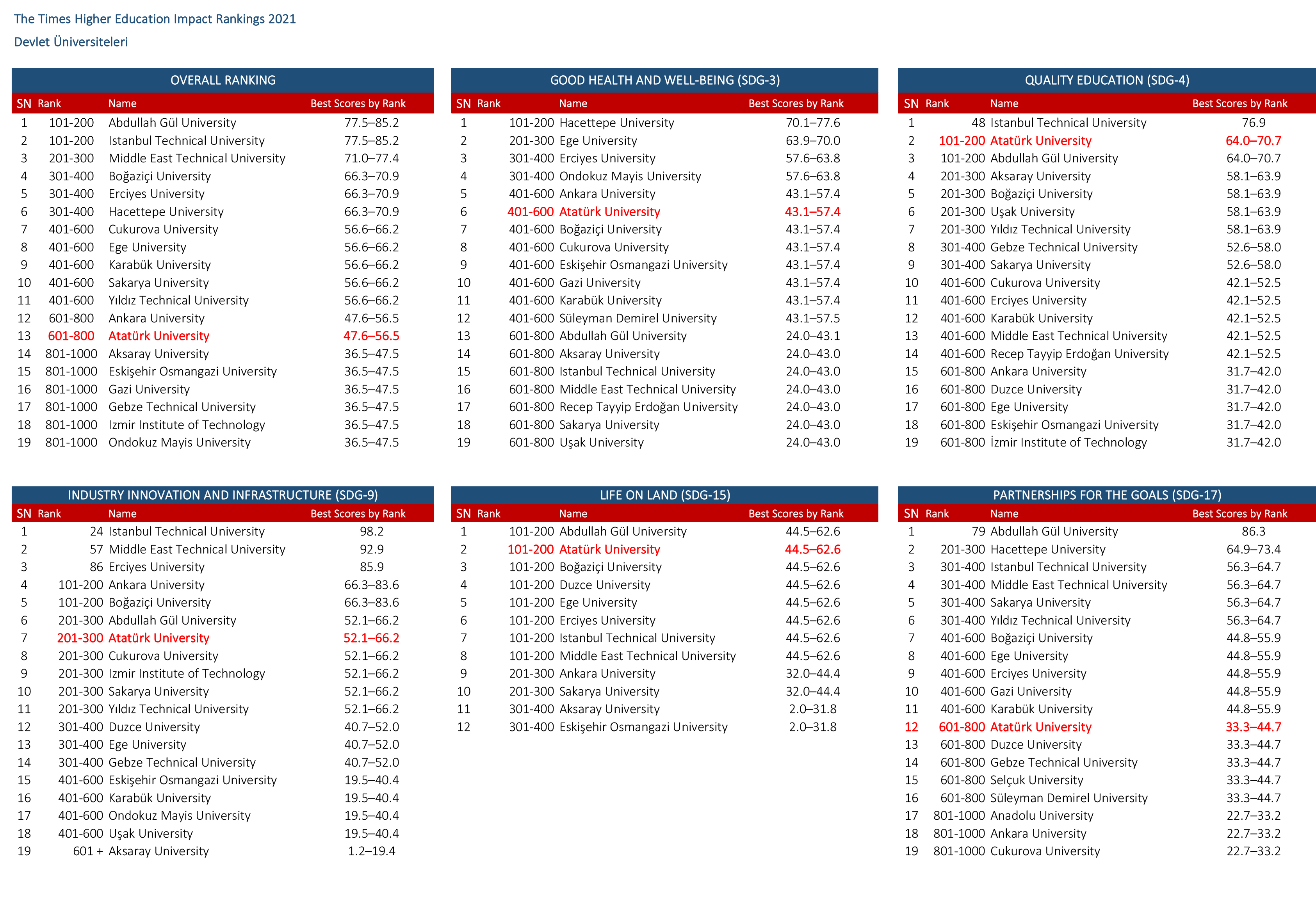 Atatürk Üniversitesi ayrıca; Quality Education (Nitelikli Eğitim) alanında 100+, Life on Land (Karasal Yaşam) alanında 100+, Innovation and Infrastructure (İnovasyon ve Altyapı) alanında 200+, Good Health and Wellbeing (Sağlık ve Kaliteli Yaşam) alanında 400+, Partnership for the Goals (Hedefler İçin İş Birlikleri) alanında ise 600+ bandında yer alarak başarı çıtasını yükseltmiş oldu.