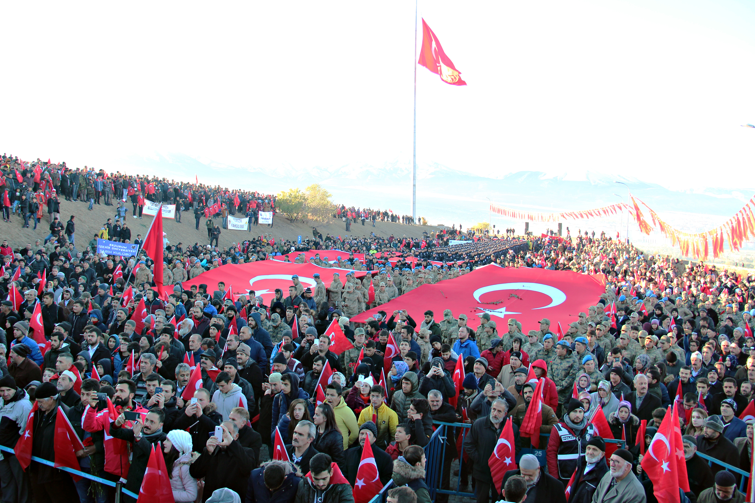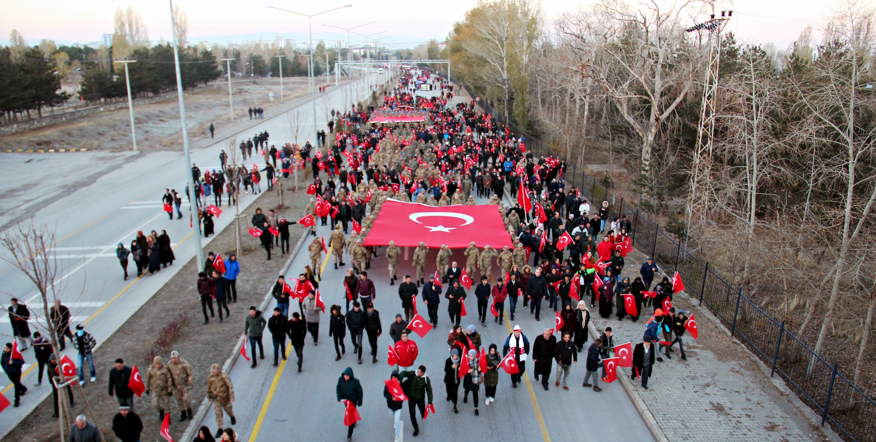 Atatürk Üniversitesi Rektörü Prof. Dr. Ömer Çomaklı’nın da iştirak ettiği yürüyüşe, şehrin mülki, idari, askerî ve yargı erkânının yanı sıra çok sayıda vatandaş katıldı.