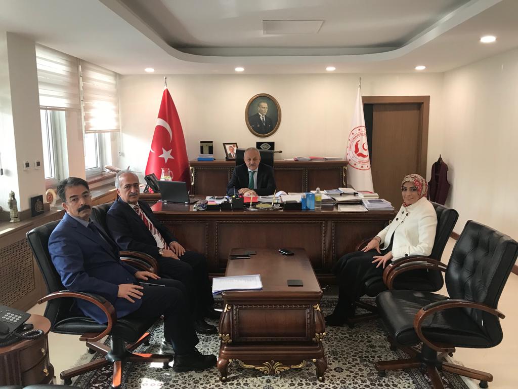 İlk olarak Aile, Çalışma ve Sosyal Hizmetler Bakan Yardımcısı Ahmet Erdem’i ziyaret eden heyet, Erzurum ve Atatürk Üniversitesi Araştırma Hastanesinin gidişatıyla ilgili bilgi paylaşımında bulundu. Yapılan çalışmalar ve geliştirilen projeler hakkında bilgi veren Rektör Çomaklı, üniversite bünyesinde hizmet veren her çalışanın hakkını gözettiklerini, çalışma şartlarını iyileştirmeye yönelik adımlar attıklarını dile getirdi. Uluslararası öğrencilerin de yabancılık çekmemeleri adına sivil toplum kuruluşları, dernek ve vakıflar ile sürekli iletişim halinde olduklarına dikkat çeken Çomaklı bir diğer yandan da engelleri öğrencilerin eğitimlerinde aksaklık yaşamamaları adına “engelleri aşan üniversite” olma anlayışına uygun projeler ürettiklerinin altını çizdi.