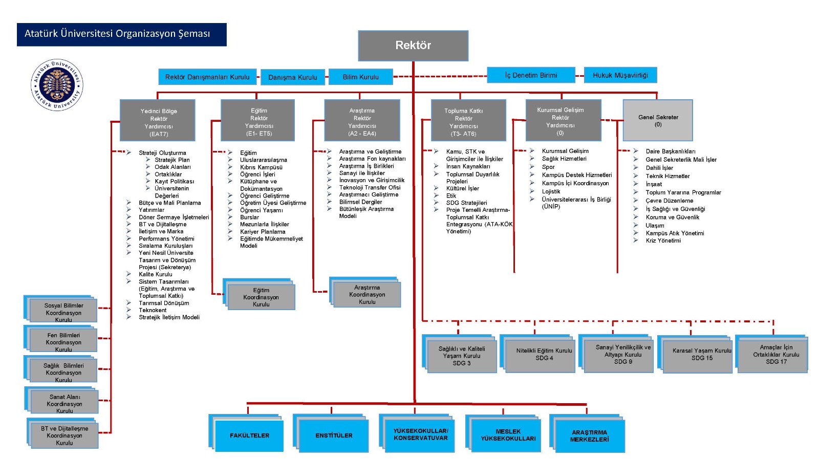 Bu çerçevede Atatürk Üniversitesi tarihinin önemli kırılma noktalarından biri olan 7 Katmanlı Yönetişim Modeline geçiş çalışmaları başlatılarak, gerekli düzenlemelerin yapılması hususunda birim yöneticileri bilgilendirildi. Söz konusu yönetişim modelinin metodolojisi, Rektörlük üst yönetim ekibinin görev dağılımı ve konumlanma tercihi hakkında bilgi ve görseller tüm personele bilgilendirme amacıyla mail olarak gönderildi.