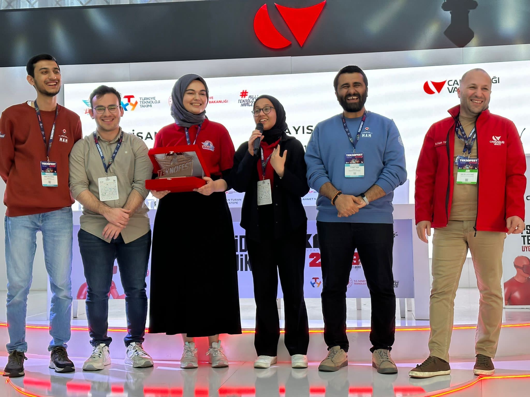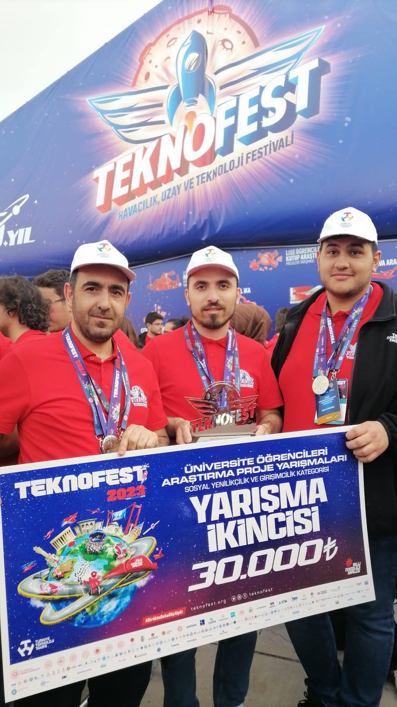 Arş. Gör. Onur Erdem Korkmaz, Sevde Gül Korkmaz, Dr. Öğr. Üyesi Ömer Çoban, Doç. Dr. Emin Argun Oral ve Prof. Dr. İbrahim Yücel Özbek’ten oluşan takım TEKNOFEST’te Engelsiz Yaşam Teknolojilerinde 3. oldu. Projede ALS ve omurilik felci gibi konuşamayan ve hiçbir şekilde etrafındakilerle iletişim kuramayan hasta bireylerin sadece düşünceleriyle yazı yazarak, çevreleri ile iletişim kuracakları bir Beyin Bilgisayar Arayüz Sistemi geliştirildi. Kişilerin beyin sinyalleri (EEG) kullanılarak bilgisayar ekranındaki klavyeden isteklerini aktarabilecekleri bir sistemi hayata geçiren ekip, bu sayede hem refakatçilerin hastaları anlamalarına hem de hasta bireylerin her türlü ihtiyaç ve taleplerini yakınlarına aktarabilmelerine olanak tanımasına aracı olan çalışmaları ile 3’üncülük ödülünün sahibi oldular.