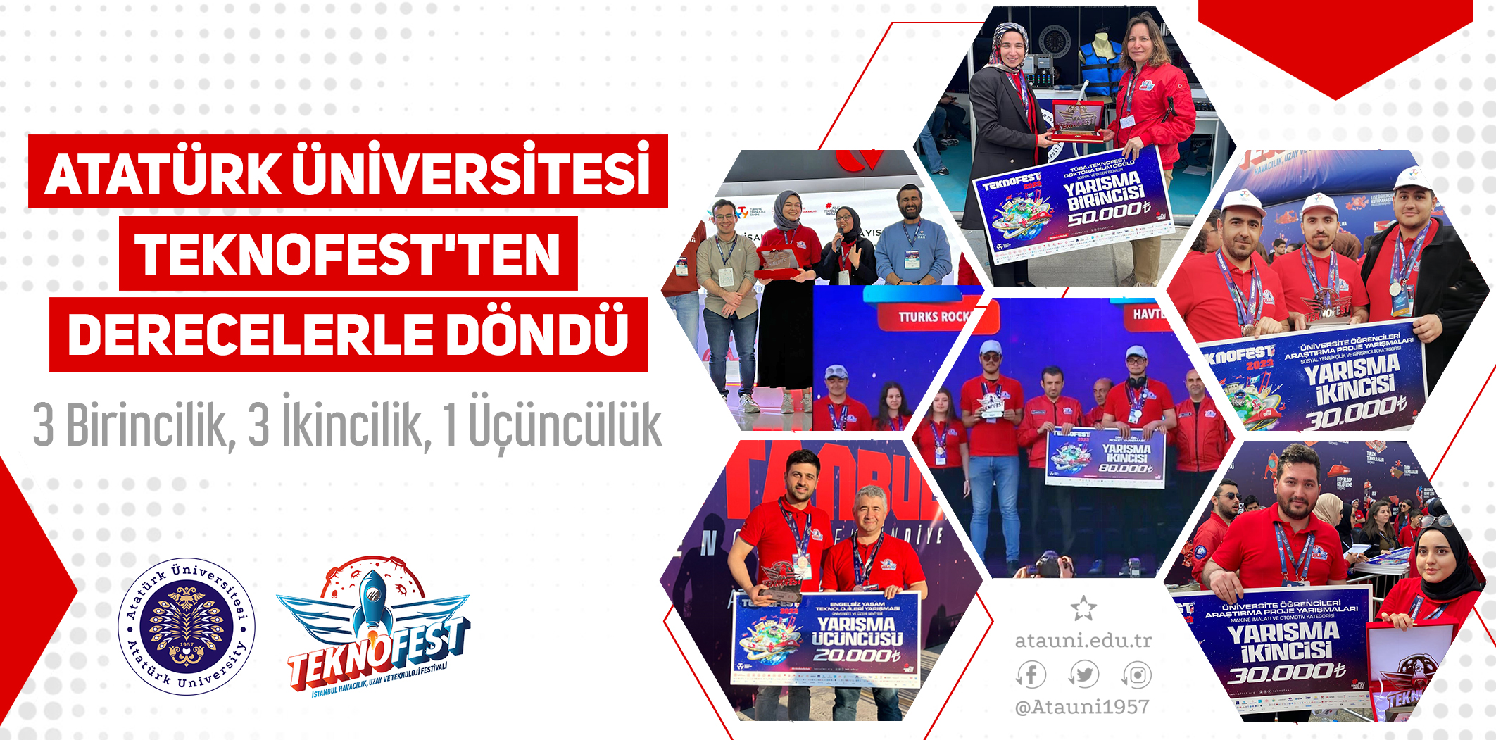 Türkiye Teknoloji Takımı Vakfı ve Sanayi ve Teknoloji Bakanlığı yürütücülüğünde düzenlenen TEKNOFEST Havacılık, Uzay ve Teknoloji Festivali yoğun bir katılımla gerçekleşti. TEKNOFEST’23 kapsamında düzenlenen yarışmaların ödülleri, Cumhurbaşkanı Recep Tayyip Erdoğan’ın katılımıyla sahiplerini buldu. Etkinlik kapsamında düzenlenen yarışmalarda Atatürk Üniversitesi öğrencilerinin proje takımları başarılarıyla göz doldurdu. 3 birincilik, 3 ikincilik ve 1 üçüncülük ile yarışmalardan ayrılan Atatürk Üniversitesi öğrencileri, TEKNOFEST’in ön plana çıkan ekiplerinden oldu.