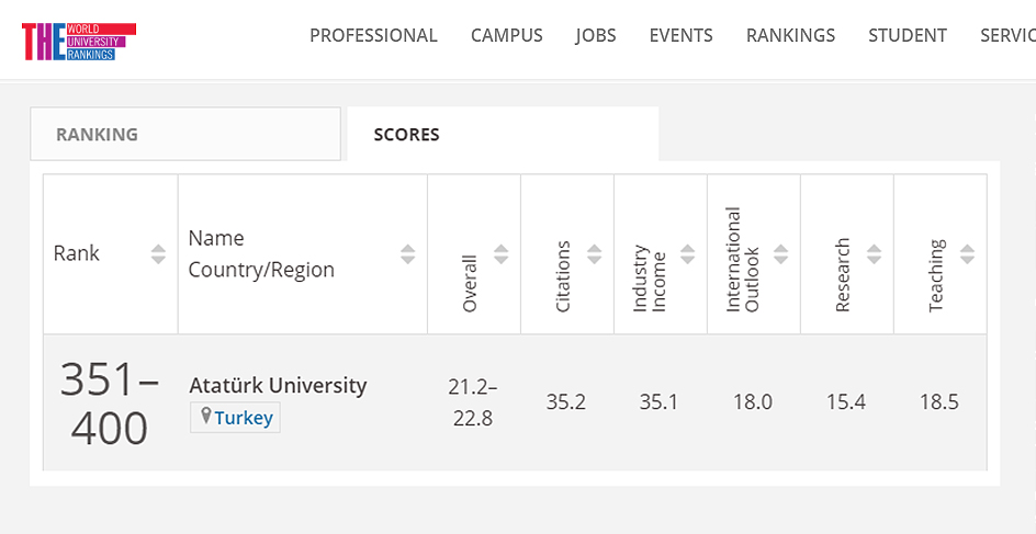 Son yıllarda gösterdiği akademik başarılarla birçok uluslararası sıralama kuruluşunun listesine girmeyi sürdüren Atatürk Üniversitesi, bu kapsamda dünyanın en saygın derecelendirme organizasyonlarından biri olan Times Higher Education (THE) tarafından yayımlanan Gelişmekte Olan Ülkeler Üniversiteleri Sıralaması 2021 listesinde ilk defa 351-400 aralığında yer aldı.