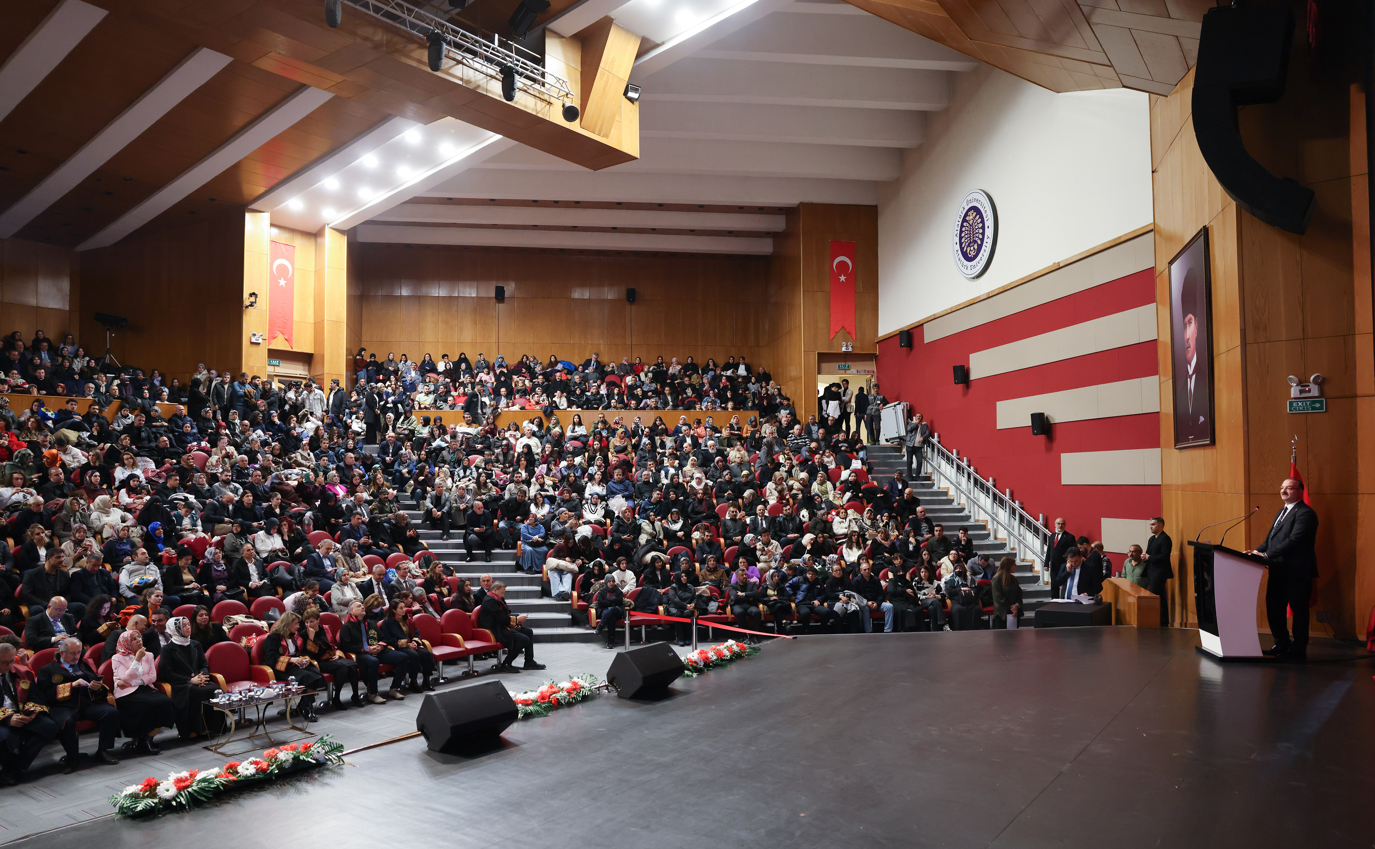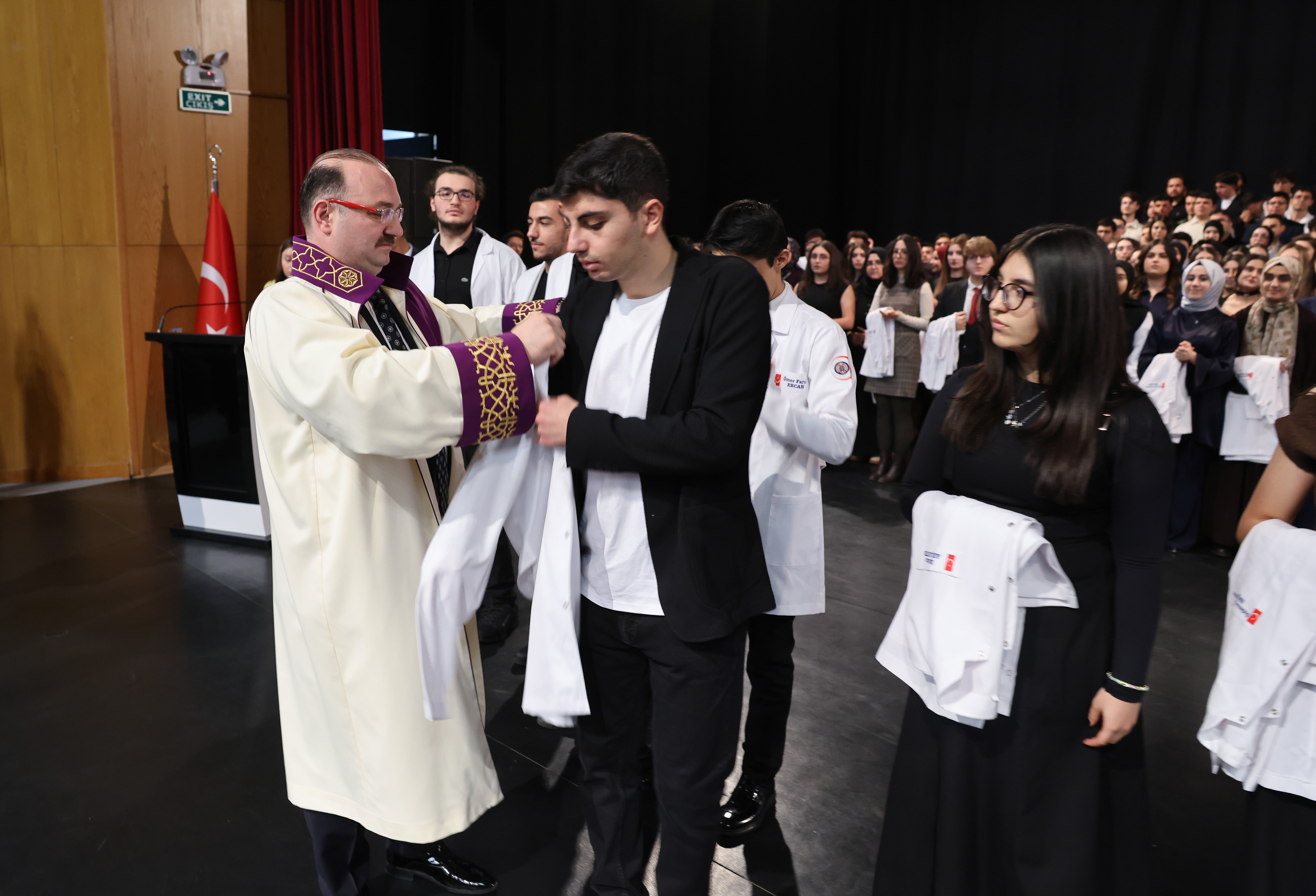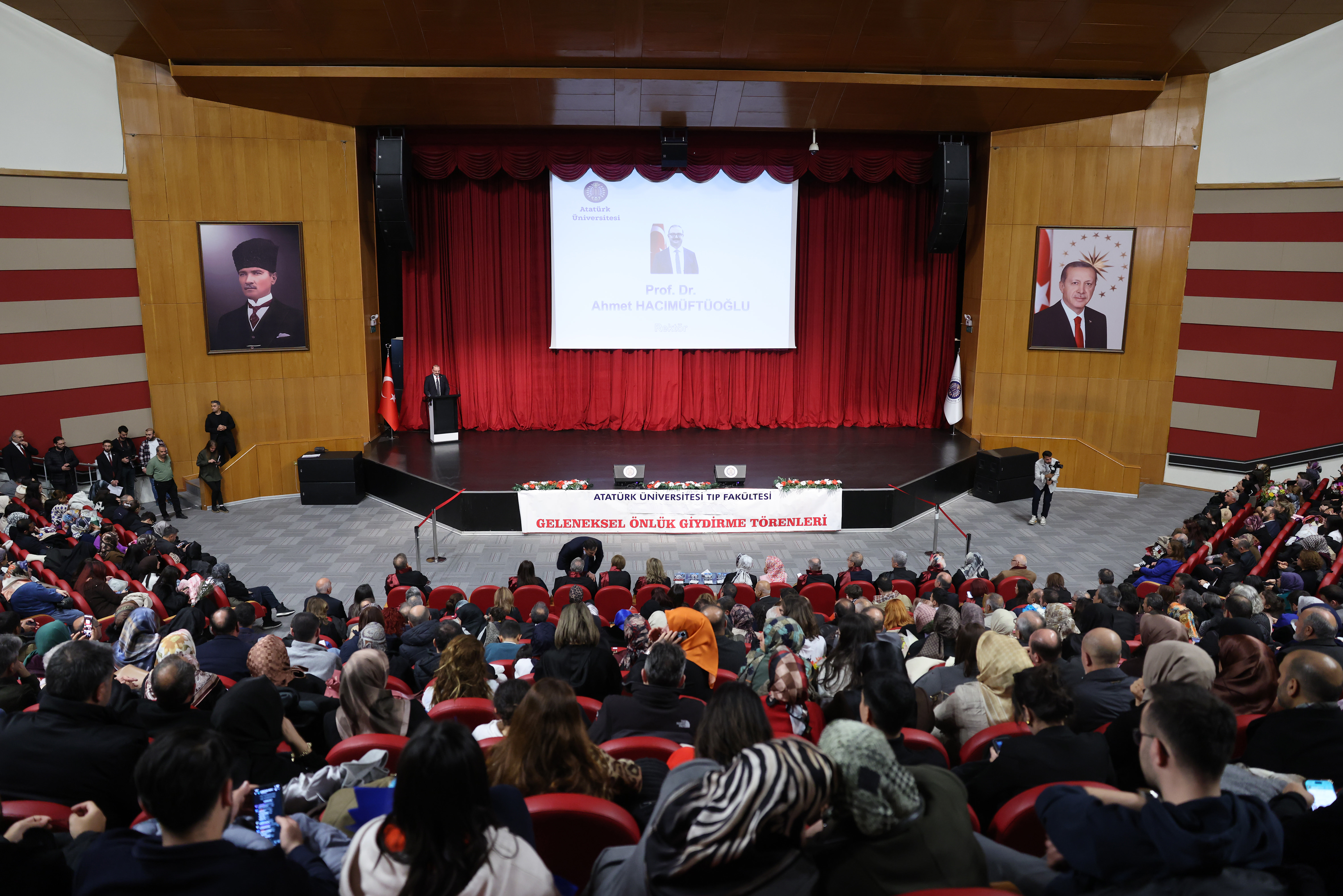 Atatürk Üniversitesi Tıp Fakültesi 1. sınıf öğrencilerine yönelik Geleneksel Önlük Giyme Töreni, 15 Temmuz Milli İrade Salonunda yoğun katılımla gerçekleştirildi. 2025-2026 Akademik Dönemi itibarıyla üniversite hayatına adım atan 316 öğrenci, hekimlik yolculuklarının ilk ve en anlamlı sembollerinden biri olan beyaz önlüğü giymenin gururunu yaşadı.