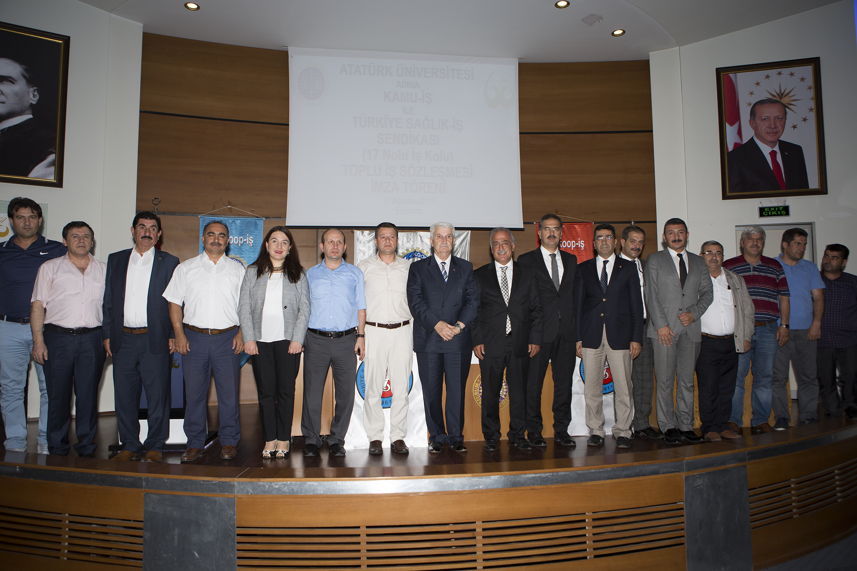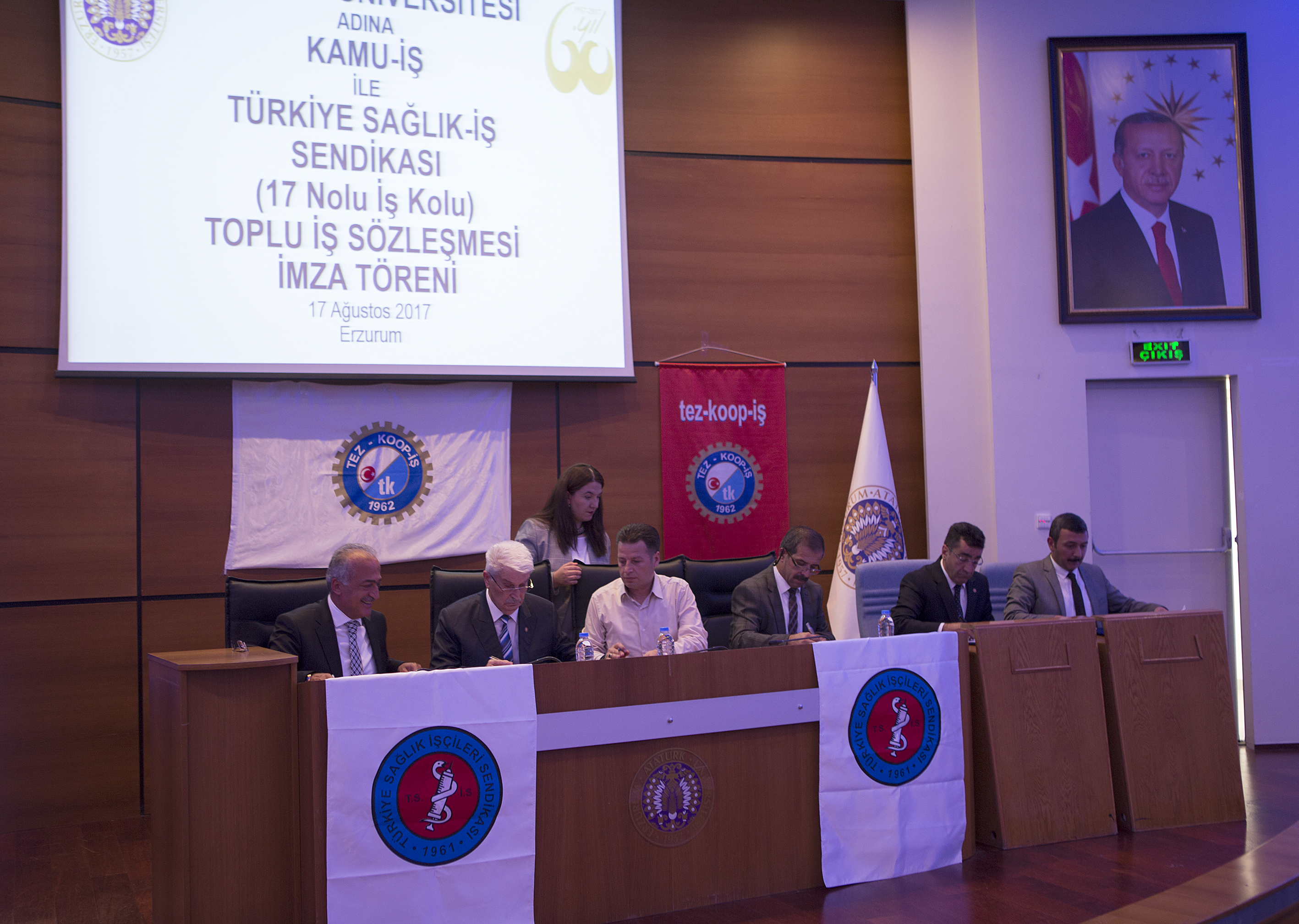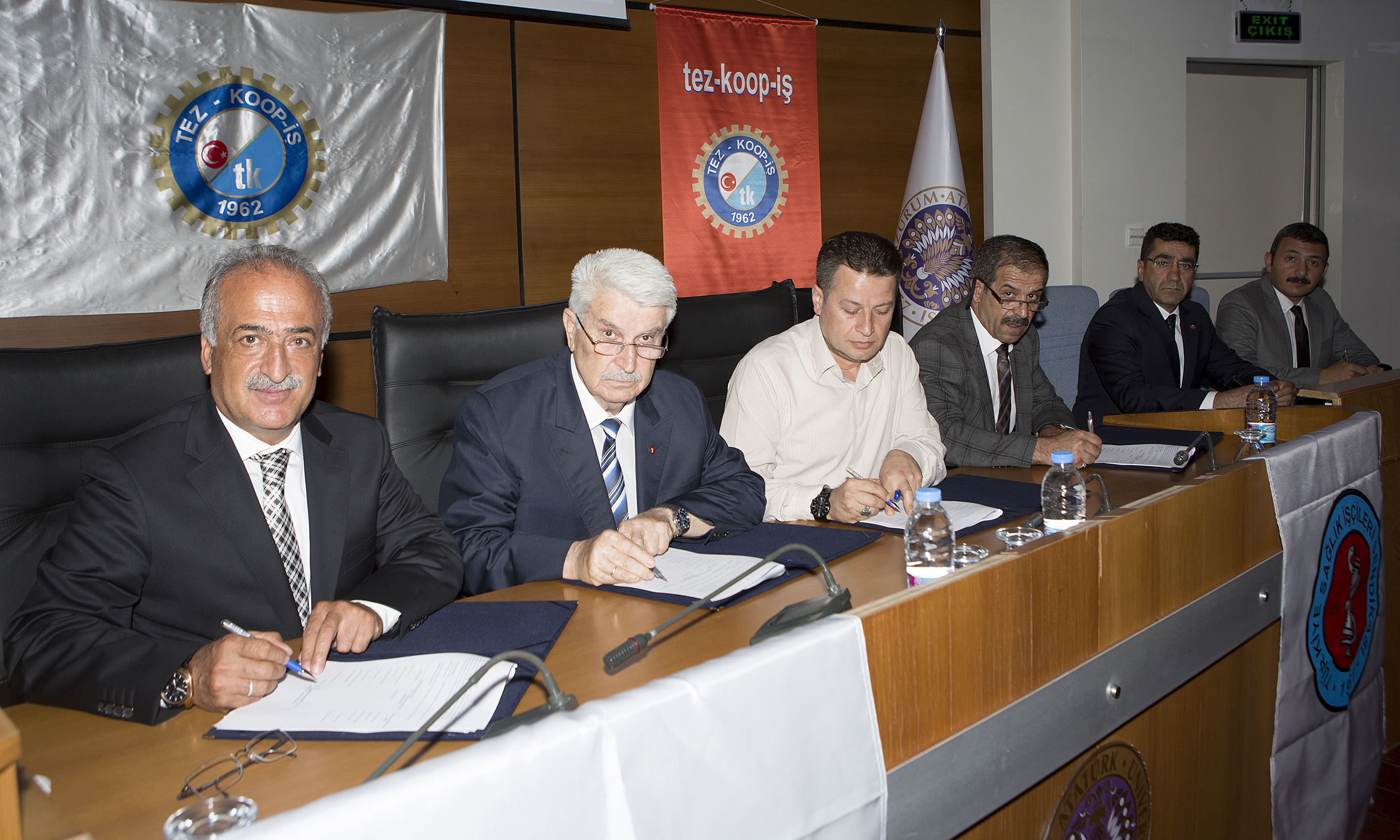 İmza töreninde Atatürk Üniversitesi Rektörü Prof. Dr. Ömer Çomaklı, Türkiye Ticaret Kooperatif Eğitim Büro ve Güzel Sanatlar İşçileri Sendikası (Tez-Koop-İş) Genel Başkanı Haydar Özdemiroğlu ile Türkiye Sağlık İşçileri Sendikası Genel Başkanı Hasan Öztürk hazır bulundu.