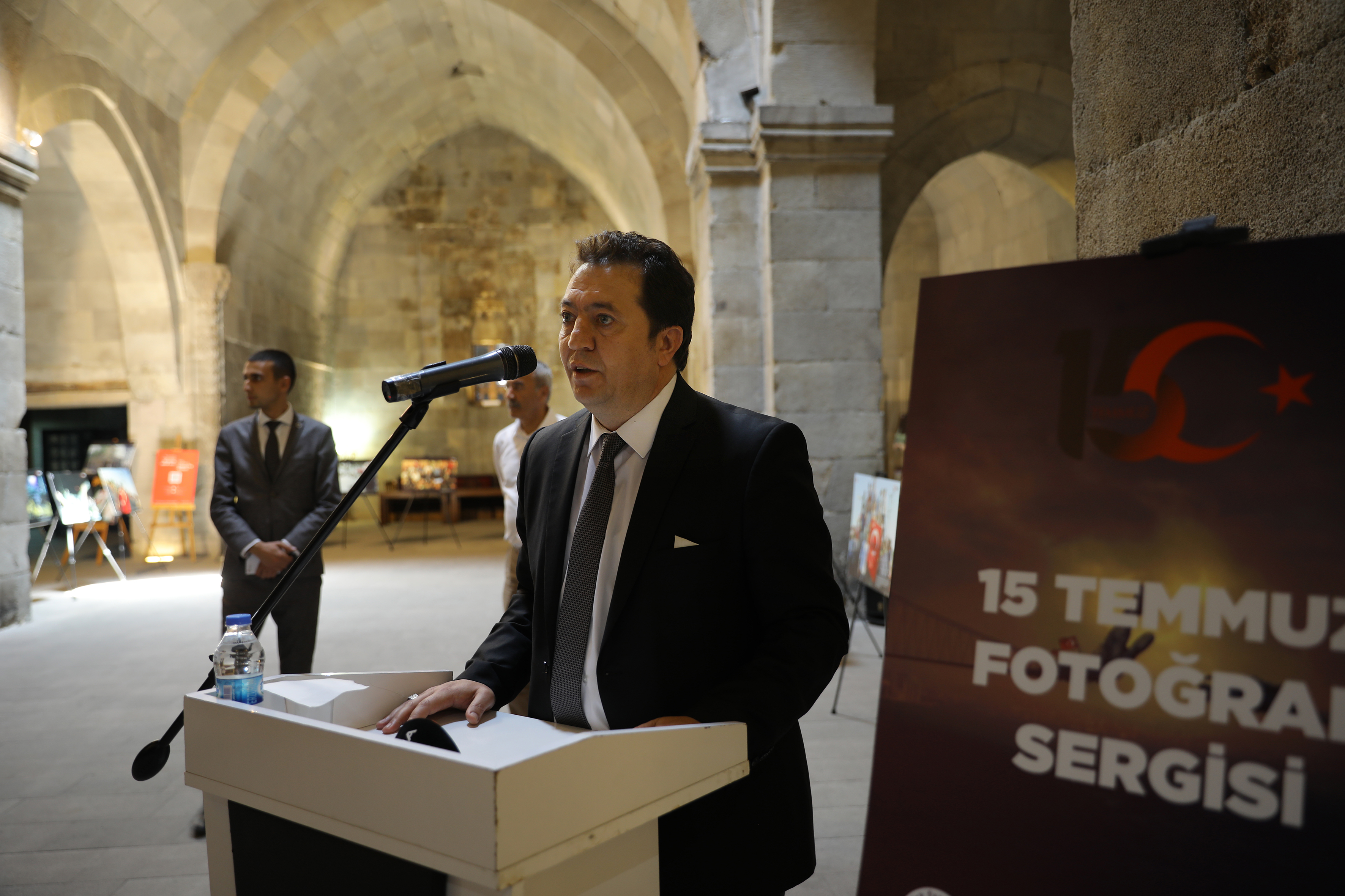15 Temmuz hain darbe girişimi sırasında İhlas Haber Ajansı (İHA) muhabirlerinin çektiği fotoğraflar, Atatürk Üniversitesi Rektörlüğü ve İHA’nın işbirliğiyle tarihi Yakutiye Medresesinde sergilendi.
