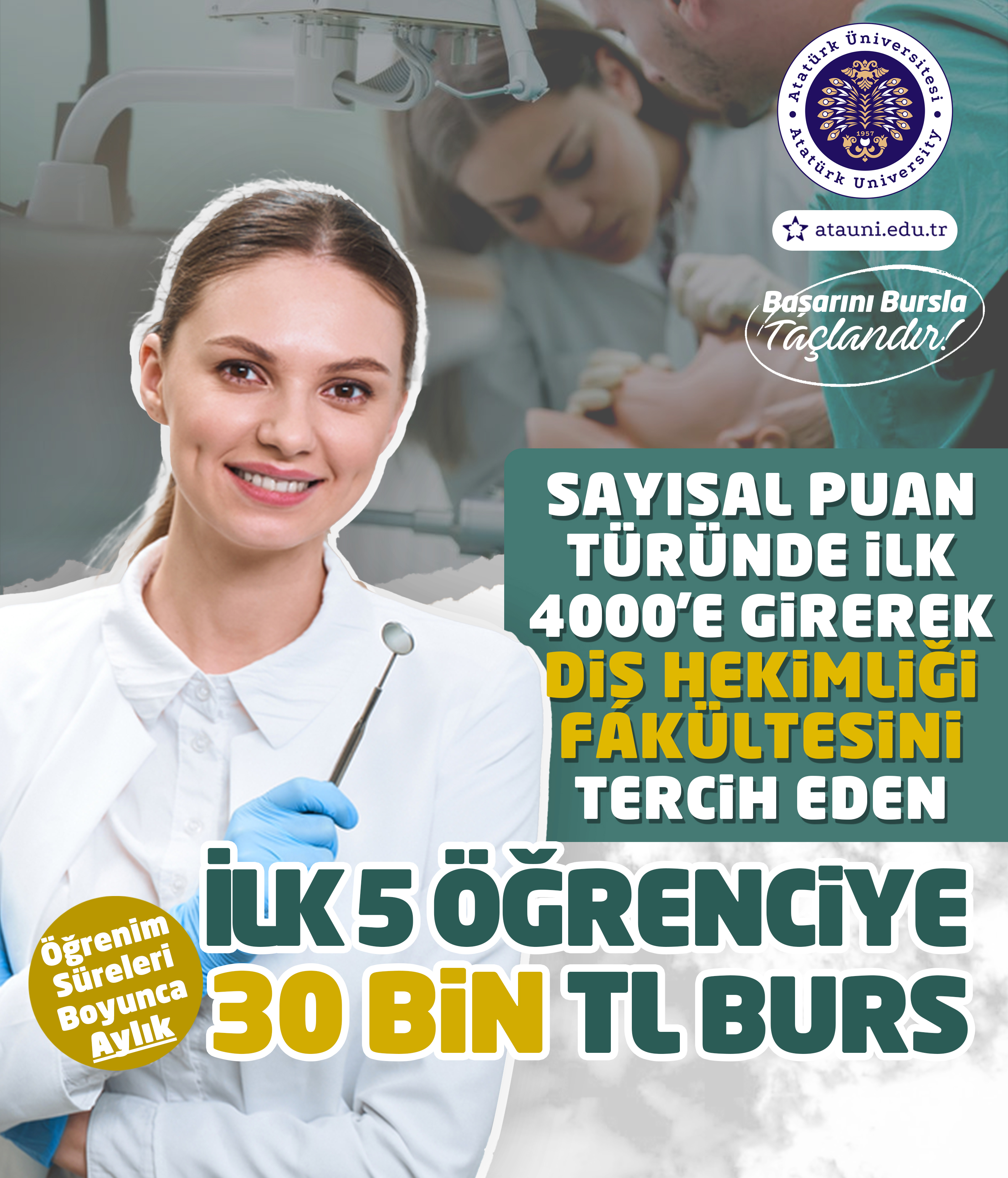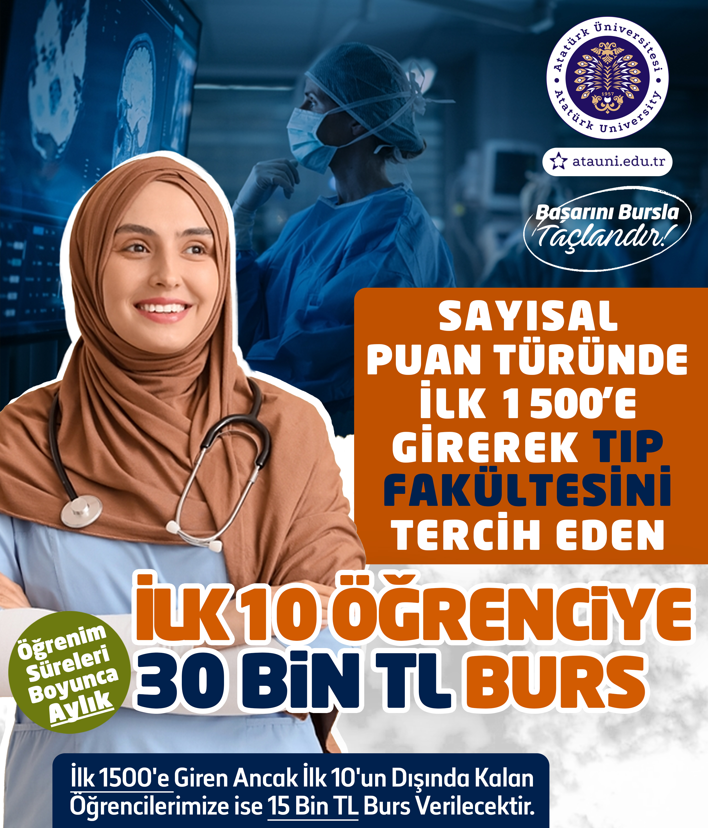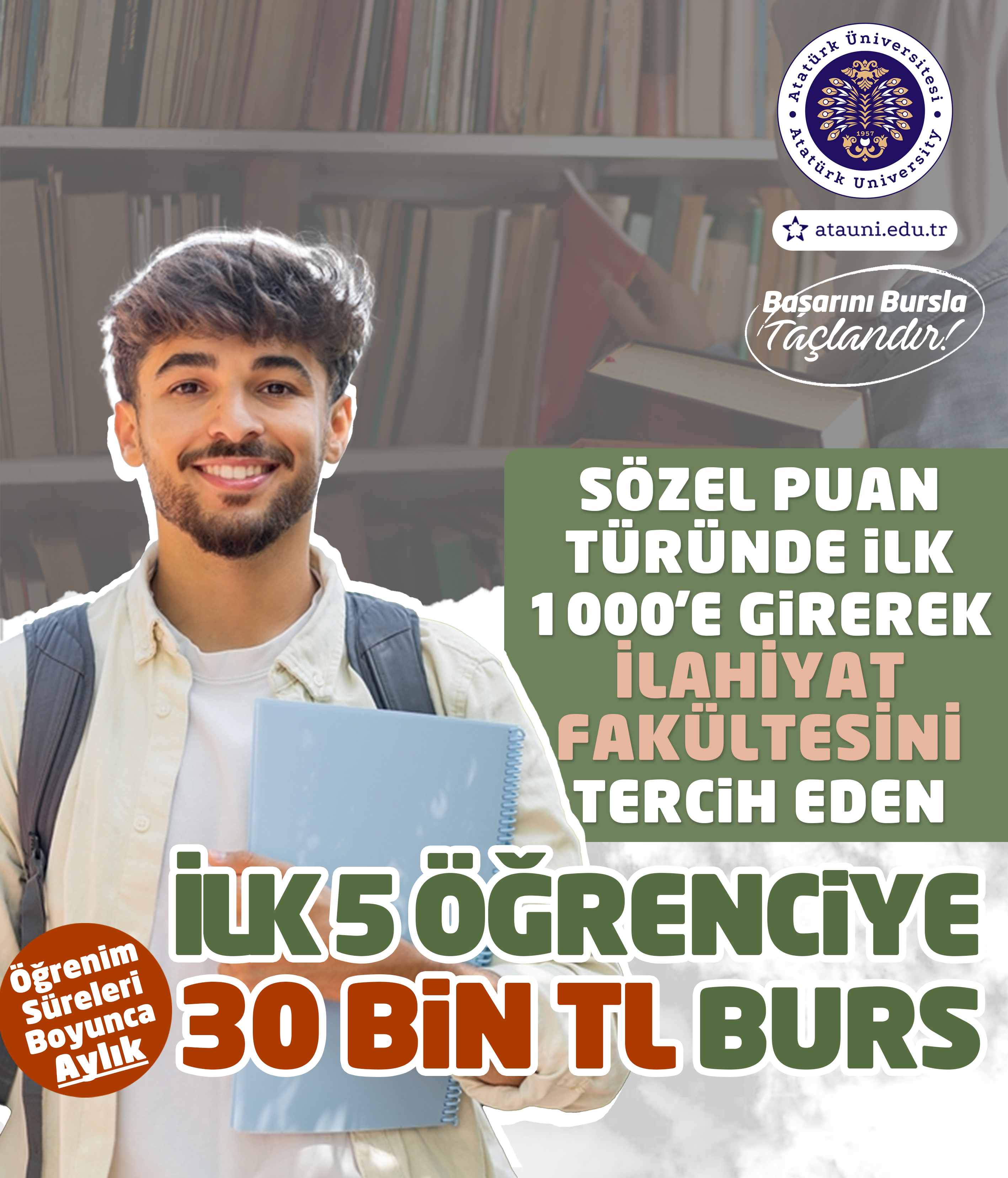 Yeni burs programı; yalnızca ekonomik bir destek sunmakla kalmıyor, aynı zamanda Türkiye’nin dört bir yanındaki başarılı gençleri Atatürk Üniversitesi çatısı altında buluşturmayı amaçlıyor. Tıp, Diş Hekimliği, Eczacılık, Fen, Mühendislik, İletişim ve İlahiyat Fakültelerini kapsayan bu prestijli burs programı ile akademik başarılar güçlü biçimde ödüllendirilecek.