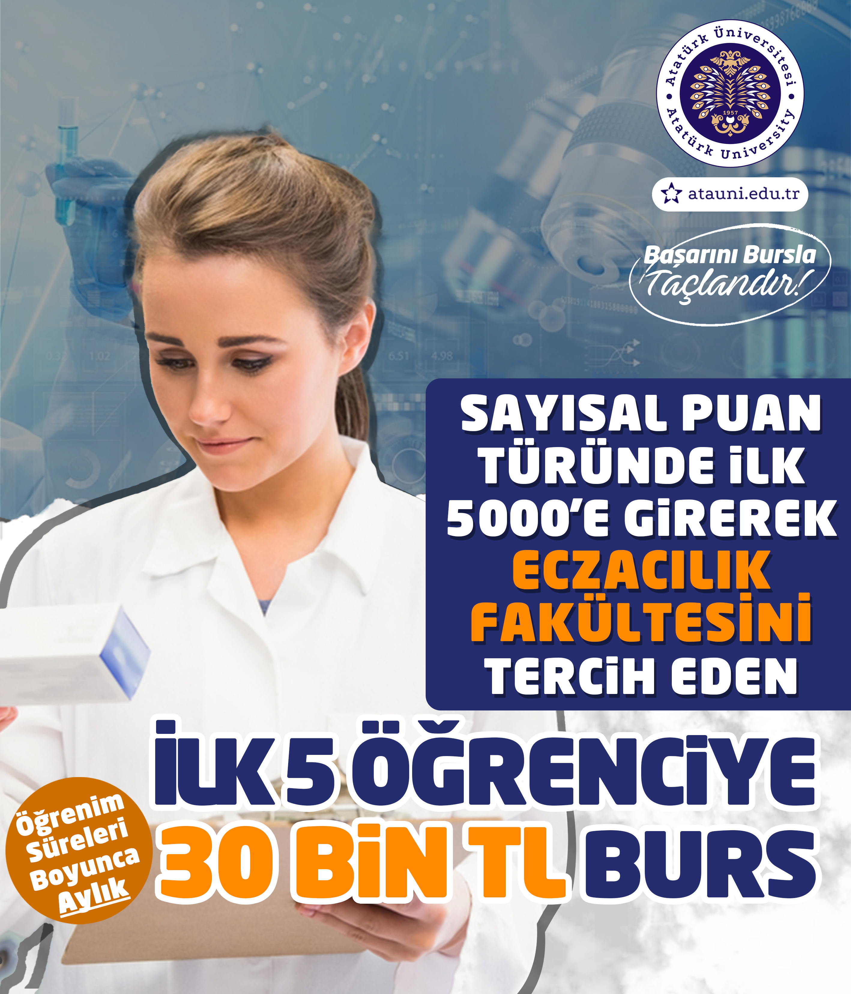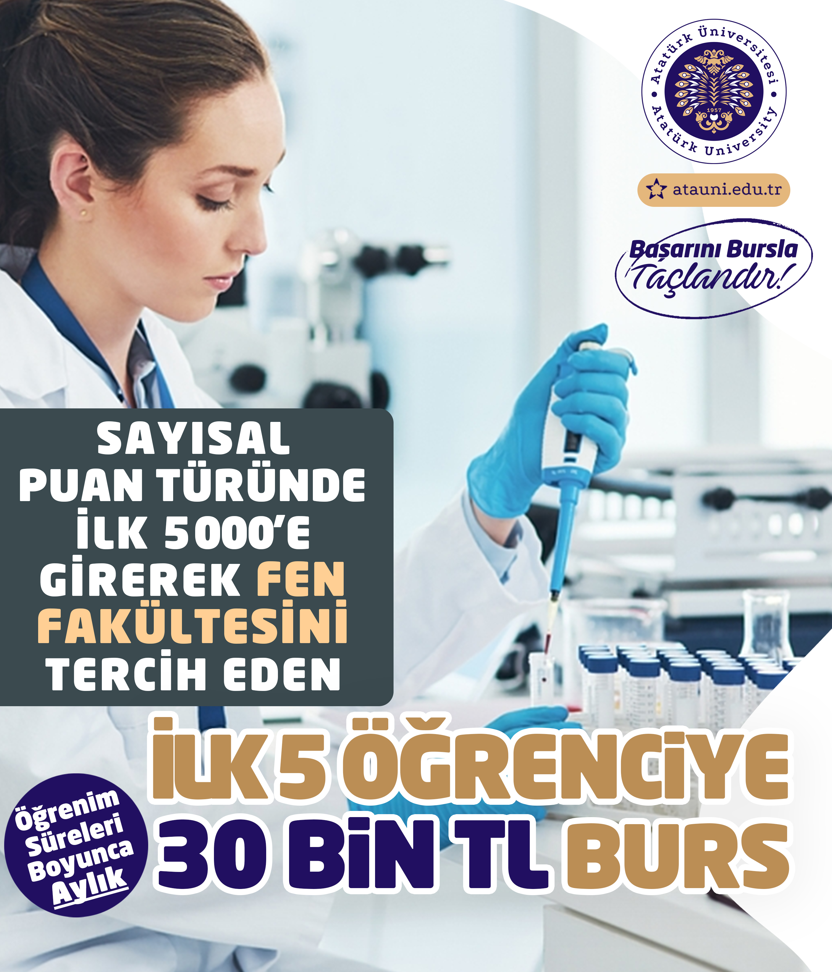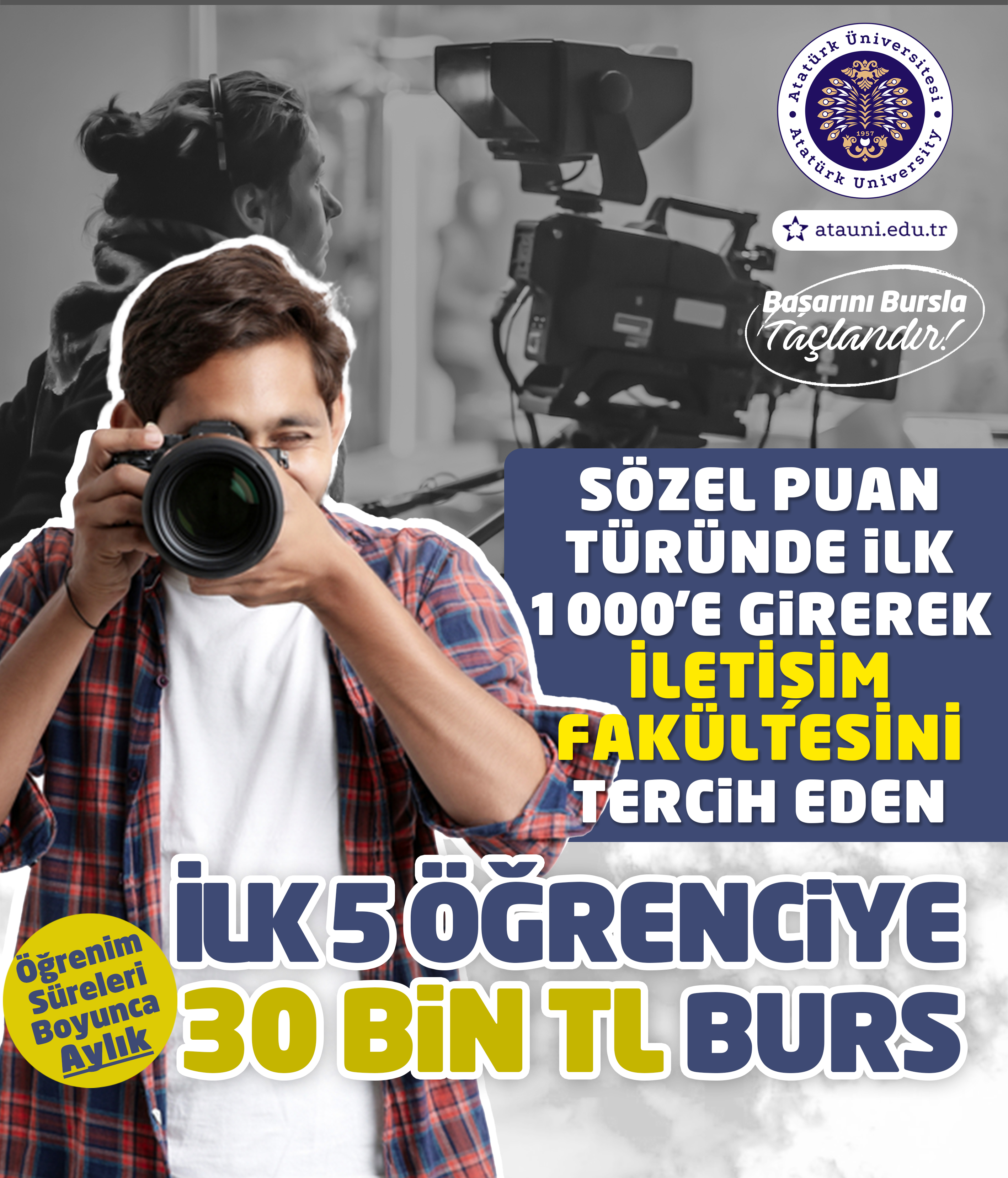 Yeni burs programı; yalnızca ekonomik bir destek sunmakla kalmıyor, aynı zamanda Türkiye’nin dört bir yanındaki başarılı gençleri Atatürk Üniversitesi çatısı altında buluşturmayı amaçlıyor. Tıp, Diş Hekimliği, Eczacılık, Fen, Mühendislik, İletişim ve İlahiyat Fakültelerini kapsayan bu prestijli burs programı ile akademik başarılar güçlü biçimde ödüllendirilecek.
