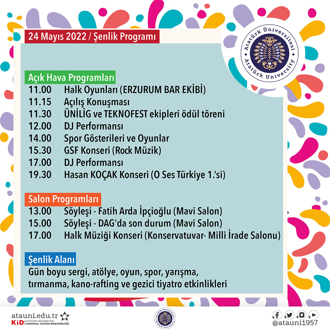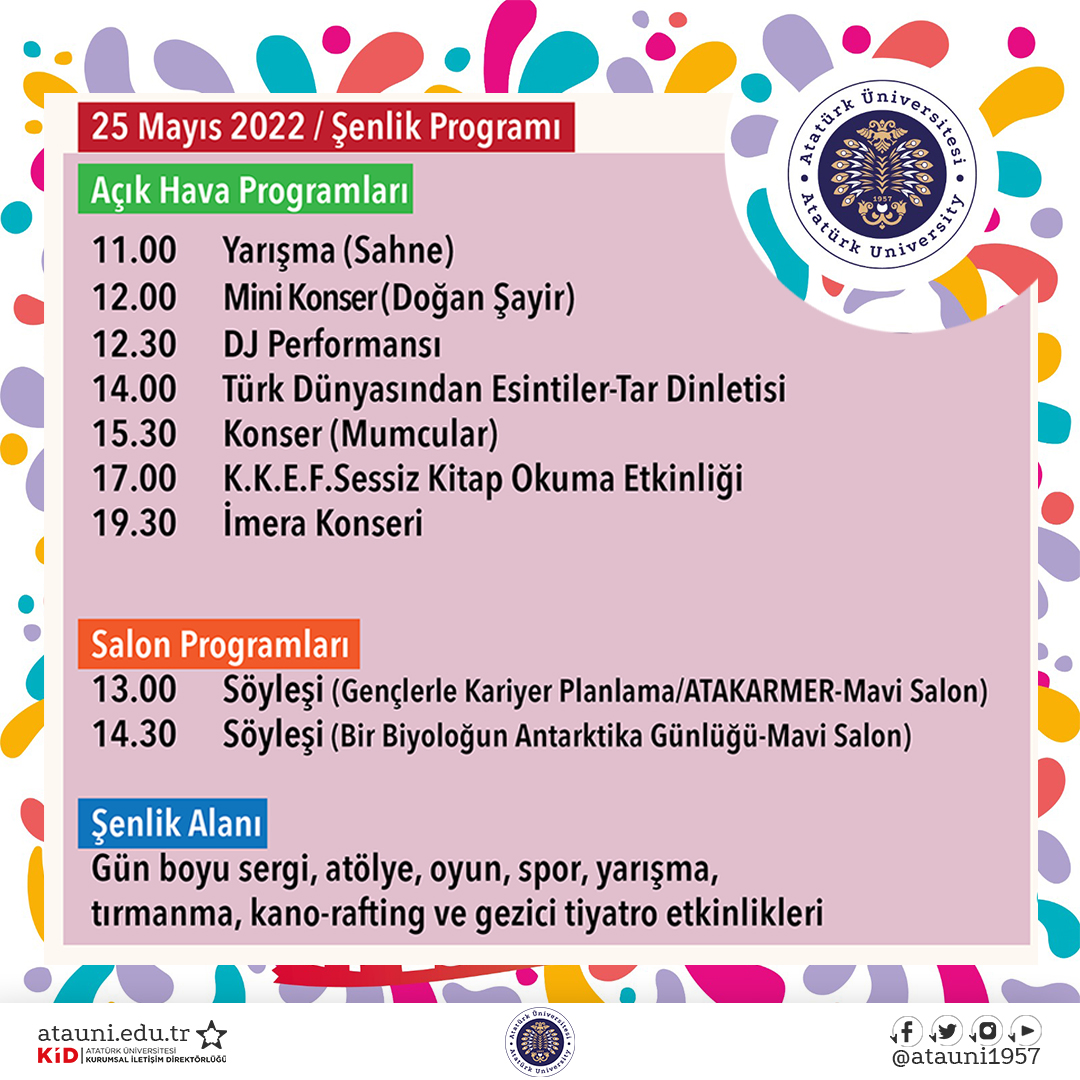Atatürk Üniversitesinin geleneksel olarak düzenlediği Bahar Şenliğinin bu yılki tarihi ve programı belli oldu. 24-26 Mayıs 2022 tarihleri arasında düzenlenecek olan bahar şenliğinde ünlü isimler sahne alarak öğrencilerle buluşacak.