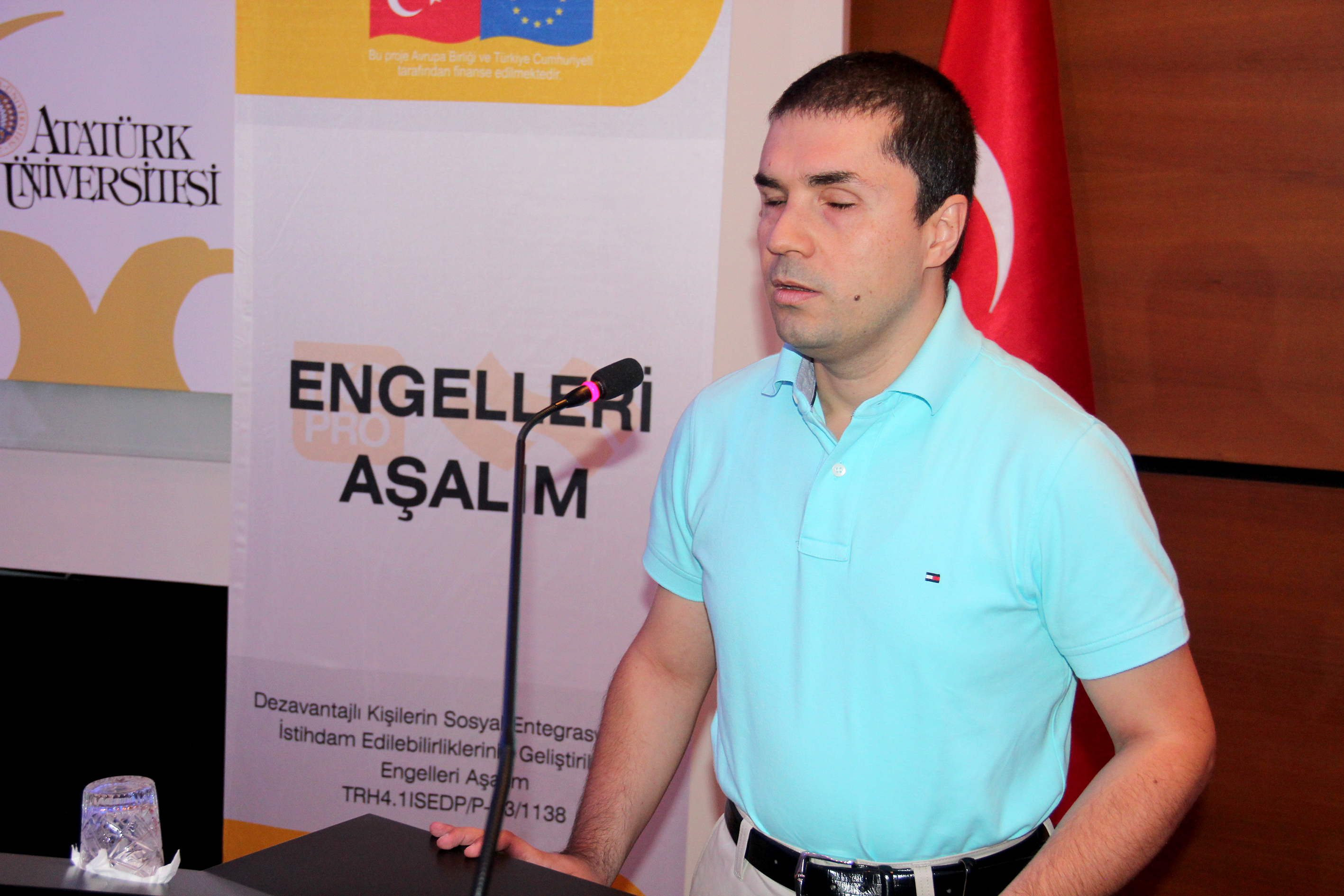 Proje hakkında konuklara bilgi veren Üneş, proje bütçesinin tamamının Avrupa Birliği hibe yardımıyla oluşturulduğunu söyleyerek şöyle konuştu: “2014-2017 yılları arasında çağrıya çıkılan bütçe miktarı 23 milyon Euro. Ülke genelinde toplamda 2 bin 500’e yakın proje ön başvuruya tabii tutuldu ve bunlardan sadece 146’sı kabul gördü. Adından da anlaşılacağı gibi proje sadece engellilere yönelik olmayıp, tüm dezavantajlı grupları içeriyor. En büyük bütçeli projelerden birisi bizim projemiz. Bu kapsamda kabul edilen tek dezavantajlı üniversite projesi de yine bizim projemiz. Atatürk Üniversitesi ile Kastamonu Üniversitesi tarafından ortaklaşa yürütülen Engelleri Aşalım Projesi tek üniversite projesi olarak yer alıyor. Geri kalan tüm projeler dernekler ve vakıflara ait. Projemizin asli amacı mesleki eğitimde engeller hususu ve kariyer planlama ile insan kaynağı hakkında destekler vermektir. Aynı zamanda engellilerin, mesleki eğitim seçiminde kariyer planlamalarını doğru yapıp doğru işe yönlendirmelerini sağlamaktır. Ayrıca bu kapsamda geliştirilecek eğitim modüllerinin, hazırlanan bir platform vasıtasıyla tüm Türkiye’deki engelli ve engelli yakınlarına ücretsiz olarak sağlanmasıdır ” dedi.