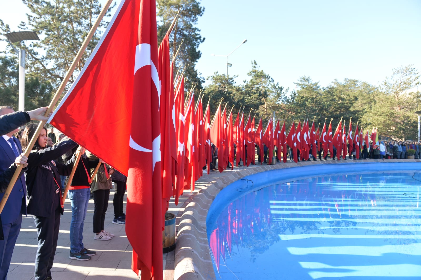 Atatürk’ü anma programı Havuzbaşında bulunan Atatürk Anıtına çelenklerin sunulmasıyla başladı. Saatler 09:05’i gösterdiğinde sirenler eşliğinde iki dakikalık saygı duruşunda bulunuldu. Ardından okunan İstiklal Marşıyla bayraklar yarıya indirildi. Devlet erkânının hazır bulunduğu törene, Atatürk Üniversitesi Rektörü Prof. Dr. Ömer Çomaklı da iştirak etti.
