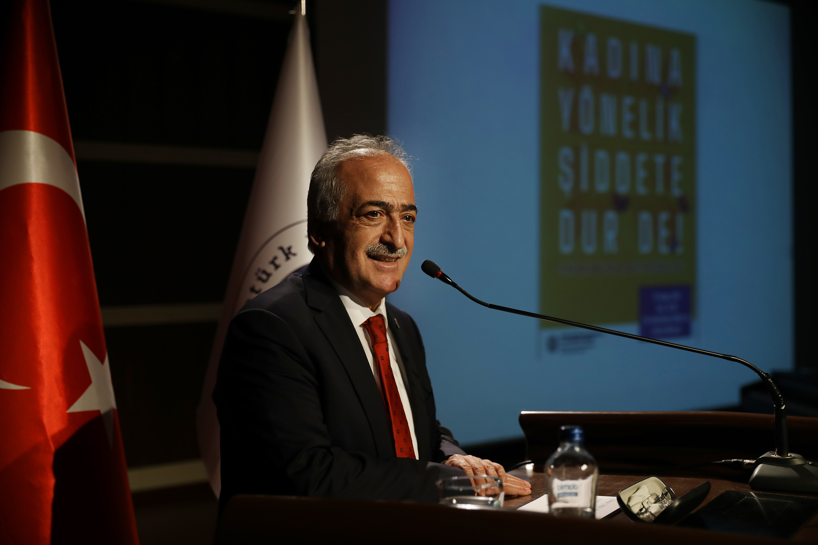 Ardından programın açılışını yapmak üzere salona geçen Rektör Çomaklı burada konuklara seslendi. Kadına yönelik şiddetin tüm dünyada çok yaygın olarak karşılaşılan bir problem olduğuna işaret eden Rektör Çomaklı, Dünya Sağlık Örgütü’nün yayımladığı rapora göre, dünyadaki kadınların %35’inin şiddete maruz kaldığını aktardı.