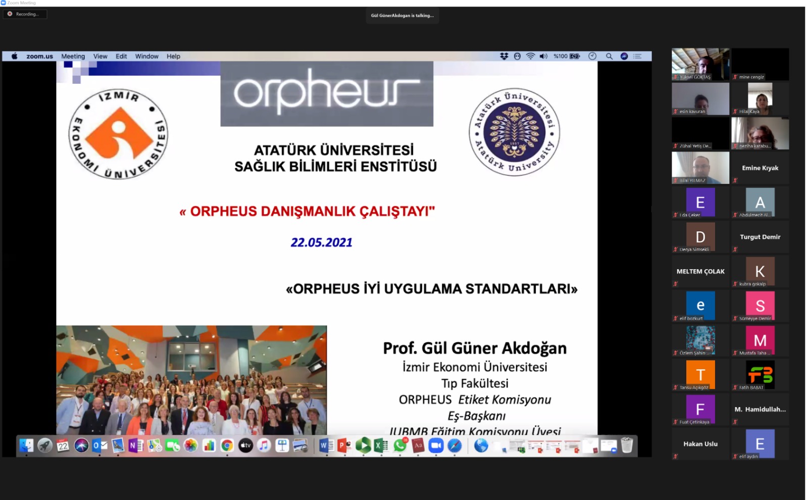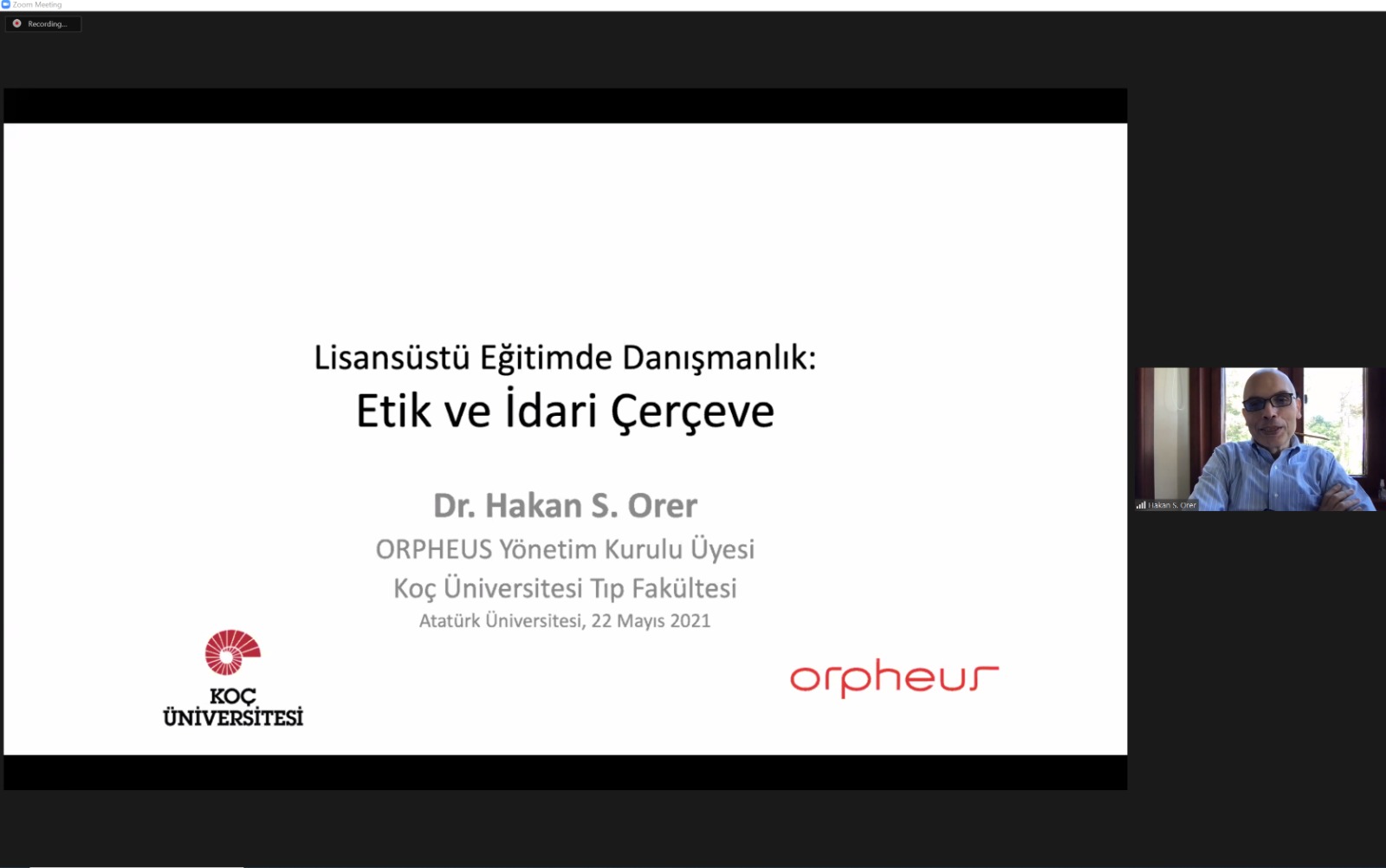Sağlık Bilimleri Enstitü Müdürü Prof. Dr. Elif Çadırcı ve Atatürk Üniversite Rektör Yardımcısı Prof. Dr. Mustafa Sözbilir’in açılış konuşmalarıyla başlayan çalıştay, davetli konuşmacılar ORPHEUS Etiket Komisyonu Eş-Başkanı Prof. Dr. Gül Güner Akdoğan’ın “ORPHEUS İyi Uygulamaları”, ORPHEUS Yönetim Kurulu Üyesi Prof. Dr. Hakan Orer’in “Lisansüstü Eğitimde Danışmalık (Etik ve İdari Çerçeve)” ve ORPHEUS Türkiye Büyükelçisi Prof. Dr. Feyza Arıcıoğlu’nun “Danışmanın Rolü ve Yükümlülükleri” konulu oturumları ile devam etti.