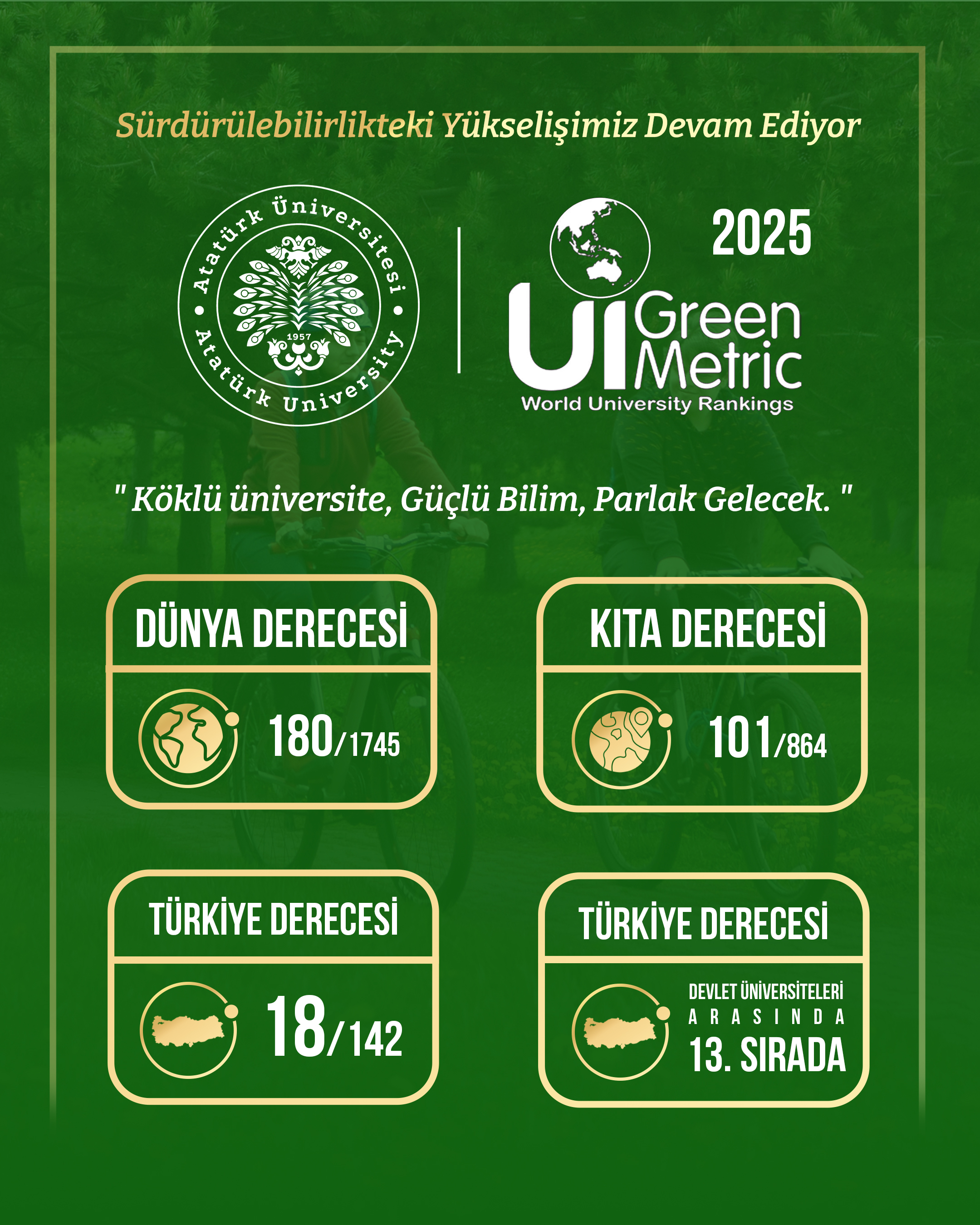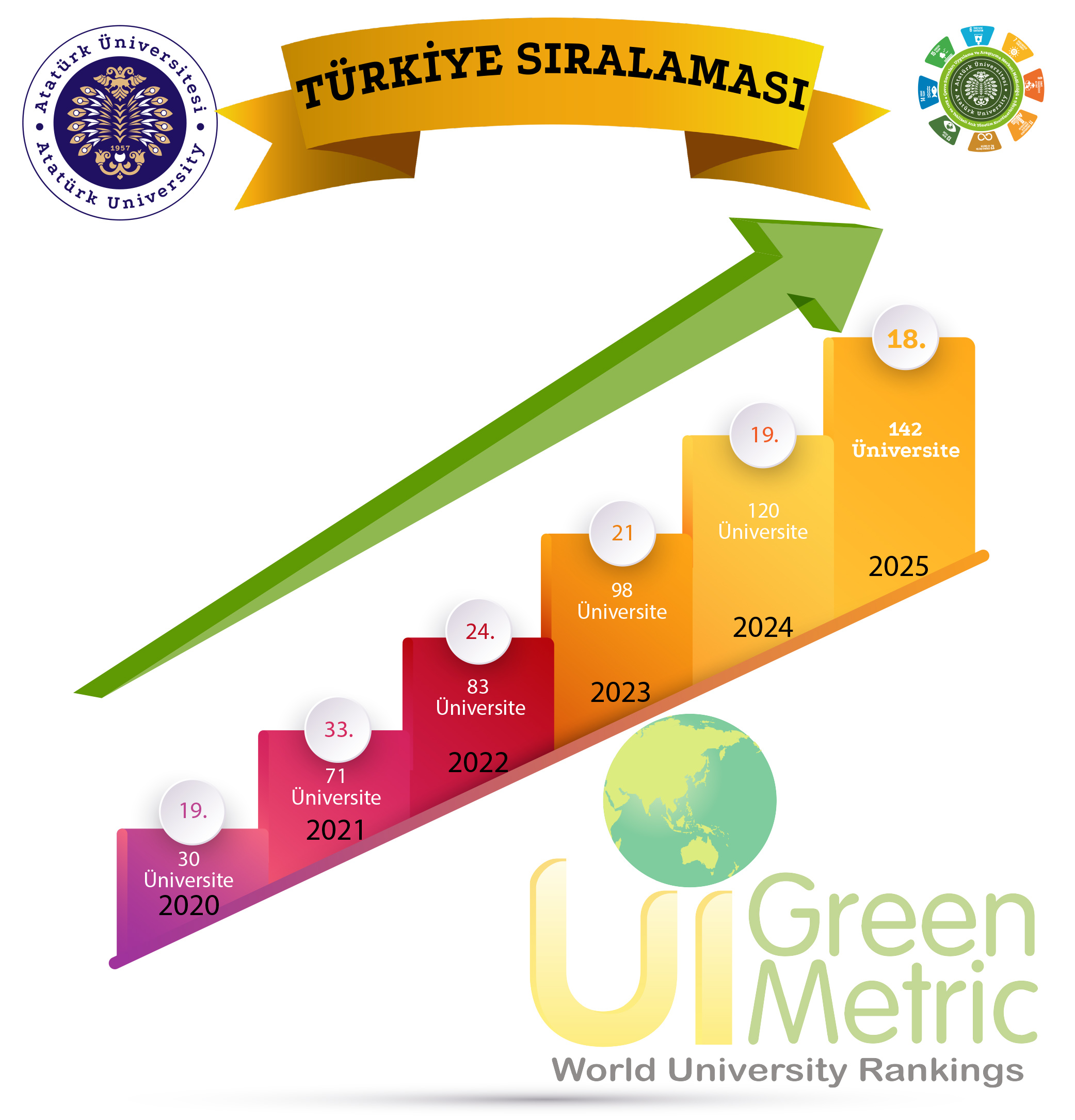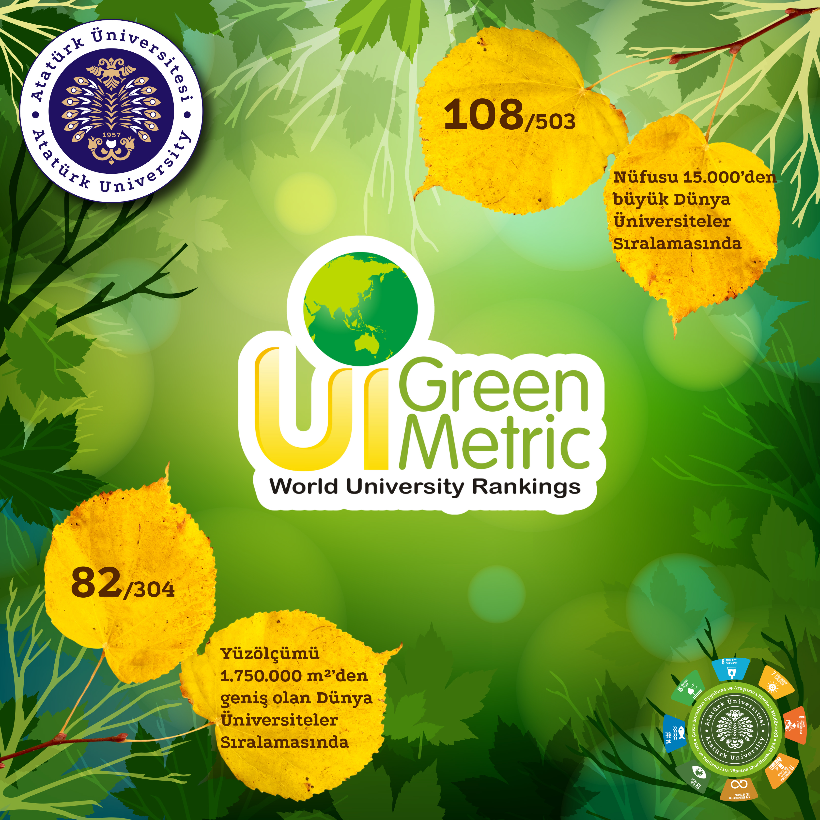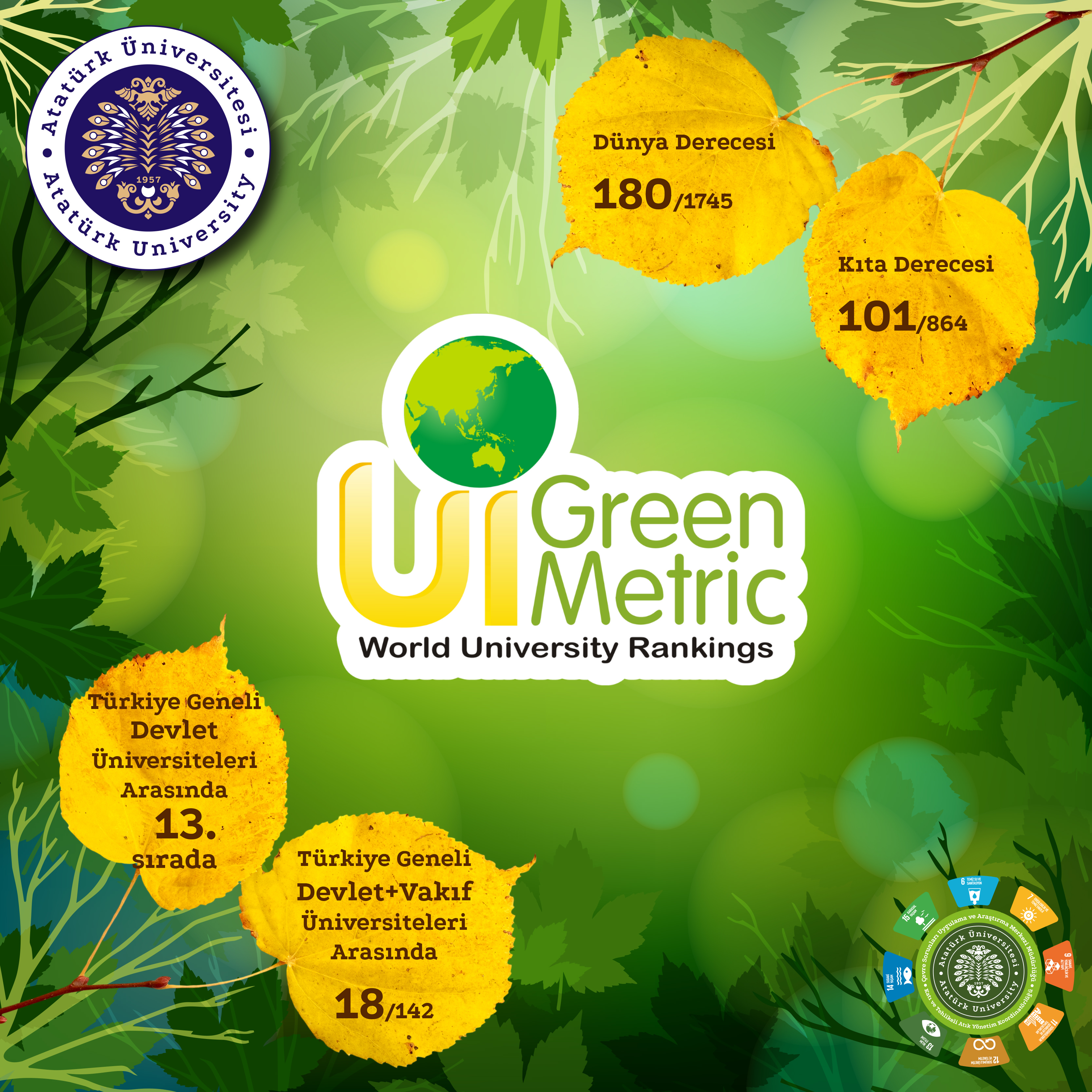 Başvuru süreci 2021 yılından bu yana Atatürk Üniversitesi Çevre Sorunları Uygulama ve Araştırma Merkezi tarafından yürütülen UI GreenMetric sıralamasının 2025 sonuçları, Tayvan National Chi Nan University (NCNU) ev sahipliğinde kamuoyuyla paylaşıldı. Açıklanan verilere göre Atatürk Üniversitesi, 5. yılında da istikrarlı yükselişini sürdürerek dünya genelinde 66 basamak birden ilerledi ve 180. sıraya yerleşti. Coğrafi konum itibarıyla Asya Kıtasında değerlendirilen üniversiteler arasında 101’inci, Türkiye’den katılan 142 üniversite arasında 18’inci, devlet üniversiteleri arasında ise 13’üncü sıraya yükseldi.
