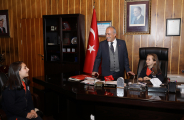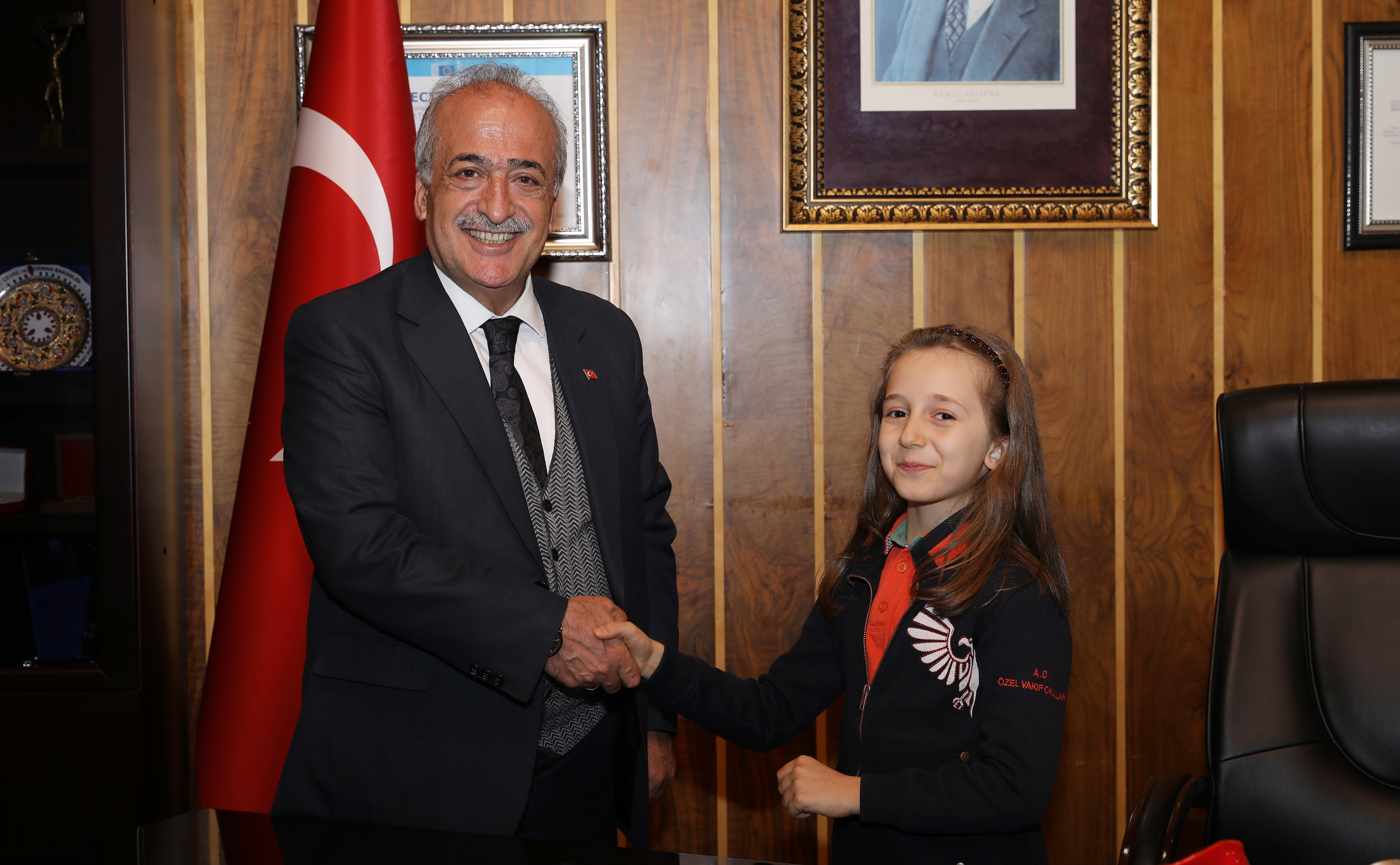 Rektörlük koltuğunu Çomaklı’dan devralan ilkokul 3. sınıf öğrencisi Zeynep Mavi, Prof. Dr. Çomaklı’dan Yeni Nesil Üniversite Tasarım ve Dönüşüm Projesi hakkında bilgi aldı.