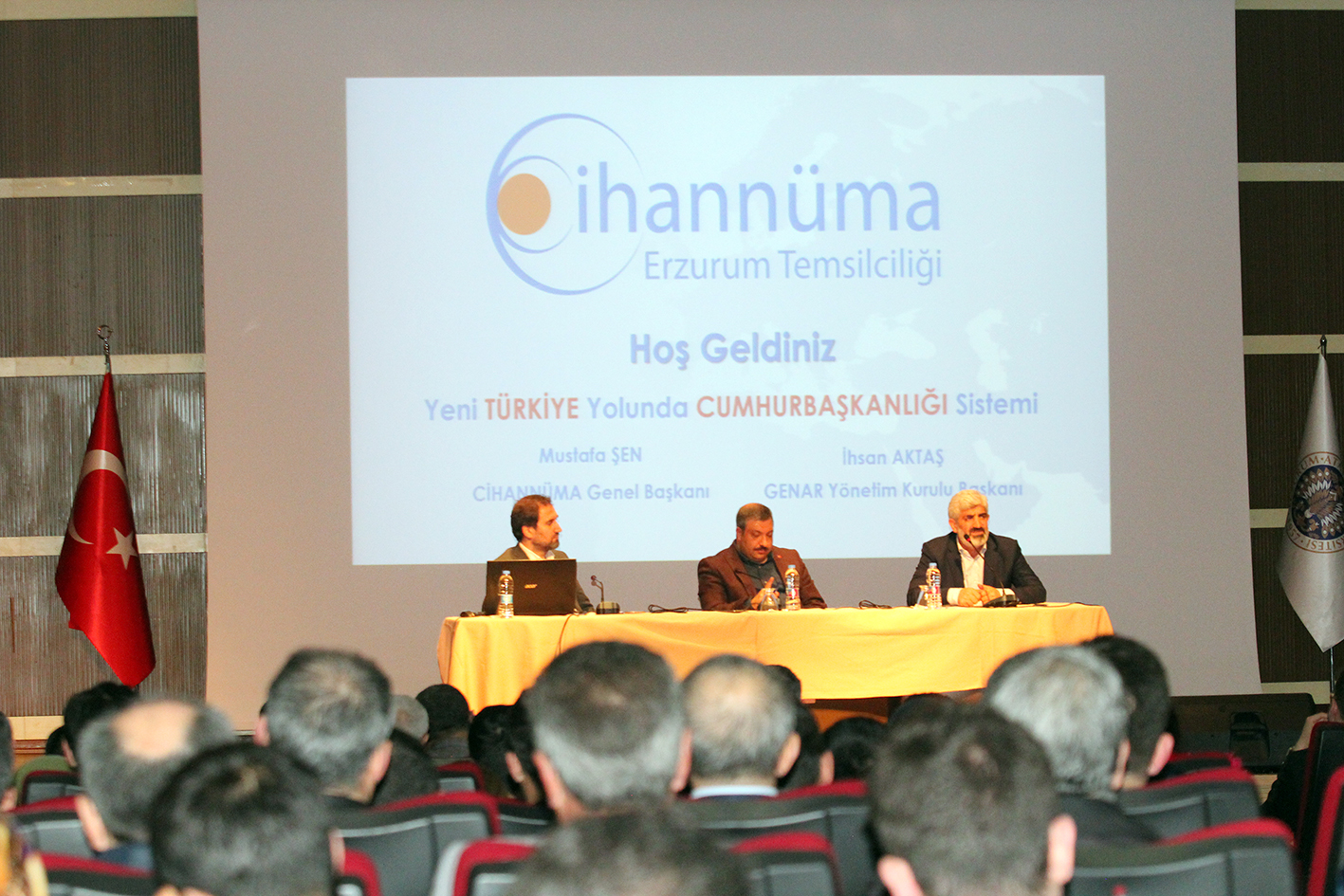 Konuklar daha sonra, “Yeni Türkiye Yolunda Cumhurbaşkanlığı Sistemi” konulu konferansı vermek üzere Atatürk Üniversitesi Kültür Merkezi 15 Temmuz Milli İrade Salonu’na geçerek konuşmalarını yaptılar.