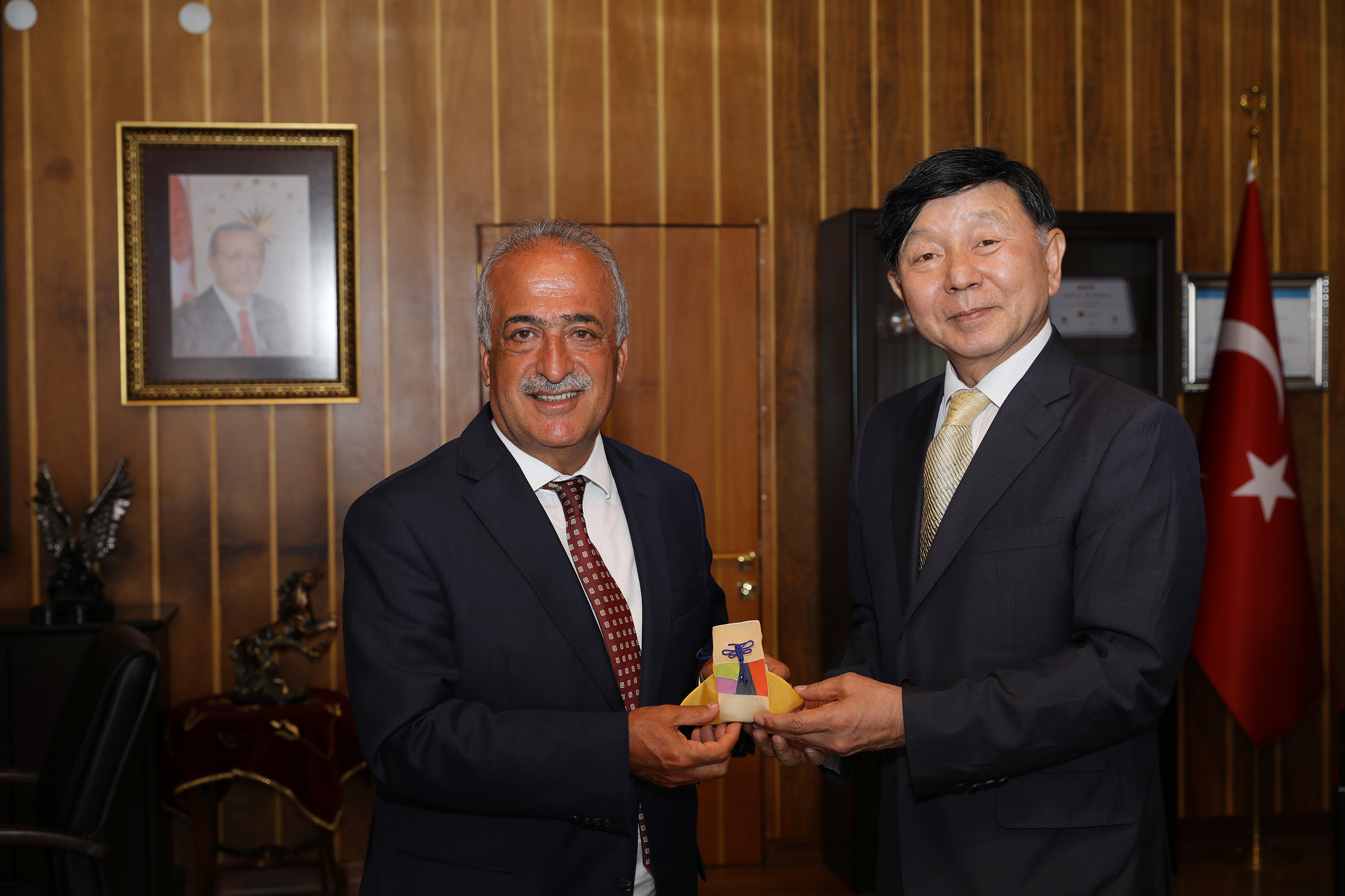 Konuğu Jae Han Shim’i Rektörlük makamında ağırlayan Prof. Dr. Çomaklı, Atatürk Üniversitesi Tıp Fakültesi Tıbbi Farmakoloji Anabilim Dalı ile SCI kapsamında şu ana kadar 13 bilimsel yayını bulunan Chonnam Üniversitesi ile bugüne kadar birçok çalışmayı ortaklaşa olarak yürüttüklerini belirterek, gerçekleşen anlaşma sayesinde mevcut verimli ilişkilerin tüm bölümlere yayılacağına dikkat çekti.