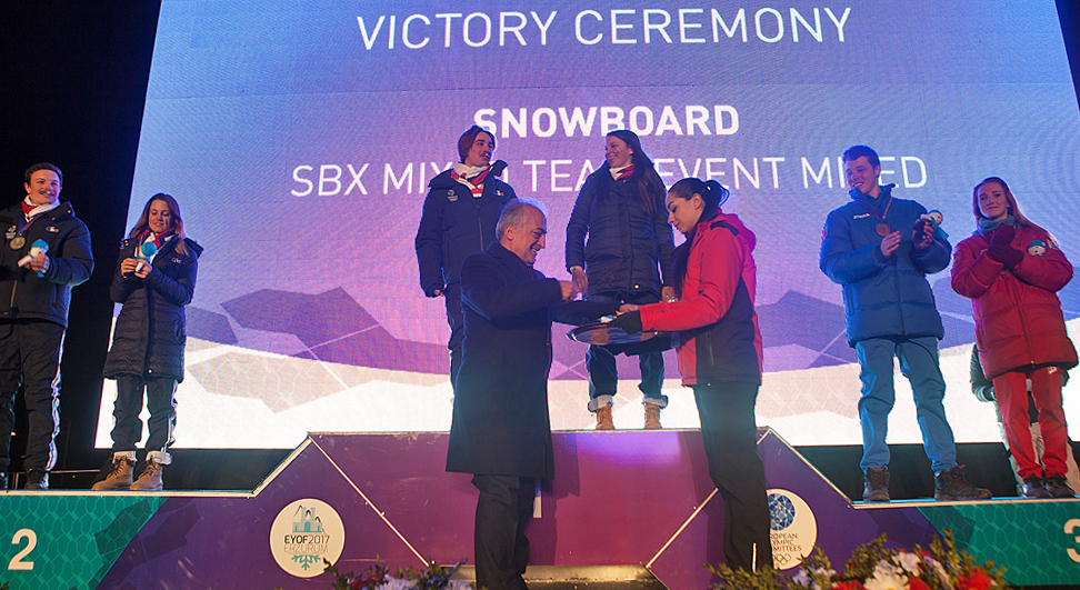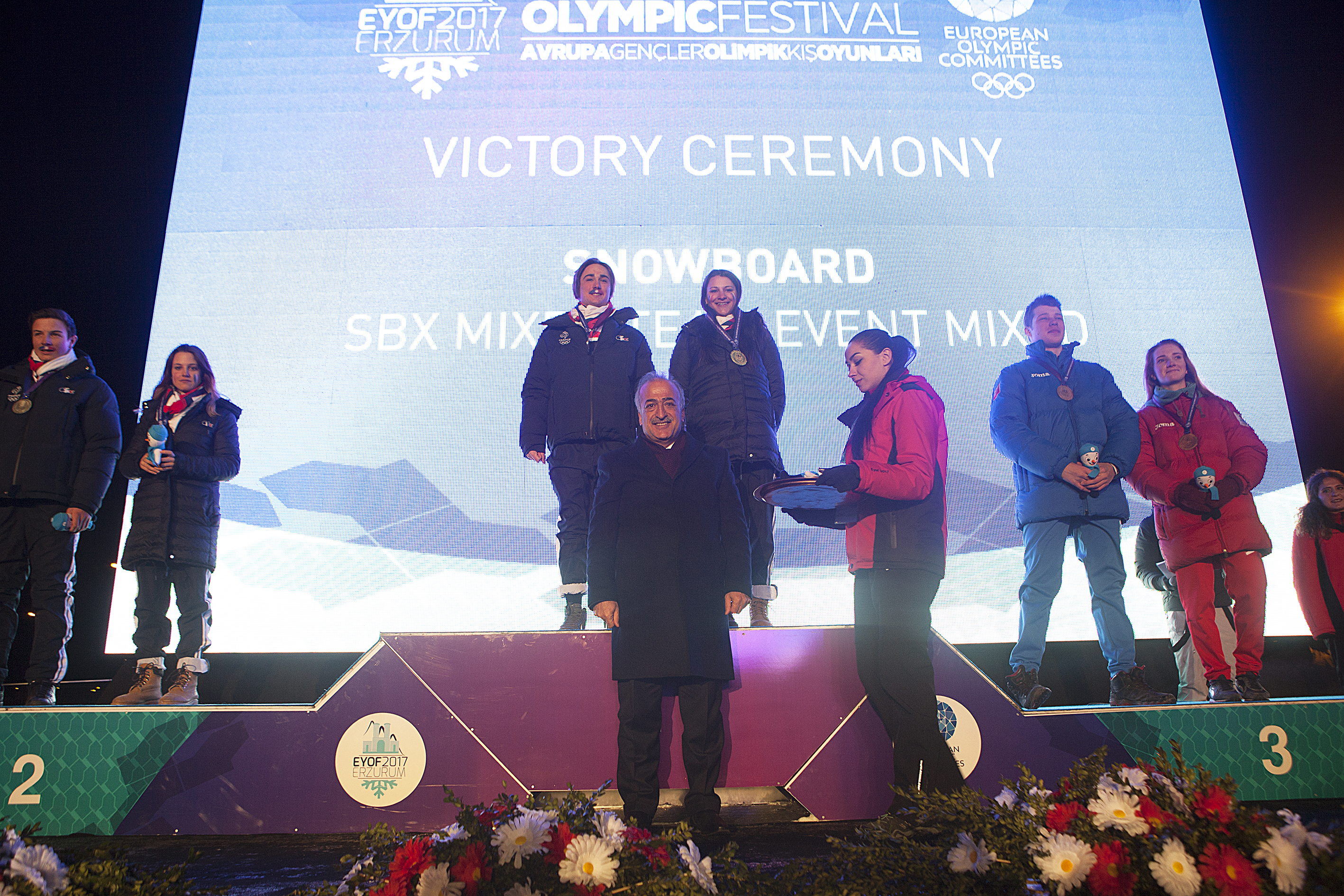 Avrupa Gençlik Olimpik Kış Festivali’nde (EYOF) snowboard müsabakaları sona erdi. Dereceye giren sporculara madalyalarını Atatürk Üniversitesi Rektörü Prof. Dr. Ömer Çomaklı verdi.