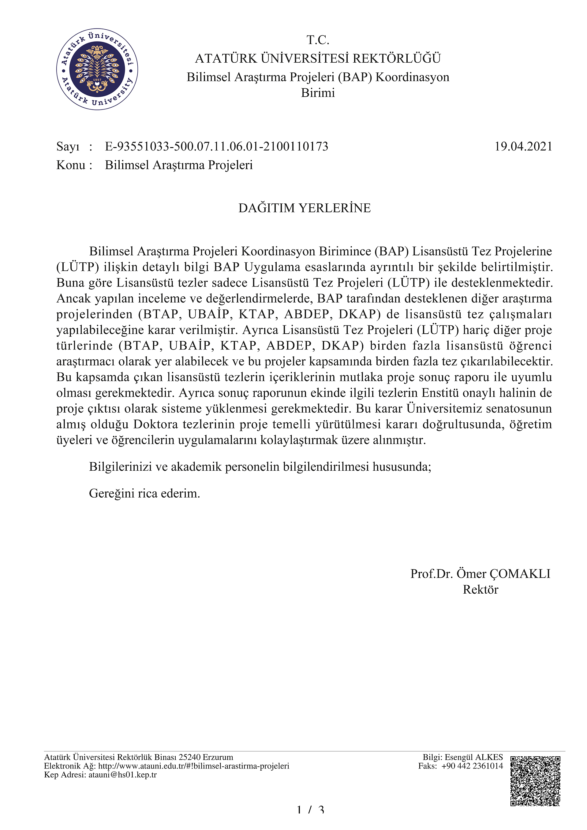 -Ayrıca Bilimsel Araştırma Projeleri (BAP) Koordinasyon Birimi'nin 19.04.2021 tarihli bu konudaki yazısı ise şöyledir: