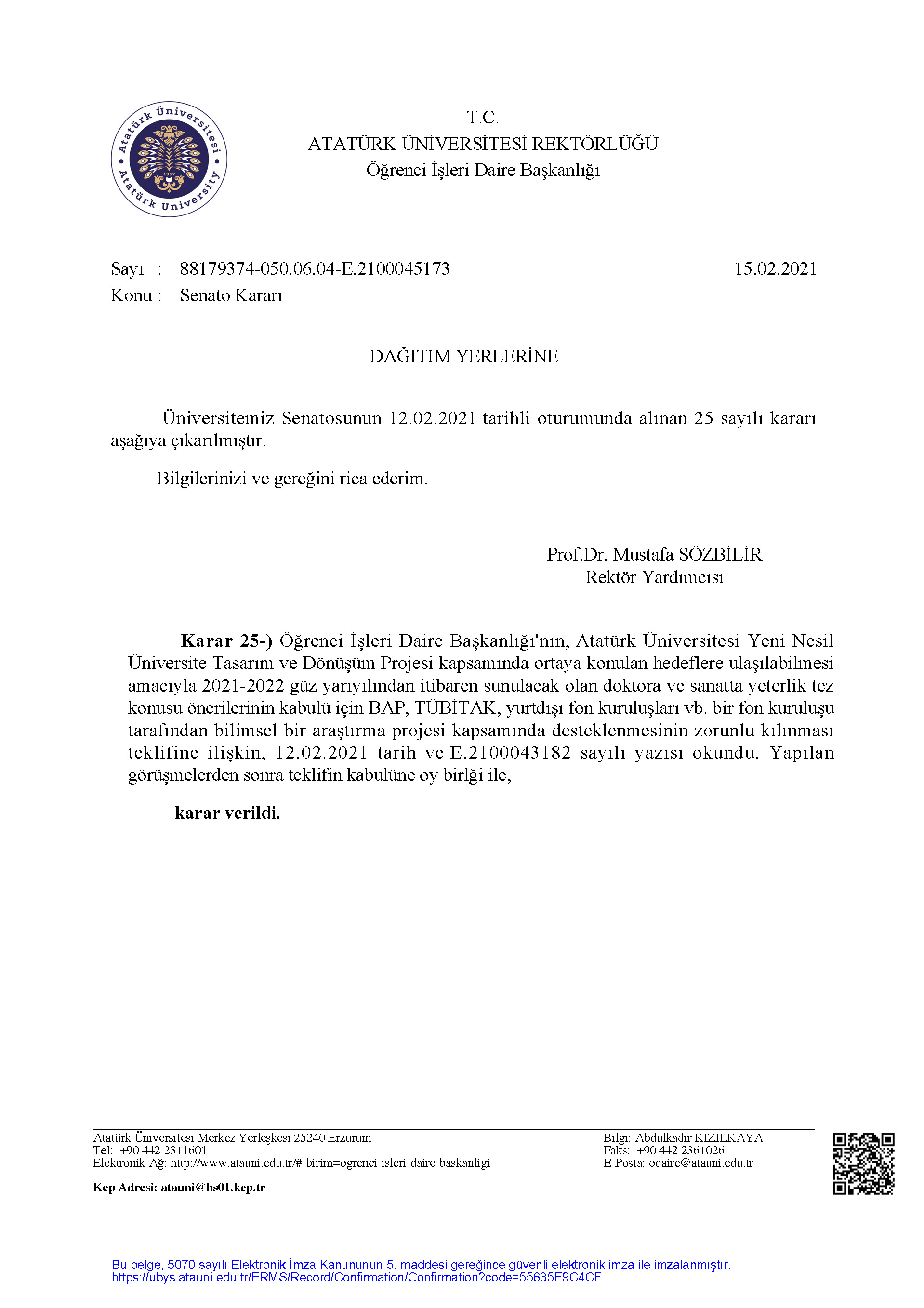 Üniversite Senatosunun 12.02.2021 tarihli oturumunda alınan 25 sayılı kararı gereğince; 2021-2022 Güz Yarıyılından itibaren sunulacak olan doktora tez konusu önerilerinin kabulü için BAP, TÜBİTAK, yurtdışı fon kuruluşları vb. bir fon kuruluşu tarafından bilimsel bir araştırma projesi kapsamında desteklenmesi zorunlu kılınmıştır. 2021-2022 Güz Yarıyılından itibaren doktora tez konusu önerilerini sunacak öğrencilerimizin bu durumu göz önüne almaları önemle rica olunur.