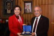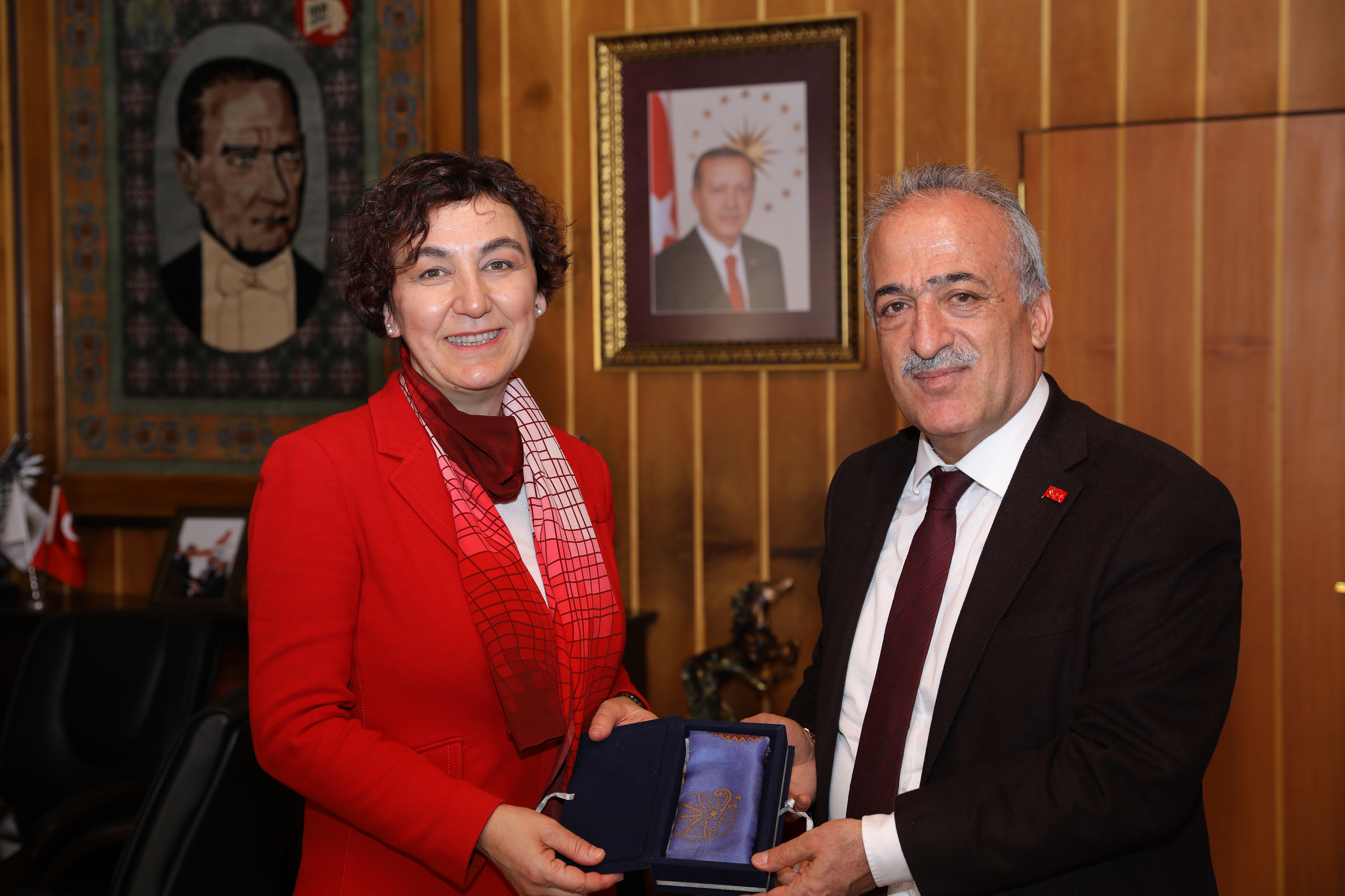 Rektör Çomaklı ziyaretin ardından konuğu Şerifoğlu’na çeşitli hediyeler takdim etti.