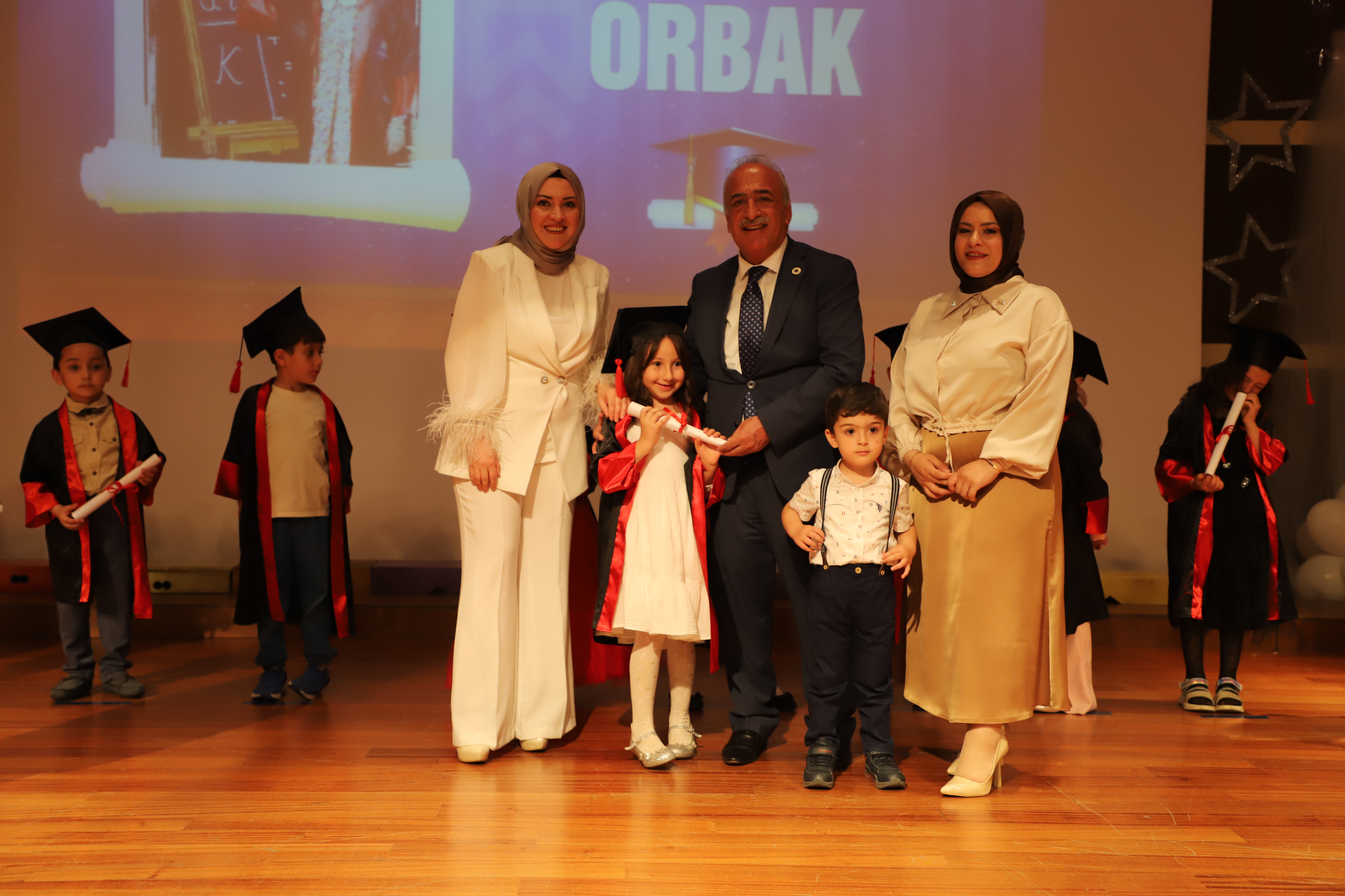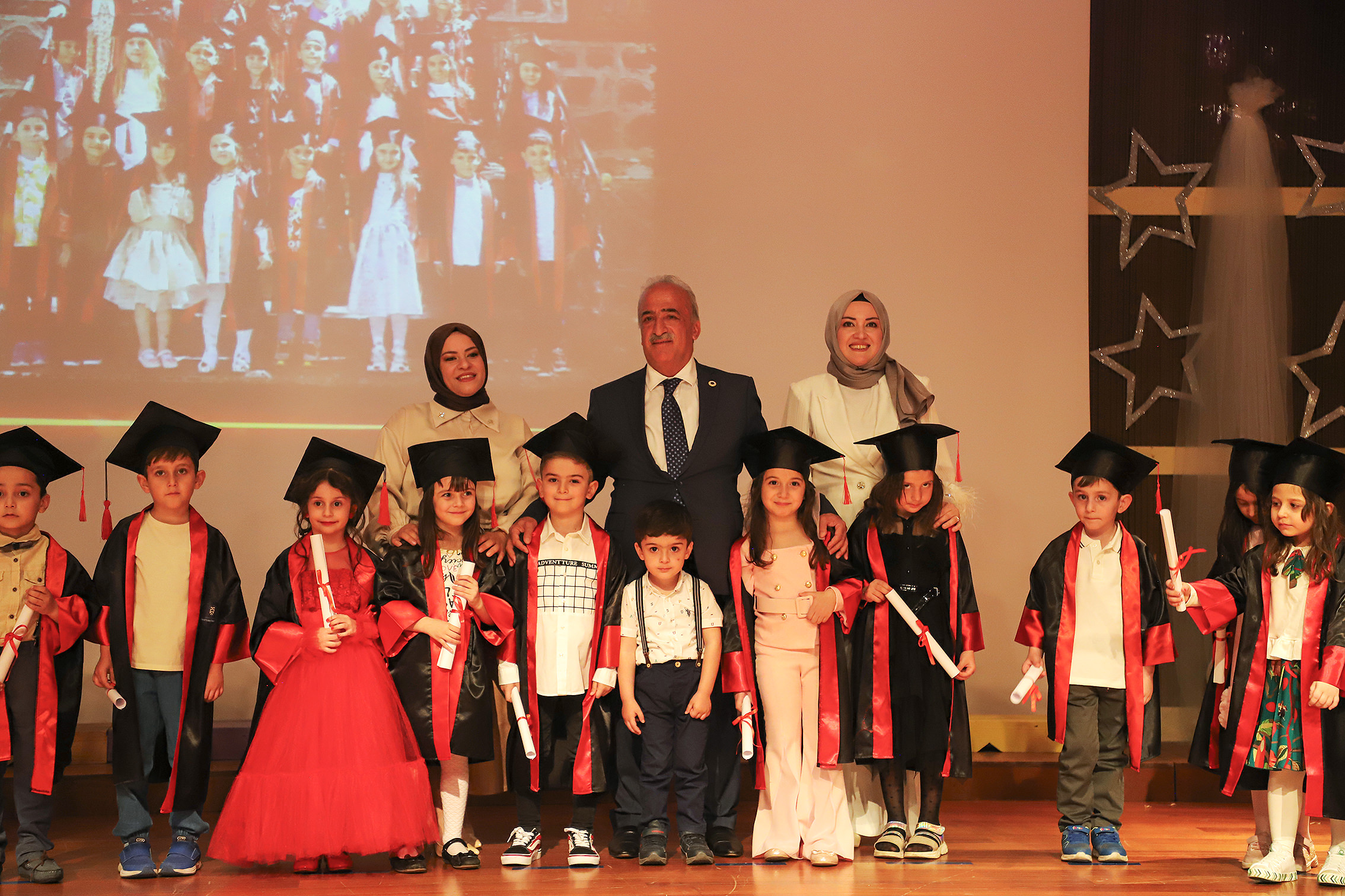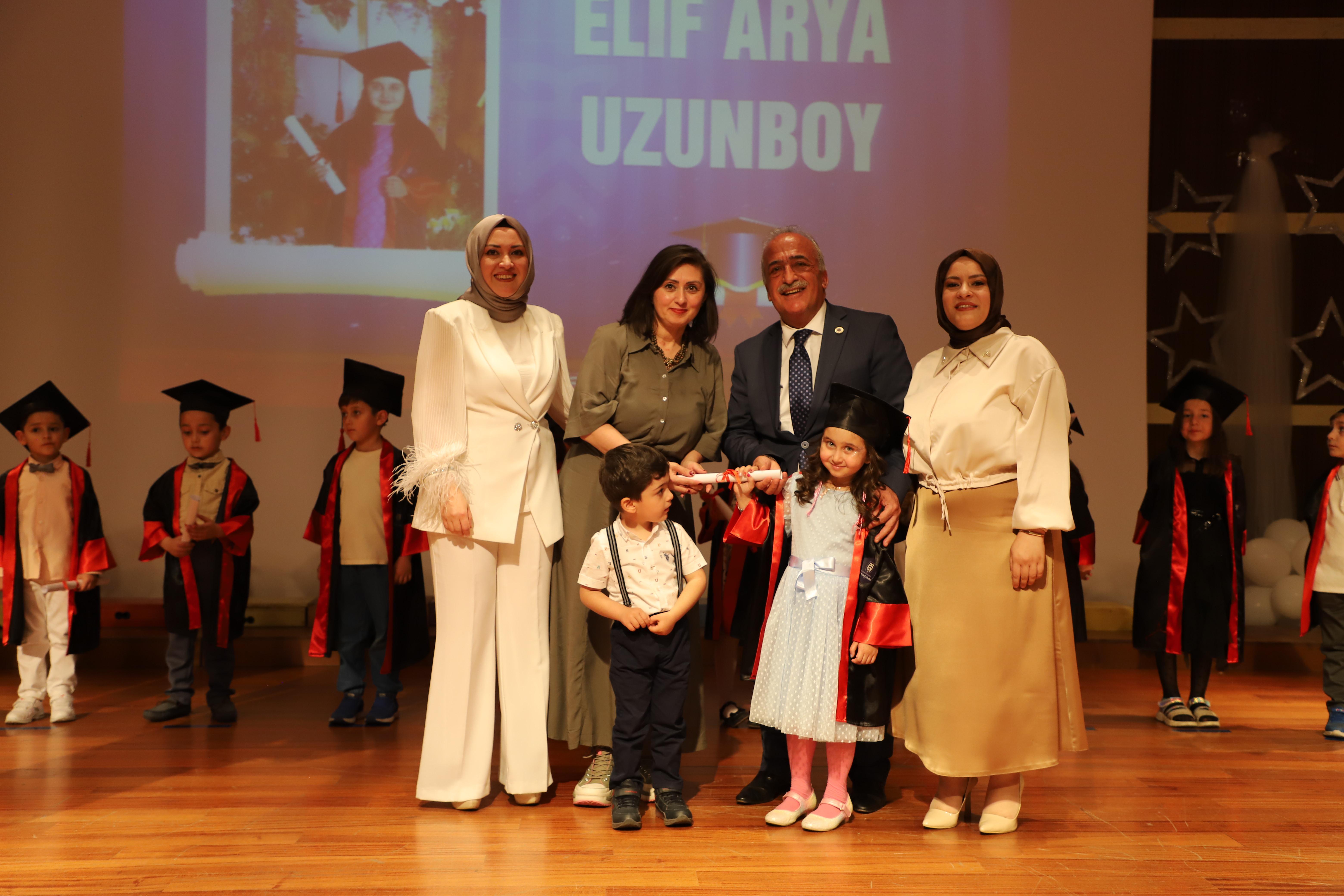 97 kindergarten students received their graduation diplomas from Rector Çomaklı during the event that took place at the Nenehatun Cultural Center, which was characterized by emotive moments. The program was attended by school principals, administrators, instructors, and parents, as well as the General Manager of Private Foundation Schools, Erdal Karagülle.