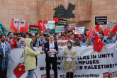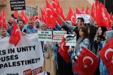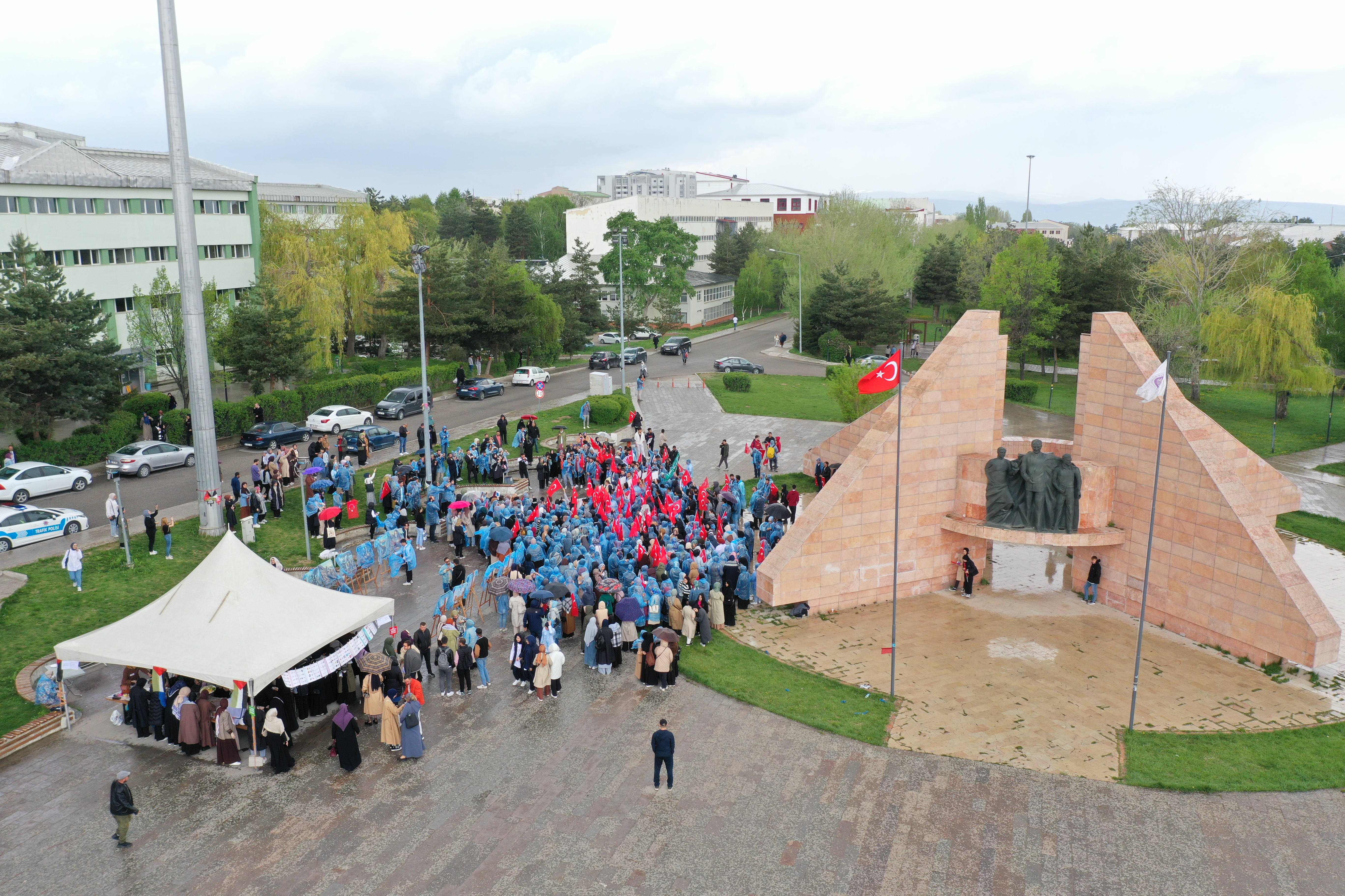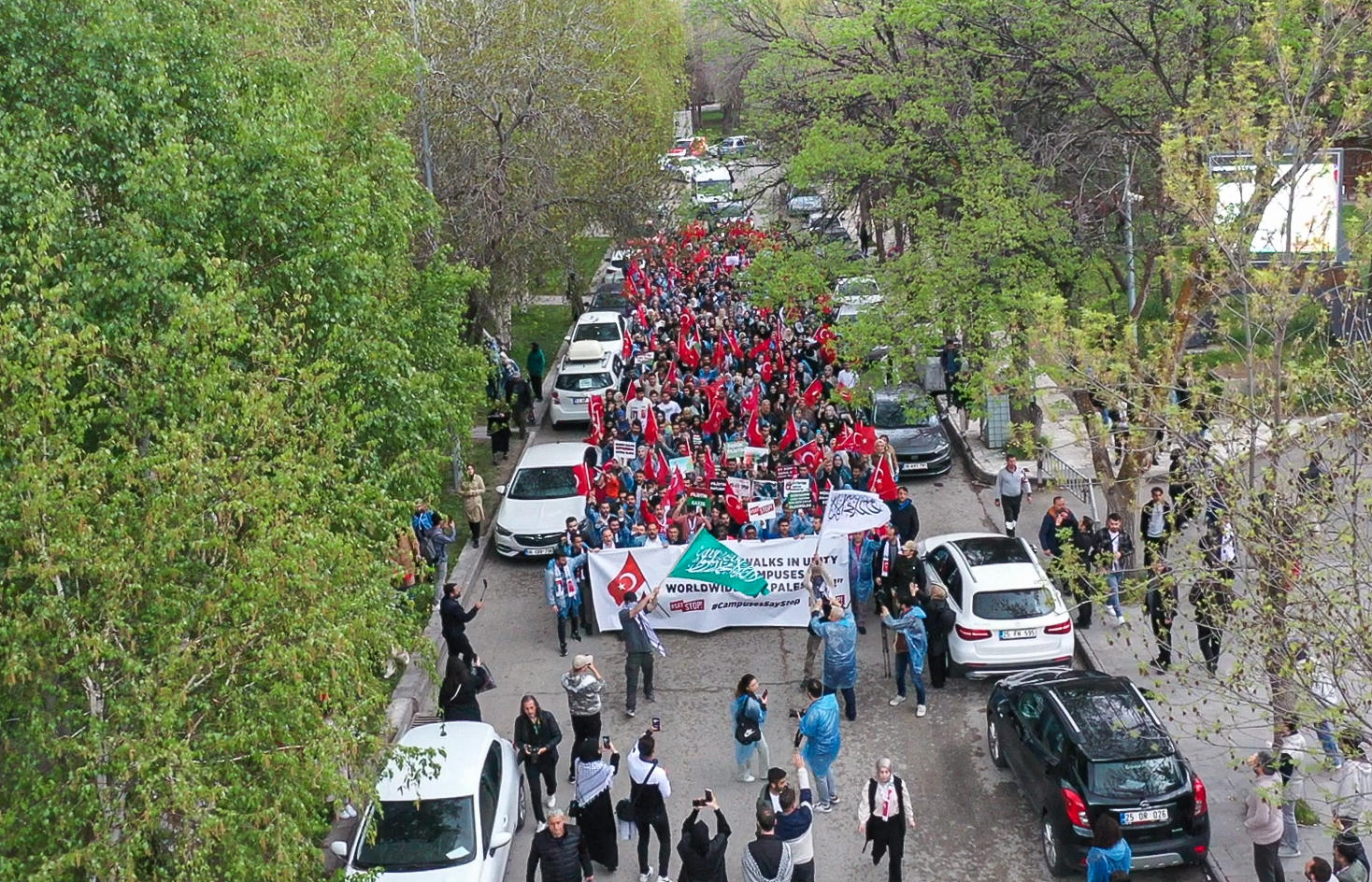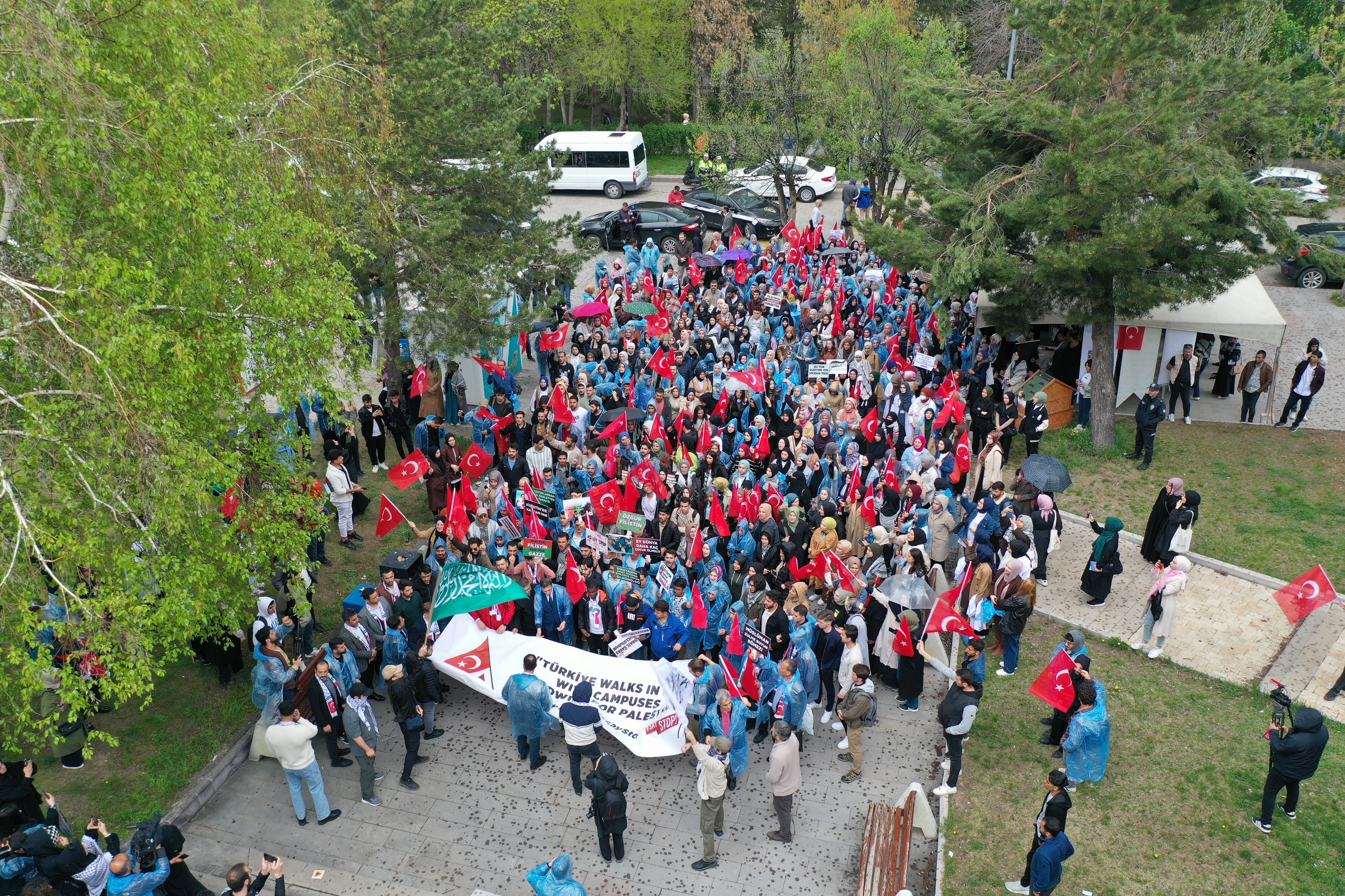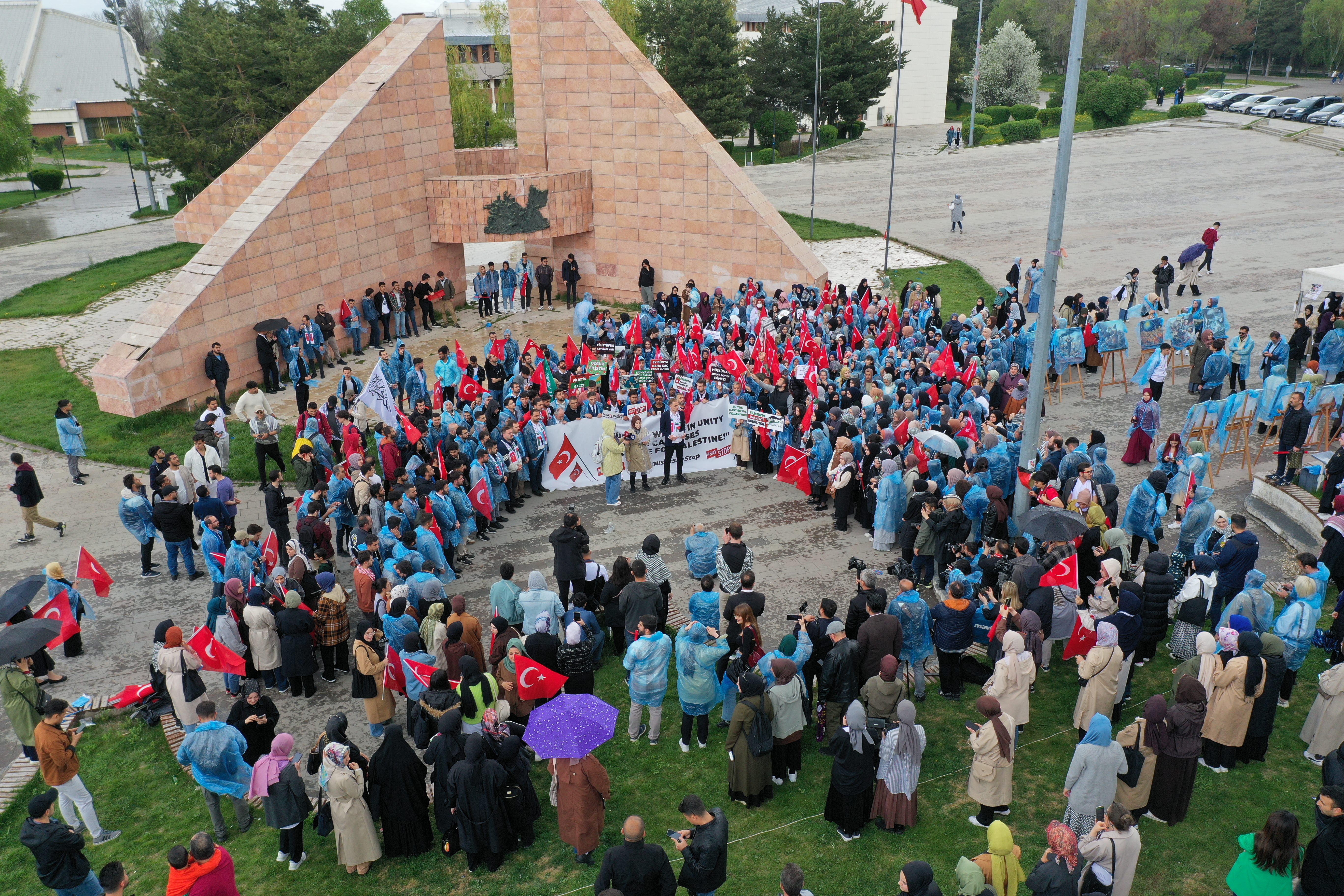 Student organizations and clubs at Atatürk University collaborated to coordinate a march in support of Palestine. The press was prepared on behalf of the group to cover the event that was held in front of the Atatürk Youth and Science Monument and featured signs and banners bearing the following inscriptions: "We are for children and justice," "Israel is the fingerprint of the murderer in Palestine," "Muslims do not submit to oppression," and "A massacre is occurring in Palestine."
