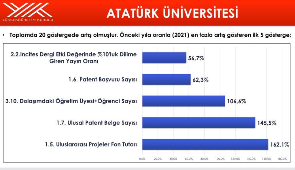 The yearly performance ranking of universities is structured into three distinct categories: A1, A2, and A3. Atatürk University, which occupied the A3 position in the 2021 performance ranking, maintained its commendable run by securing an A2 position in the subsequent performance evaluation utilising performance indicators. Atatürk University, which has increased in a total of 20 indicators, particularly the Rate of Publications Entering the 10th Percentile in Incities Journal Impact Value, Number of Patent Applications, Number of Faculty Members + Students in Circulation, Number of International Patent Documents, and International Projects Funding Amount, has maintained its success in the top five indicators with the greatest increase compared to the previous year.
