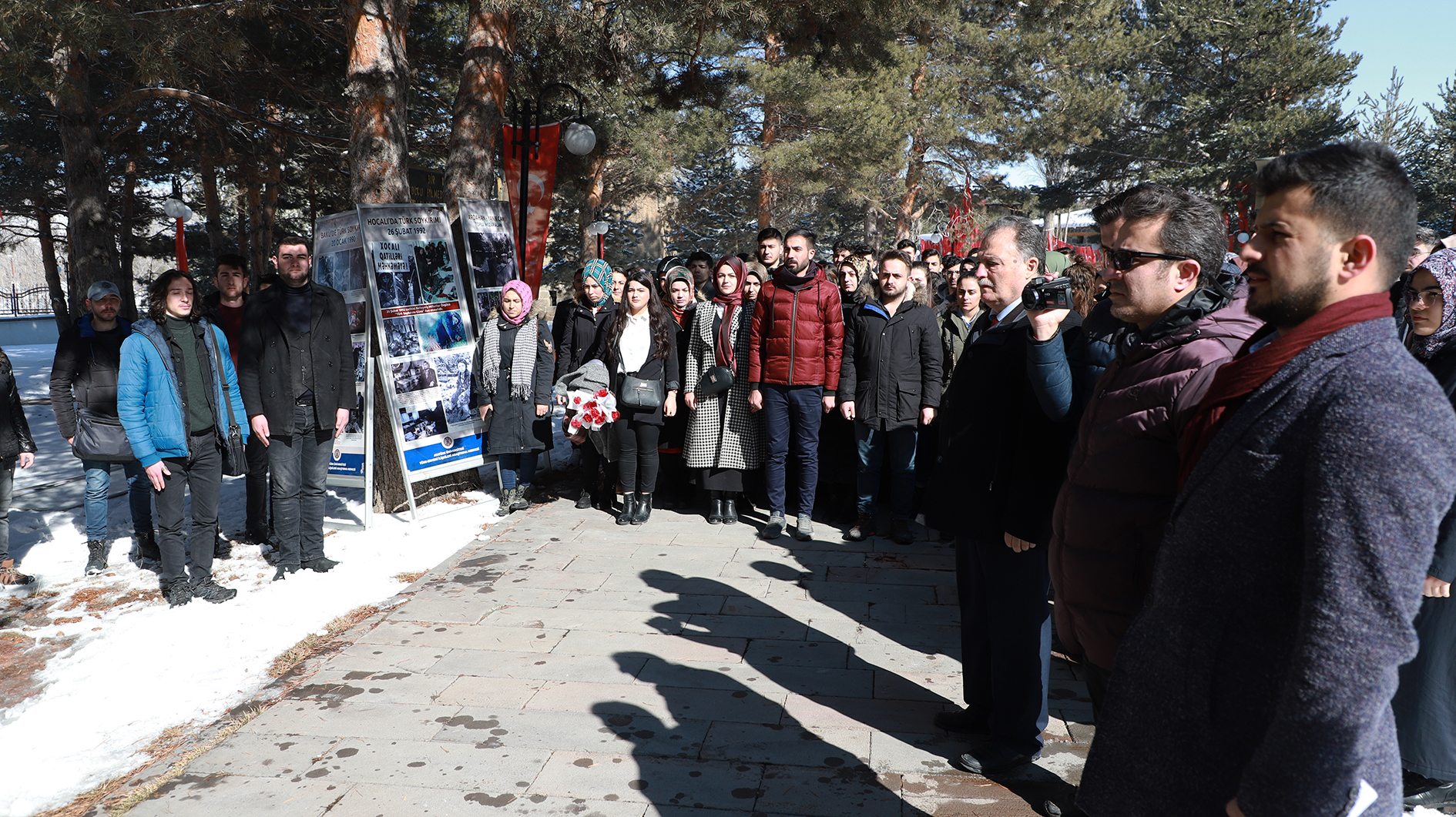 Turkish-Armenian Relations Research Center Director Professor Dr. Erol Kürkçüoğlu, Vice Dean of the Faculty of Letters, Assoc. Dr. Ali Yalçın Tavukçu Assistant Director of the Institute of Turkic Studies Assoc. Dr. Yasin Topaloğlu, academics and students attended at the commemoration ceremony held at the Kars Gate Martyrdom.