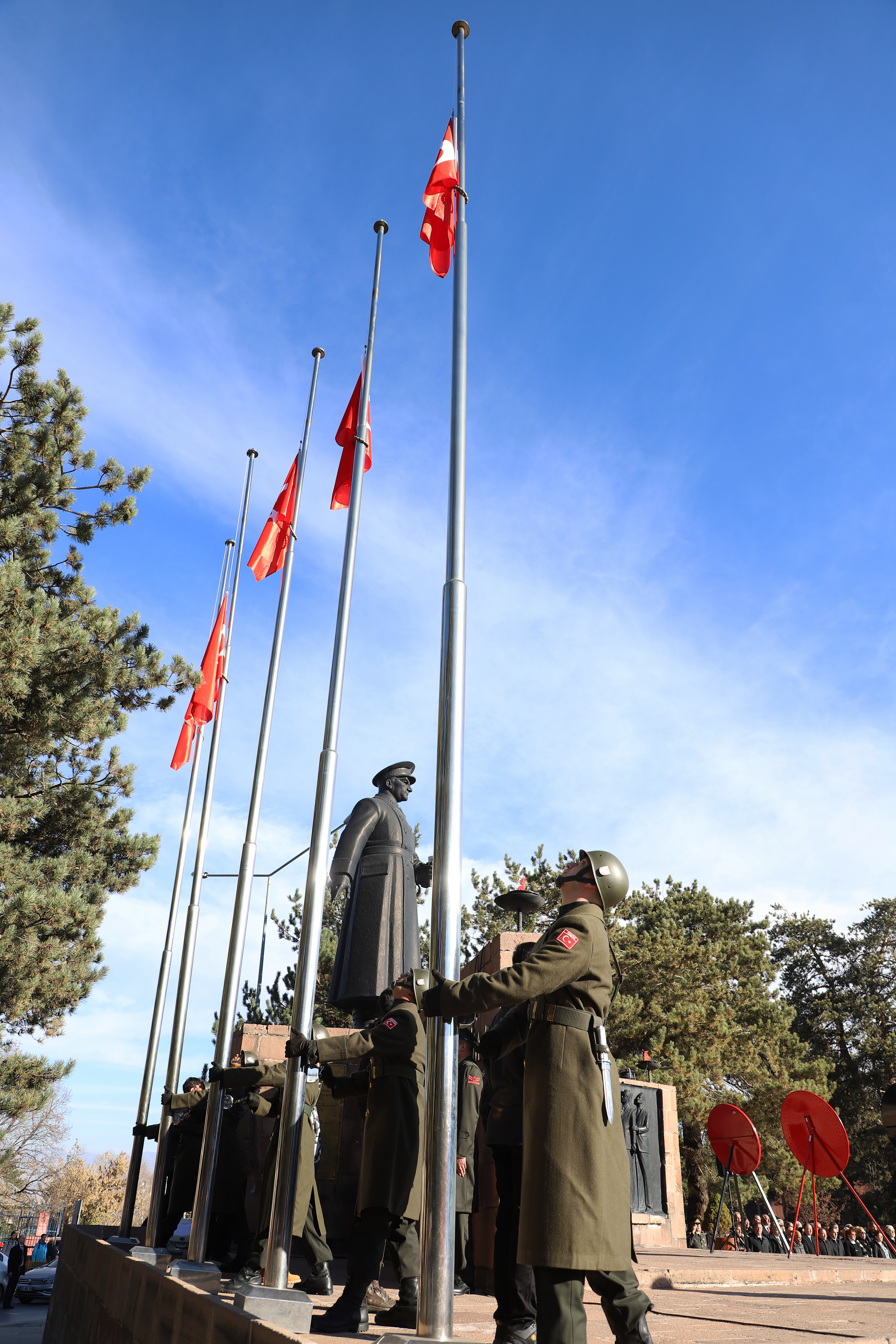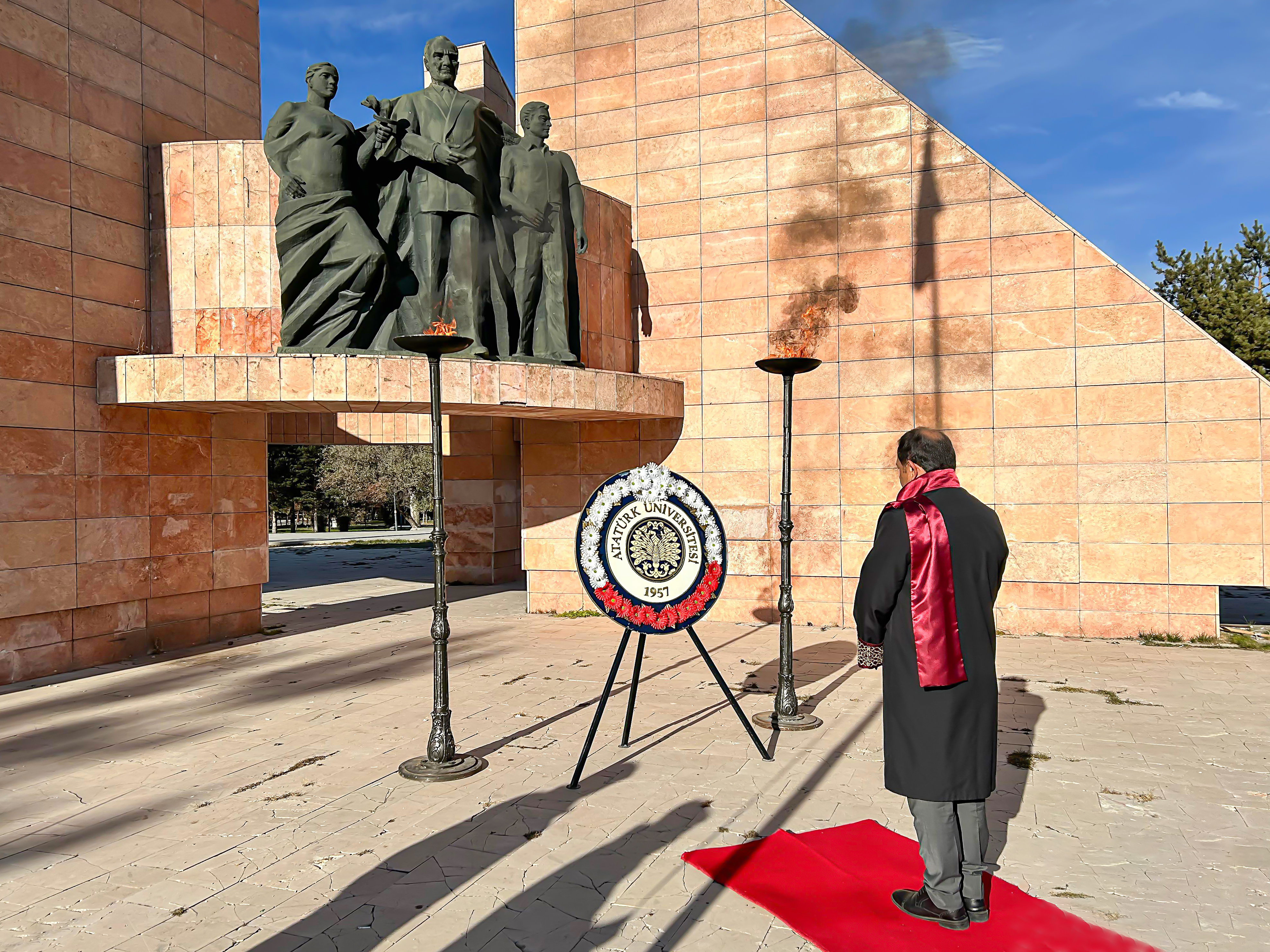 The 10 November Atatürk Commemoration Programme, which commenced with the presentation of wreaths to the Atatürk Monument at the Huvuzbaşı, was witnessed by Prof. Dr. Ahmet Hacımüftüoğlu, the Rector of Atatürk University. In the program, which was attended by state officials, a two-minute silence was observed at 9:5 a.m., followed by the sound of sirens. Subsequently, the flags were lowered to half-mast amid the national anthem.